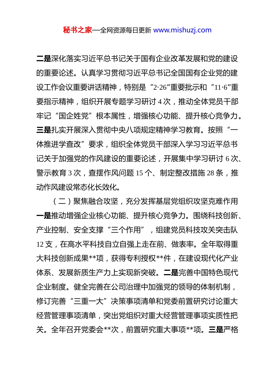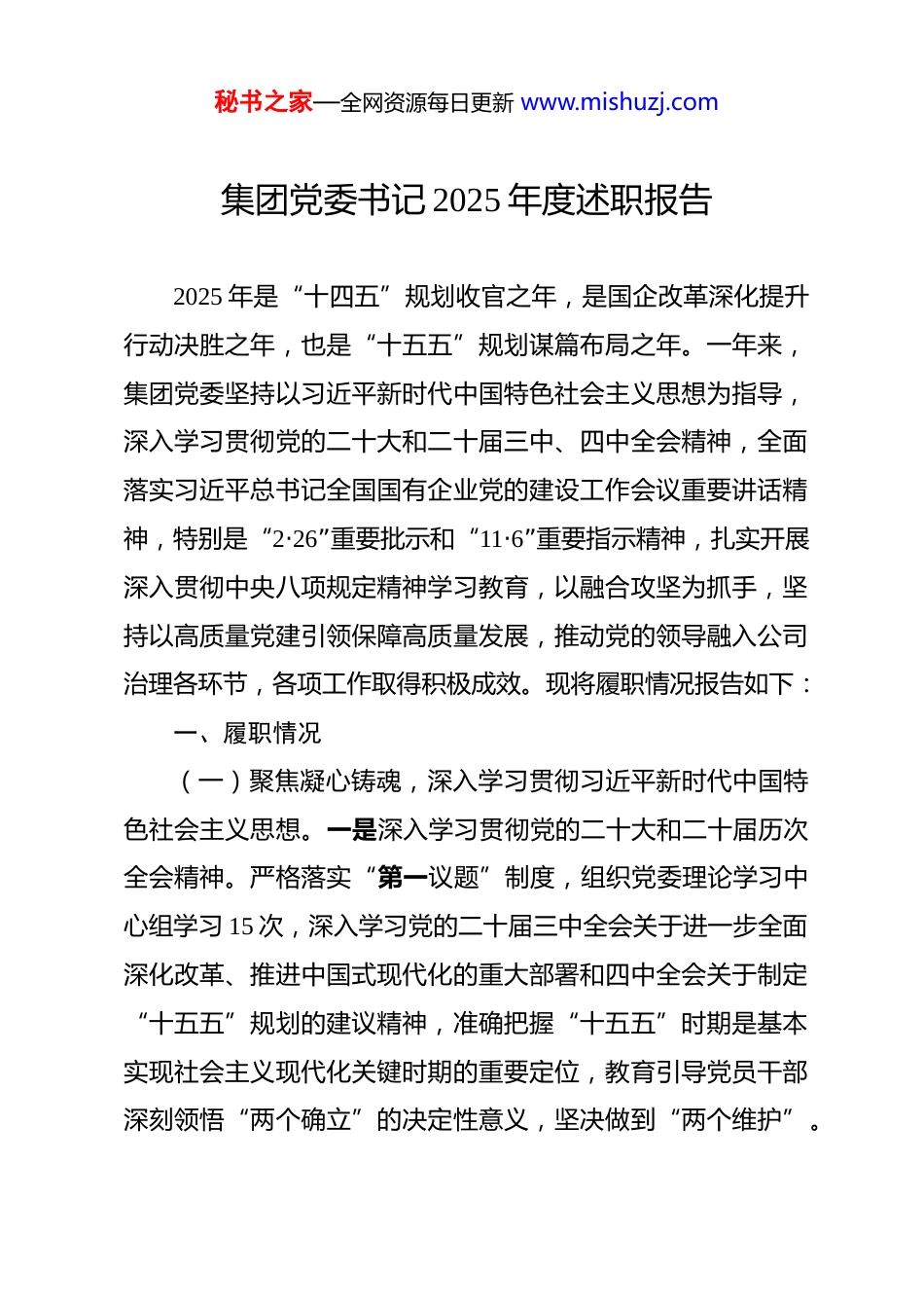 秘书之家—全网资源每日更新 www.mishuzj.com集团党委书记 2025 年度述职报告 2025 年是“十四五”规划收官之年,是国企改革深化提升行动决胜之年,也是“十五五”规划谋篇布局之年。一年来,集团党委坚持以习近平新时代中国特色社会主义思想为指导,深入学习贯彻党的二十大和二十届三中、四中全会精神,全面落实习近平总书记全国国有企业党的建设工作会议重要讲话精神,特别是“2·26”重要批示和“11·6”重要指示精神,扎实开展深入贯彻中央八项规定精神学习教育,以融合攻坚为抓手,坚持以高质量党建引领保障高质量发展,推动党的领导融入公司治理各环节,各项工作取得积极成效。现将履职情况报告如下:一、履职情况(一)聚焦凝心铸魂,深入学习贯彻习近平新时代中国特色社会主义思想。一是深入学习贯彻党的二十大和二十届历次全会精神。严格落实“第一议题”制度,组织党委理论学习中心组学习 15 次,深入学习党的二十届三中全会关于进一步全面深化改革、推进中国式现代化的重大部署和四中全会关于制定“十五五”规划的建议精神,准确把握“十五五”时期是基本实现社会主义现代化关键时期的重要定位,教育引导党员干部深刻领悟“两个确立”的决定性意义,坚决做到“两个维护”。秘书之家—全网资源每日更新 www.mishuzj.com二是深化落实习近平总书记关于国有企业改革发展和党的建设的重要论述。认真学习贯彻习近平总书记全国国有企业党的建设工作会议重要讲话精神,特别是“2·26”重要批示和“11·6”重要指示精神,组织开展专题学习研讨 4 次,推动全体党员干部牢记“国企姓党”根本属性,增强核心功能、提升核心竞争力。三是扎实开展深入贯彻中央八项规定精神学习教育。按照“一体推进学查改”要求,组织全体党员干部深入学习习近平总书记关于加强党的作风建设的重要论述,开展集中学习研讨 6 次、警示教育 3 次,查摆作风问题 15 个、制定整改措施 28 条,推动作风建设常态化长效化。(二)聚焦融合攻坚,充分发挥基层党组织攻坚克难作用一是推动增强企业核心功能、提升核心竞争力。围绕科技创新、产业控制、安全支撑“三个作用”,组建党员科技攻关突击队12 支,在高水平科技自立自强上走在前、做表率。全年取得重大科技创新成果**项,获得专利授权**件,在建设现代化产业体系、发展新质生产力上实现新突破。二是完善中国特色现代企业制度。健全完善在公司治理中加强党的领导的体制机制,修订完善“三重一大”决策事项清单和党委前置研究讨论重大经营管理事项清单,突出党组织对重大经营管理事项实质性把关。全年召开党委会**次,前置研究重大事项**项。三是严格秘书之家—全网资源每日更新 www.mishuzj.com落实基层党组织按期换届等制度。高质量完成**个基层党组织换届选举,实现应换尽换。加强混合所有制企业、金融企业、驻外机构、新设立新并购企业等党建工作,动态优化组织覆盖,实现“应建尽建”。深入推进党建联建,引导企业打破产权边界、资源共享,以党建链引领产业链供应链创新链融合发展。(三)聚焦队伍建设,充分发挥党员先锋模范作用。一是坚持用改革精神和严的标准推进党员队伍建设。认真贯彻《全国党员教育培训工作规划》,落实中央企业基本培训机制,全年组织党员教育培训**期,培训党员**人次。围绕深化改革、科技攻关、应急处突等融合攻坚任务,深化党员示范岗、党员责任区、党员突击队做法,设立党员先锋岗**个、党员责任区**个,组建党员突击队**支,在急难险重任务中充分彰显党员先锋本色。二是深化党员“揭榜挂帅”“赛马”等做法。围绕关键核心技术攻关、重大项目建设等重点任务,组织开展党员“揭榜挂帅”项目**个,党员“赛马”竞赛**场,激励党员在攻坚克难中担当作为、建功立业。三是提高发展党员质量,加强和改进流动党员管理。全年发展党员**名,坚持把政治标准放在首位,注重从生产经营一线、科技攻关骨干中发展党员。完善流动党员管理台账,落实“双向共管”机制,确保流动党员“离乡不离党、流动不流失”。推动党组织和党员在网络空秘书之家—全网资源每日更新 www.mishuzj.com间发挥作用,严肃稳妥处置不合格党...