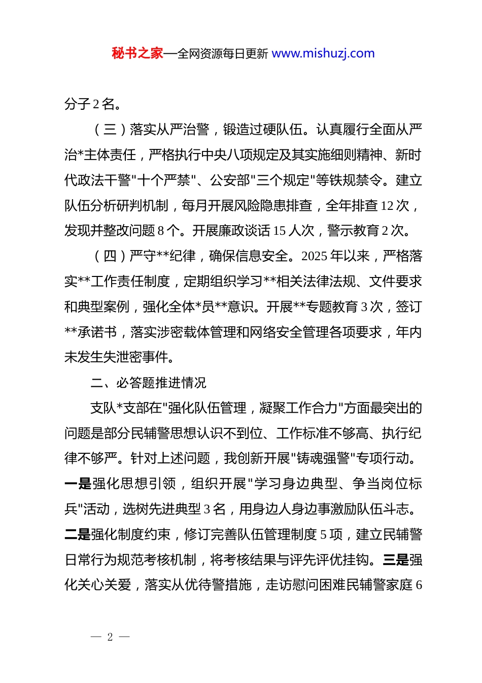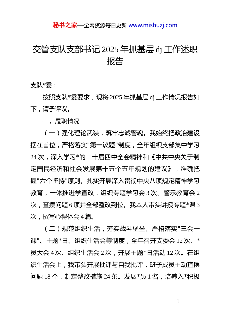 秘书之家—全网资源每日更新 www.mishuzj.com交管支队支部书记 2025 年抓基层 dj 工作述职报告支队*委:按照支队*委要求,现将 2025 年抓基层 dj 工作情况报告如下,请予评议。一、履职情况(一)强化理论武装,筑牢忠诚警魂。我始终把政治建设摆在首位,严格落实"第一议题"制度,全年组织支部集中学习24 次,深入学习*的二十届四中全会精神和《中共中央关于制定国民经济和社会发展第十五个五年规划的建议》,准确把握"六个坚持"原则。扎实开展深入贯彻中央八项规定精神学习教育,一体推进学查改,组织专题学习会 3 次、警示教育会 2次,查摆问题 6 项并全部整改到位。我本人带头讲授专题*课 3次,撰写心得体会 4 篇。(二)规范组织生活,夯实战斗堡垒。严格落实"三会一课"、主题*日、组织生活会等制度,全年召开支委会 12 次、*员大会 4 次、组织生活会 2 次,开展主题*日活动 12 次。在组织生活会上,我带头开展批评与自我批评,班子成员主动查摆问题 18 个,制定整改措施 24 条。发展*员 1 名,培养入*积极— 1 —秘书之家—全网资源每日更新 www.mishuzj.com分子 2 名。(三)落实从严治警,锻造过硬队伍。认真履行全面从严治*主体责任,严格执行中央八项规定及其实施细则精神、新时代政法干警"十个严禁"、公安部"三个规定"等铁规禁令。建立队伍分析研判机制,每月开展风险隐患排查,全年排查 12 次,发现并整改问题 8 个。开展廉政谈话 15 人次,警示教育 2 次。(四)严守**纪律,确保信息安全。2025 年以来,严格落实**工作责任制度,定期组织学习**相关法律法规、文件要求和典型案例,强化全体*员**意识。开展**专题教育 3 次,签订**承诺书,落实涉密载体管理和网络安全管理各项要求,年内未发生失泄密事件。二、必答题推进情况支队*支部在"强化队伍管理,凝聚工作合力"方面最突出的问题是部分民辅警思想认识不到位、工作标准不够高、执行纪律不够严。针对上述问题,我创新开展"铸魂强警"专项行动。一是强化思想引领,组织开展"学习身边典型、争当岗位标兵"活动,选树先进典型 3 名,用身边人身边事激励队伍斗志。二是强化制度约束,修订完善队伍管理制度 5 项,建立民辅警日常行为规范考核机制,将考核结果与评先评优挂钩。三是强化关心关爱,落实从优待警措施,走访慰问困难民辅警家庭 6— 2 —秘书之家—全网资源每日更新 www.mishuzj.com户,组织谠心谈话 28 人次,及时掌握思想动态、化解矛盾问题,队伍凝聚力战斗力明显提升。三、存在的问题及原因(一)理论学习不够深入系统。对**************思想的学习存在碎片化、浅尝辄止的问题,没有真正做到学懂弄通做实。对*的二十届四中全会关于"十五五"规划的新部署新要求理解不够深刻,对"六个坚持"原则的精神实质和实践要求把握不够准确,学用结合做得不够好,运用*的创新理论指导交通管理实践的能力有待提升。有时以工作忙、任务重为借口,挤占理论学习时间,存在"以干代学""学用脱节"的倾向,理论学习与实际工作"两张皮"现象仍然存在。对*员民警的理论学习抓得不够紧,督促检查不够经常,学习考核机制不够健全,部分*员学习主动性不强、参与度不高、收获不明显。对深入贯彻中央八项规定精神学习教育的重要性认识还不够到位,一体推进学查改的力度还不够大,学习教育成果的巩固拓展还需持续用力,推动中央八项规定精神内化于心、外化于行的自觉性还需进一步增强。(二)dj 业务融合不够紧密。存在"就 dj 抓 dj"的倾向,dj工作与道路交通管理业务结合不够紧密,融合发展的文章做得不够好,以高质量 dj 引领高质量发展的成效还不够明显。在组— 3 —秘书之家—全网资源每日更新 www.mishuzj.com织生活中,研究业务工作多、研究 dj 工作少,把 dj 工作当作"软任务"、"副业",抓 dj 的精力投入不够。对 dj 品牌创建重视不够,没有形成具有交警特色、可复制可推广的 dj 工作亮点和经验做法。*员先锋模范作用发挥不够充分,在事故预防"减量控大"、交通秩序整治、重大安保维稳等急难险重任务中冲锋在前的意识还需进一步增强,"我是*员我先行"...