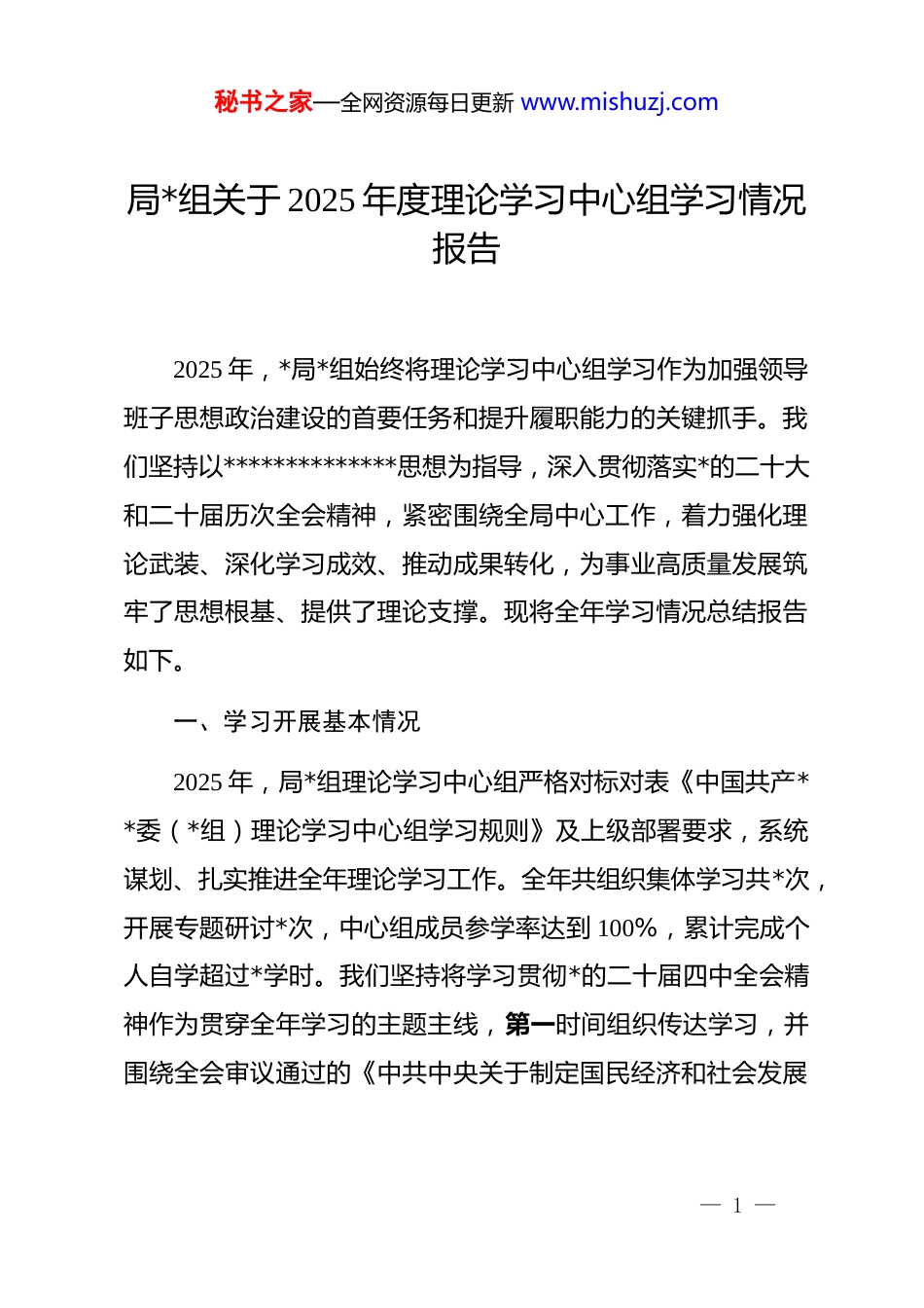 秘书之家—全网资源每日更新 www.mishuzj.com局*组关于 2025 年度理论学习中心组学习情况报告2025 年,*局*组始终将理论学习中心组学习作为加强领导班子思想政治建设的首要任务和提升履职能力的关键抓手。我们坚持以**************思想为指导,深入贯彻落实*的二十大和二十届历次全会精神,紧密围绕全局中心工作,着力强化理论武装、深化学习成效、推动成果转化,为事业高质量发展筑牢了思想根基、提供了理论支撑。现将全年学习情况总结报告如下。一、学习开展基本情况2025 年,局*组理论学习中心组严格对标对表《中国共产**委(*组)理论学习中心组学习规则》及上级部署要求,系统谋划、扎实推进全年理论学习工作。全年共组织集体学习共*次,开展专题研讨*次,中心组成员参学率达到 100%,累计完成个人自学超过*学时。我们坚持将学习贯彻*的二十届四中全会精神作为贯穿全年学习的主题主线,第一时间组织传达学习,并围绕全会审议通过的《中共中央关于制定国民经济和社会发展— 1 —秘书之家—全网资源每日更新 www.mishuzj.com第十五个五年规划的建议》开展深入研讨,深刻领会其核心要义与实践要求。通过建立“年度有计划、月度有安排、学习有记录、研讨有材料”的规范化机制,确保了学习的系统性、连续性与实效性,领导班子的政治判断力、政治领悟力、政治执行力得到显著增强。二、主要做法与成效(一)聚焦政治引领,在筑牢思想根基上彰显高度。我们始终坚持把*的政治建设摆在首位,确保理论学习正确方向。一是严格落实“第一议题”制度。将学习**************思想、******最新重要讲话和****批示精神作为每次中心组学习的首要内容,构建“传达学习、研究部署、贯彻落实、督查问效”的闭环管理机制。年内开展“第一议题”学习*次,学习内容*项,确保*中央精神和上级决策部署得到及时、准确、彻底的贯彻执行。二是深化*的创新理论体系化学习。以学习领会*的二十届四中全会精神为重点,深刻把握其作为现代化征程承前启后关键会议的重大意义。我们不仅组织原原本本学《建议》原文,还邀请专家学者作专题辅导报告*场,编印专题学习资料*期,引导中心组成员从历史、理论、实践多个维度,深刻理解中国式现代化理论体系的丰富发展与开创中国式现代化新局面的行— 2 —秘书之家—全网资源每日更新 www.mishuzj.com动纲领。三是强化理想信念与*性教育。将理论学习与深化 dj学习教育、深入贯彻中央八项规定精神学习教育紧密结合。通过赴红色教育基地开展现场教学、召开警示教育会、学习典型案例等方式,教育引导领导干部锤炼*性、提高觉悟,不断增强“四个意识”、坚定“四个自信”、做到“两个维护”的政治自觉。(二)创新机制载体,在提升学习质效上挖掘深度。我们致力于破解学习形式单一、学用脱节等难题,推动学习从“规范开展”向“提质增效”跃升。一是构建“六学联动”模式。积极探索并实践“领导带头学、研讨交流学、实地调研学、专题辅导学、线上线下同步学、联动共建学”的多元化学习模式。中心组成员带头撰写心得体会、调研报告*篇,参与各类现场教学与实地调研*次,利用“学习强国”等平台线上学习累计*人次,有效激发了学习内生动力。二是建立“列席旁听”督导机制。参照先进经验,组建由专家、骨干构成的列席旁听工作组,按照“会前审方案、会中看实效、会后提建议”的程序,对下属单位*委(*组)理论学习中心组学习开展全覆盖旁听指导*场次。通过现场点评、反馈整改,有效传导压力,提升了全系统理论学习的规范化水平。三是打造“开放式”“融合式”学习— 3 —秘书之家—全网资源每日更新 www.mishuzj.com平台。突破传统课堂限制,将学习现场搬到工作一线、实践基地,开展情景式、沉浸式学习。围绕重大主题,探索“现场调研+理论研讨+工作部署”的“三位一体”学习模式,使学习研讨直接服务于科学决策,形成了理论到实践的完整闭环。(三)围绕中心工作,在推动学用转化上加大力度。我们大力弘扬理论联系实际的马克思主义学风,坚持学思用贯通、知信行统一。一是开展“课题式”研讨破解发展难题。每次集中学习前,结合全局年度重点任务和改革发展瓶颈,...