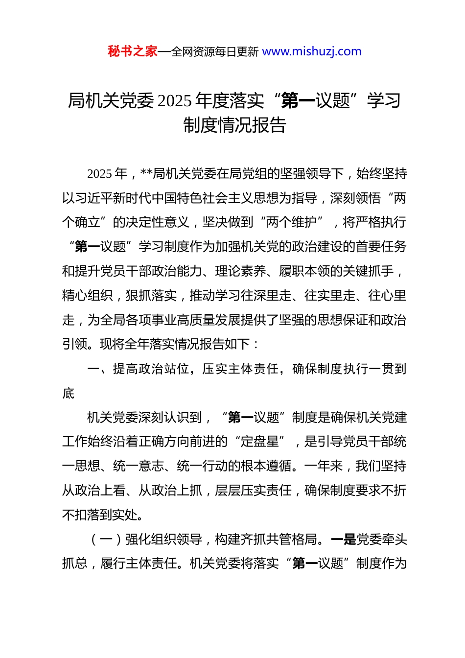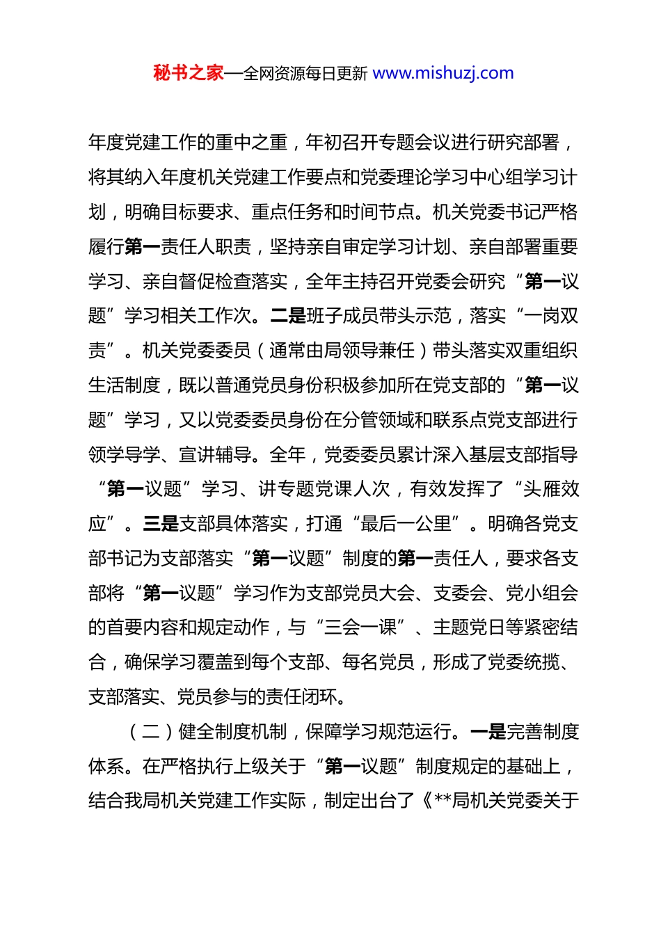 秘书之家—全网资源每日更新 www.mishuzj.com局机关党委 2025 年度落实“第一议题”学习制度情况报告 2025 年,**局机关党委在局党组的坚强领导下,始终坚持以习近平新时代中国特色社会主义思想为指导,深刻领悟“两个确立”的决定性意义,坚决做到“两个维护”,将严格执行“第一议题”学习制度作为加强机关党的政治建设的首要任务和提升党员干部政治能力、理论素养、履职本领的关键抓手,精心组织,狠抓落实,推动学习往深里走、往实里走、往心里走,为全局各项事业高质量发展提供了坚强的思想保证和政治引领。现将全年落实情况报告如下:一、提高政治站位,压实主体责任,确保制度执行一贯到底机关党委深刻认识到,“第一议题”制度是确保机关党建工作始终沿着正确方向前进的“定盘星”,是引导党员干部统一思想、统一意志、统一行动的根本遵循。一年来,我们坚持从政治上看、从政治上抓,层层压实责任,确保制度要求不折不扣落到实处。(一)强化组织领导,构建齐抓共管格局。一是党委牵头抓总,履行主体责任。机关党委将落实“第一议题”制度作为秘书之家—全网资源每日更新 www.mishuzj.com年度党建工作的重中之重,年初召开专题会议进行研究部署,将其纳入年度机关党建工作要点和党委理论学习中心组学习计划,明确目标要求、重点任务和时间节点。机关党委书记严格履行第一责任人职责,坚持亲自审定学习计划、亲自部署重要学习、亲自督促检查落实,全年主持召开党委会研究“第一议题”学习相关工作次。二是班子成员带头示范,落实“一岗双责”。机关党委委员(通常由局领导兼任)带头落实双重组织生活制度,既以普通党员身份积极参加所在党支部的“第一议题”学习,又以党委委员身份在分管领域和联系点党支部进行领学导学、宣讲辅导。全年,党委委员累计深入基层支部指导“第一议题”学习、讲专题党课人次,有效发挥了“头雁效应”。三是支部具体落实,打通“最后一公里”。明确各党支部书记为支部落实“第一议题”制度的第一责任人,要求各支部将“第一议题”学习作为支部党员大会、支委会、党小组会的首要内容和规定动作,与“三会一课”、主题党日等紧密结合,确保学习覆盖到每个支部、每名党员,形成了党委统揽、支部落实、党员参与的责任闭环。(二)健全制度机制,保障学习规范运行。一是完善制度体系。在严格执行上级关于“第一议题”制度规定的基础上,结合我局机关党建工作实际,制定出台了《**局机关党委关于秘书之家—全网资源每日更新 www.mishuzj.com进一步规范和落实“第一议题”学习制度的实施意见》,对学习内容的遴选、学习计划的制定、学习流程的组织、研讨交流的开展、学习成果的转化以及记录归档等各环节作出明确规定,为制度规范运行提供了清晰的“路线图”和“操作手册”。二是优化学习流程。建立“会前预告-会中领学研讨-会后督办落实”的标准化流程。会前,机关党委办公室(或指定部门)根据上级精神和形势任务需要,提前个工作日筛选确定学习内容,并连同相关背景资料、思考题等一并发送至各支部和党员;会中,由支部书记或指定委员领学,并组织党员围绕主题,结合思想和工作实际开展深入研讨;会后,各支部及时梳理学习要点、研讨成果和形成的共识,对于需要贯彻落实的事项,建立台账,明确责任人和时限,确保学有所思、学有所获、学有所用。三是规范记录管理。统一设计印制了《“第一议题”学习记录本》,要求各支部详细记录每次学习的时间、地点、参会人员、学习内容、领学人、研讨发言要点、形成的决议或落实措施等,做到要素齐全、记录规范。机关党委定期对各支部学习记录情况进行抽查,并将其作为支部评优评先的重要依据。(三)强化督导考评,推动压力有效传导。一是纳入考核体系。将“第一议题”制度落实情况作为机关党建年度考核的核心指标,在党支部书记抓党建工作述职评议考核中单列项目、秘书之家—全网资源每日更新 www.mishuzj.com重点评议,并与支部评星定级、民主评议党员等紧密挂钩,切实发挥考核“指挥棒”作用。二是开展常态督查。建立机关党委委员联系指导支部制度,每位委员固定联系个支部,通过列席支部学习会议、...