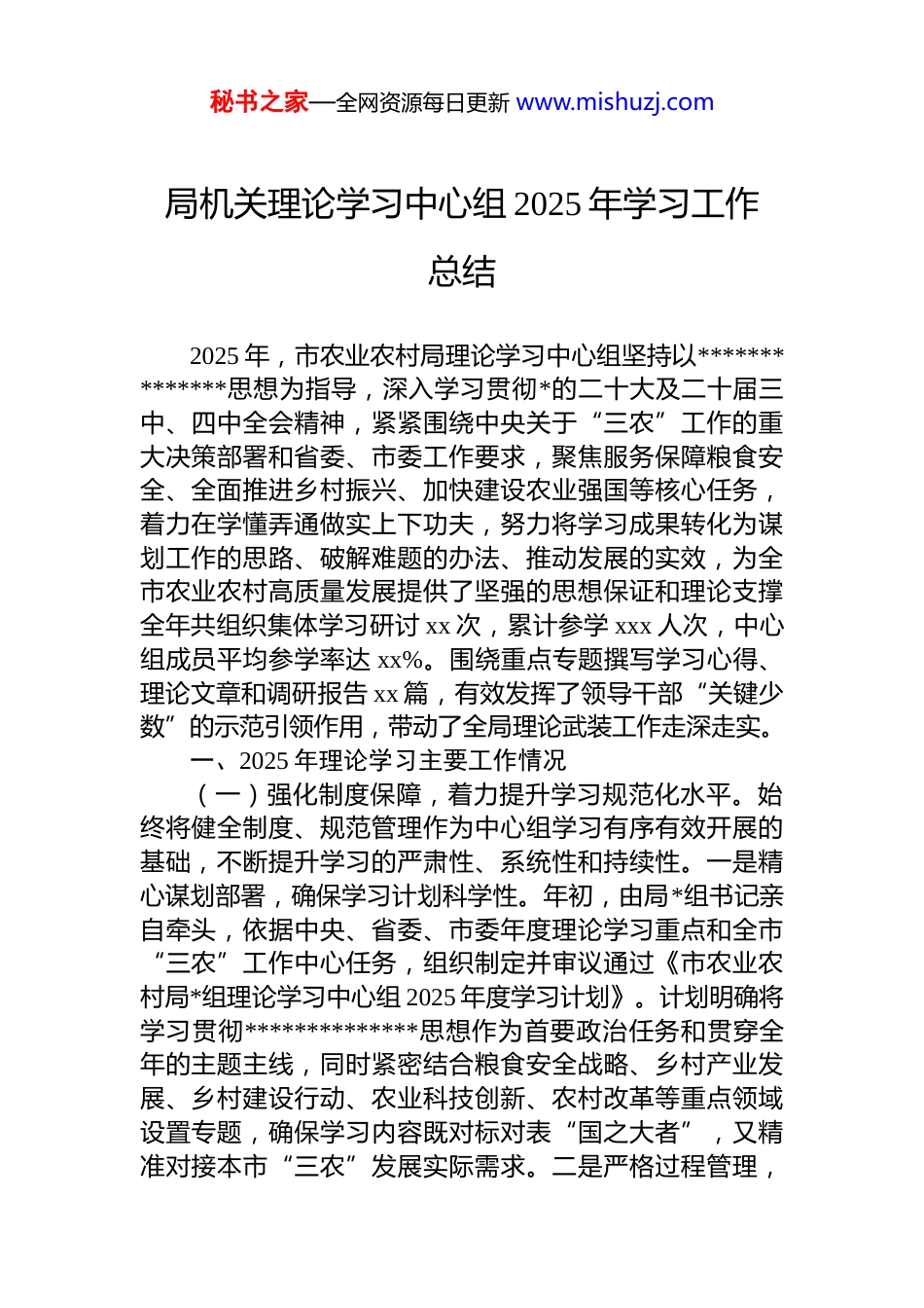 秘书之家—全网资源每日更新 www.mishuzj.com局机关理论学习中心组 2025 年学习工作总结 2025 年,市农业农村局理论学习中心组坚持以**************思想为指导,深入学习贯彻*的二十大及二十届三中、四中全会精神,紧紧围绕中央关于“三农”工作的重大决策部署和省委、市委工作要求,聚焦服务保障粮食安全、全面推进乡村振兴、加快建设农业强国等核心任务,着力在学懂弄通做实上下功夫,努力将学习成果转化为谋划工作的思路、破解难题的办法、推动发展的实效,为全市农业农村高质量发展提供了坚强的思想保证和理论支撑全年共组织集体学习研讨 xx 次,累计参学 xxx 人次,中心组成员平均参学率达 xx%。围绕重点专题撰写学习心得、理论文章和调研报告 xx 篇,有效发挥了领导干部“关键少数”的示范引领作用,带动了全局理论武装工作走深走实。一、2025 年理论学习主要工作情况(一)强化制度保障,着力提升学习规范化水平。始终将健全制度、规范管理作为中心组学习有序有效开展的基础,不断提升学习的严肃性、系统性和持续性。一是精心谋划部署,确保学习计划科学性。年初,由局*组书记亲自牵头,依据中央、省委、市委年度理论学习重点和全市“三农”工作中心任务,组织制定并审议通过《市农业农村局*组理论学习中心组 2025 年度学习计划》。计划明确将学习贯彻**************思想作为首要政治任务和贯穿全年的主题主线,同时紧密结合粮食安全战略、乡村产业发展、乡村建设行动、农业科技创新、农村改革等重点领域设置专题,确保学习内容既对标对表“国之大者”,又精准对接本市“三农”发展实际需求。二是严格过程管理,秘书之家—全网资源每日更新 www.mishuzj.com确保学习运行规范性。严格执行中心组学习考勤、请假补学、学习记录、档案管理等制度。每次集体学习前均制定详细方案,明确学习主题、领学人员、重点发言人、研讨方向和参考资料。全年学习签到记录完整规范,对因公务等原因缺席的成员,均按要求及时安排补学并审核补学效果,确保学习全覆盖、无遗漏。三是压实主体责任,确保示范引领实效性。局*组书记认真履行中心组学习第一责任人职责,亲自审定学习方案,带头领学重要篇目,带头交流心得体会,带头深入基层调研宣讲。其他中心组成员严格落实“一岗双责”,将抓好分管领域理论学习与业务工作同谋划、同部署、同检查。形成了主要领导亲自抓、分管领导具体抓、班子成员合力抓,一级抓一级、层层抓落实的良好学习格局。(二)聚焦核心内容,着力把准政治理论方向。坚持把学习*的创新理论作为重中之重,及时跟进学习******最新重要讲话和指示批示精神,确保学习内容始终紧跟*的理论创新步伐、紧扣农业农村发展时代脉搏。一是紧跟核心要义,做到及时学、跟进学。建立健全“第一议题”制度对******最新发表的重要讲话、作出的****批示,特别是关于“三农”工作的重要论述,均在第一时间组织传达学习,深入领会其核心要义、精神实质、丰富内涵和实践要求。全年围绕******在中央农村工作会议、国家粮食安全战略部署、科技强国建设、生态文明建设等方面的重要讲话精神,组织专题学习 x 次,切实把思想和行动统一到*中央决策部署上来。二是聚焦战略部署,做到系统学、深入学。将深入学习贯彻*的二十大精神和*的二十届四中全会精神作为年度学习的核心内容。原原本本、逐字逐句学习全会公报、《中共中央关于制定国民经济和社会发展第十五个五年规划的建议》及******就《建议(讨论稿)》所作的说明。结合我市农业农村发展实际,组织开展了 x 次“学习贯彻四中全会精神,谋划农业农村现代化新篇章”秘书之家—全网资源每日更新 www.mishuzj.com专题研讨。班子成员深入思考“十五五”时期农业农村发展的机遇挑战,围绕如何将国家宏观战略转化为我市保障粮食安全、推进乡村全面振兴、促进农民增收致富的具体路径和项目抓手,提出了 xx 余条建设性意见,为科学编制我市相关规划提供了重要参考。三是紧扣主责主业,做到结合学、融合学。大力弘扬理论联系实际的马克思主义学风,紧密围绕市委、市政府中心工作和局年度重点任务设置学习专题。例如,在学习中央一号...