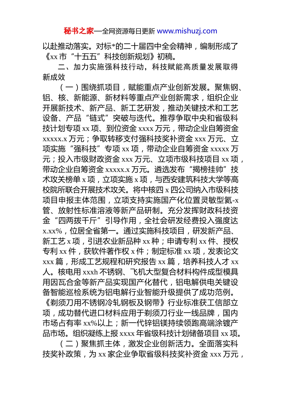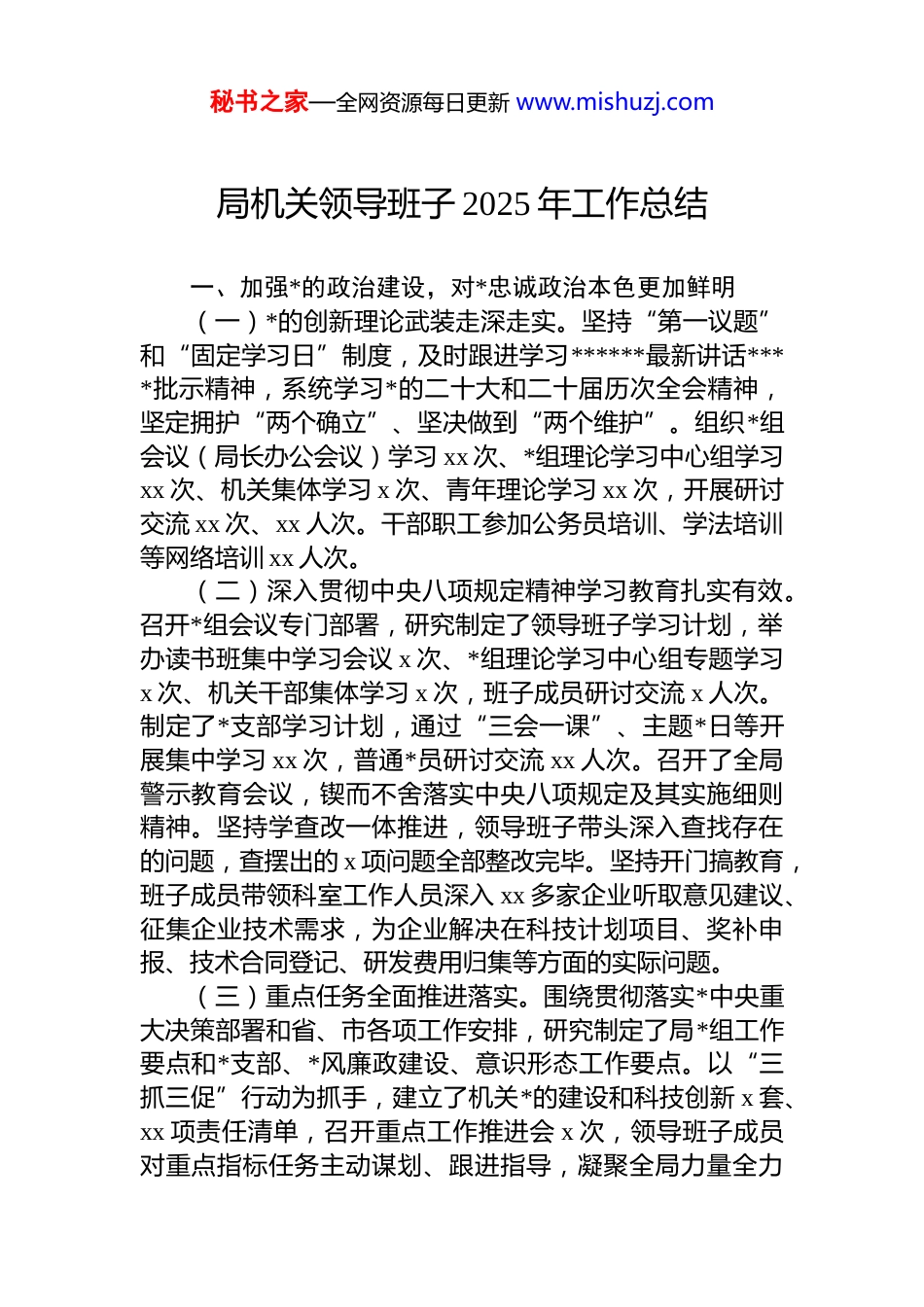 秘书之家—全网资源每日更新 www.mishuzj.com局机关领导班子 2025 年工作总结一、加强*的政治建设,对*忠诚政治本色更加鲜明(一)*的创新理论武装走深走实。坚持“第一议题”和“固定学习日”制度,及时跟进学习******最新讲话****批示精神,系统学习*的二十大和二十届历次全会精神,坚定拥护“两个确立”、坚决做到“两个维护”。组织*组会议(局长办公会议)学习 xx 次、*组理论学习中心组学习xx 次、机关集体学习 x 次、青年理论学习 xx 次,开展研讨交流 xx 次、xx 人次。干部职工参加公务员培训、学法培训等网络培训 xx 人次。(二)深入贯彻中央八项规定精神学习教育扎实有效。召开*组会议专门部署,研究制定了领导班子学习计划,举办读书班集中学习会议 x 次、*组理论学习中心组专题学习x 次、机关干部集体学习 x 次,班子成员研讨交流 x 人次。制定了*支部学习计划,通过“三会一课”、主题*日等开展集中学习 xx 次,普通*员研讨交流 xx 人次。召开了全局警示教育会议,锲而不舍落实中央八项规定及其实施细则精神。坚持学查改一体推进,领导班子带头深入查找存在的问题,查摆出的 x 项问题全部整改完毕。坚持开门搞教育,班子成员带领科室工作人员深入 xx 多家企业听取意见建议、征集企业技术需求,为企业解决在科技计划项目、奖补申报、技术合同登记、研发费用归集等方面的实际问题。(三)重点任务全面推进落实。围绕贯彻落实*中央重大决策部署和省、市各项工作安排,研究制定了局*组工作要点和*支部、*风廉政建设、意识形态工作要点。以“三抓三促”行动为抓手,建立了机关*的建设和科技创新 x 套、xx 项责任清单,召开重点工作推进会 x 次,领导班子成员对重点指标任务主动谋划、跟进指导,凝聚全局力量全力秘书之家—全网资源每日更新 www.mishuzj.com以赴推动落实。对标*的二十届四中全会精神,编制形成了《xx 市“十五五”科技创新规划》初稿。二、加力实施强科技行动,科技赋能高质量发展取得新成效(一)围绕抓项目,赋能重点产业创新发展。聚焦钢、铝、核、新能源、新材料等重点产业创新需求,组织企业开展新技术、新产品、新工艺研发,推动关键技术和工艺设备、产品“链式”突破与迭代。推荐争取中央和省级科技计划专项 xx 项、到位资金 xxxx 万元,带动企业自筹资金xxxxx.x 万元;争取转移支付强科技奖补资金 xxx 万元、立项实施“强科技”专项 xx 项,带动企业自筹资金 xxxxx 万元;投入市级财政资金 xxx 万元、立项市级科技项目 xx 项,带动企业自筹资金 xxxxx.x 万元。遴选发布“揭榜挂帅”技术攻关榜单 x 项,立项实施 x 项,与西安建筑科技大学等高校院所联合开展技术攻关。将中核四 x 四公司纳入市级科技项目申报主体范围,立项支持实施国产化位置灵敏型氦-x管、放射性标准溶液等新产品研制。充分发挥财政科技资金“四两拨千斤”引导作用,全社会研发经费投入强度达x.xx%,位居全省第一。通过实施科技项目,研发新产品、新工艺 x 项,引进农业新品种 xx 种;申请专利 xx 件、授权专利 xx 件,获软件著作权 x 件;制定标准 xx 项,发表论文xxx 篇,形成工艺规程和研究报告 xx 篇,培养科技人才 xx人。核电用 xxxh 不锈钢、飞机大型复合材料构件成型模具用因瓦合金等新产品实现国产化替代,铝电解供电关键设备智能巡检系统为铝电解行业智能升级提供了成功范例。《剃须刀用不锈钢冷轧钢板及钢带》行业标准获工信部立项,成功替代进口材料应用于剃须刀行业一线品牌,国内市场占有率 xx%以上;新一代锌铝镁持续领跑高端涂镀产品市场。组织凝练上报 xxxx 年省级科技计划储备项目 xx 项。(二)聚焦抓主体,激发企业创新活力。全面落实科技奖补政策,为 xx 家企业争取省级科技奖补资金 xxx 万元,秘书之家—全网资源每日更新 www.mishuzj.com向 xx 家企业、xx 名个人兑现市科技奖补资金 xxx.xx 万元。持续推进科技型企业梯次培育,推荐 x 家企业申报高技术高成长性高附加值(以下简称“三高”)企业认定,xx 家企业申报高新技术企业认定,xxx 家企业参加科...