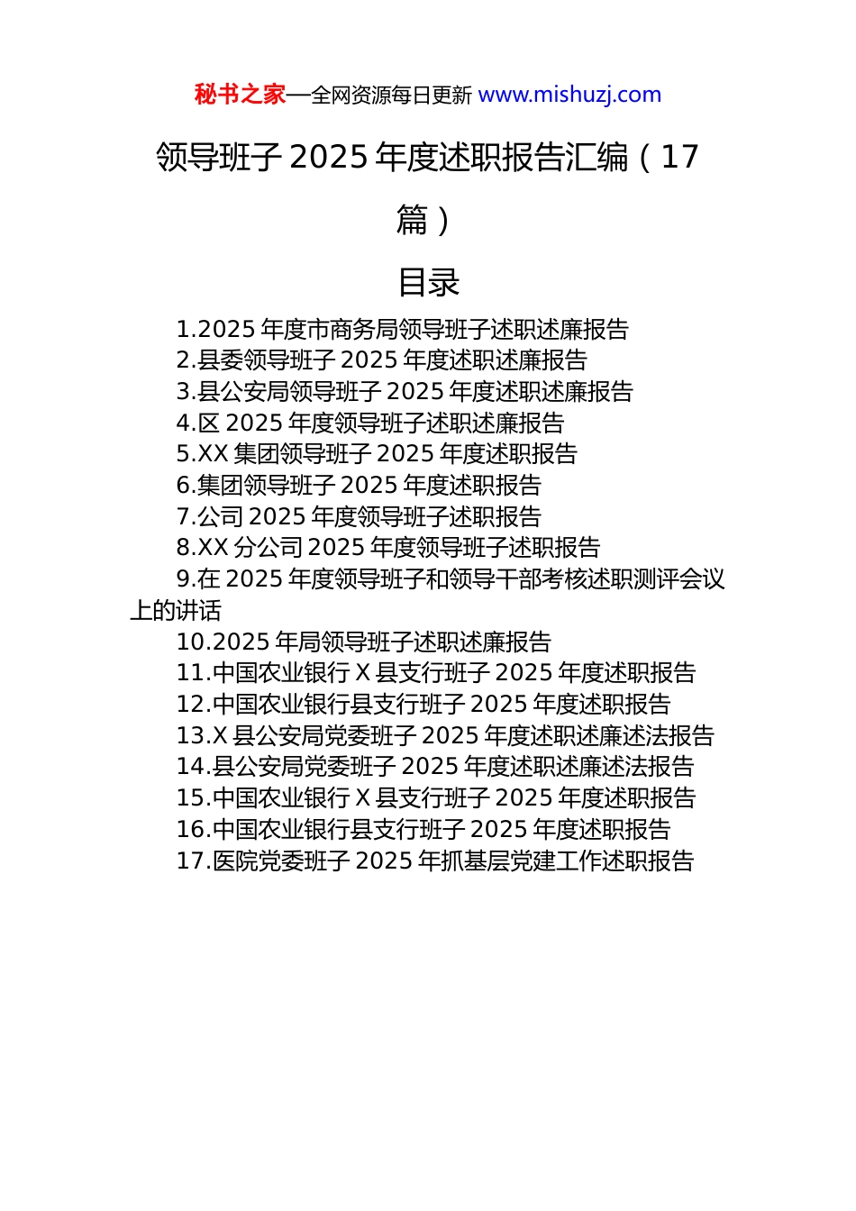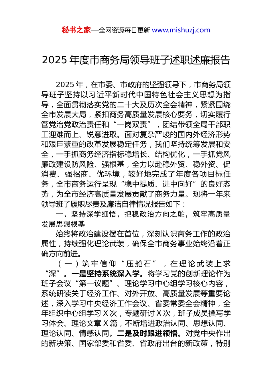 秘书之家—全网资源每日更新 www.mishuzj.com领导班子 2025 年度述职报告汇编(17篇)目录1.2025 年度市商务局领导班子述职述廉报告2.县委领导班子 2025 年度述职述廉报告3.县公安局领导班子 2025 年度述职述廉报告4.区 2025 年度领导班子述职述廉报告5.XX 集团领导班子 2025 年度述职报告6.集团领导班子 2025 年度述职报告7.公司 2025 年度领导班子述职报告8.XX 分公司 2025 年度领导班子述职报告9.在 2025 年度领导班子和领导干部考核述职测评会议上的讲话10.2025 年局领导班子述职述廉报告11.中国农业银行 X 县支行班子 2025 年度述职报告12.中国农业银行县支行班子 2025 年度述职报告13.X 县公安局党委班子 2025 年度述职述廉述法报告14.县公安局党委班子 2025 年度述职述廉述法报告15.中国农业银行 X 县支行班子 2025 年度述职报告16.中国农业银行县支行班子 2025 年度述职报告17.医院党委班子 2025 年抓基层党建工作述职报告秘书之家—全网资源每日更新 www.mishuzj.com2025 年度市商务局领导班子述职述廉报告2025 年,在市委、市政府的坚强领导下,市商务局领导班子坚持以习近平新时代中国特色社会主义思想为指导,全面贯彻落实党的二十大及历次全会精神,紧紧围绕全市发展大局,紧扣商务高质量发展核心要务,切实履行管党治党政治责任和“一岗双责”,团结带领全局干部职工迎难而上、锐意进取。面对复杂严峻的国内外经济形势和艰巨繁重的改革发展稳定任务,我们坚持统筹发展和安全,一手抓商务经济指标稳增长、结构优化,一手抓党风廉政建设防风险、强根基,全力以赴稳外贸、稳外资、促消费、强招商、优环境,较好地完成了年度各项目标任务,全市商务运行呈现“稳中提质、进中向好”的良好态势,为全市经济高质量发展贡献了商务力量。现将一年来领导班子履职尽责及廉洁自律情况报告如下:一、坚持深学细悟,把稳政治方向之舵,筑牢高质量发展思想根基始终将政治建设摆在首位,深刻认识商务工作的政治属性,持续强化理论武装,确保全市商务事业始终沿着正确方向前进。( 一 ) 筑 牢 信 仰 “ 压 舱 石 ” , 在 理 论 武 装 上 求“深”。一是坚持系统深入学。将学习党的创新理论作为班子会议“第一议题”、理论学习中心组学习核心内容,系统研读关于经济工作、对外开放、高质量发展等重要论述,深入学习中央经济工作会议、省委常委全会精神,全年组织中心组学习 X 次,专题研讨 X 次,班子成员撰写学习体会、理论文章 X 篇,不断增进政治认同、思想认同、理论认同、情感认同。二是及时跟进领悟。对党中央作出的新决策、国家部委和省委、省政府出台的新政策,特别秘书之家—全网资源每日更新 www.mishuzj.com是关于建设全国统一大市场、推进高水平对外开放、恢复和扩大消费等重大部署,第一时间组织学习传达,深刻领会精神实质和实践要求,确保上级决策部署在商务领域不折不扣落实。三是筑牢思想防线。常态化开展理想信念教育、对党忠诚教育、党章党规党纪教育,引导班子成员和全体干部深刻领悟“两个确立”的决定性意义,增强“四个意识”、坚定“四个自信”、做到“两个维护”,始终在思想上政治上行动上同党中央保持高度一致。( 二 ) 用 好 思 想 “ 指 路 灯 ” , 在 学 用 结 合 上 求“实”。一是紧密联系商务实际。坚持问题导向、目标导向、结果导向,将学习成果与谋划商务发展思路、破解商务改革难题、应对商务领域风险挑战紧密结合。例如,运用新发展理念指导编制全市商贸物流“十四五”规划中期评估与调整方案;运用统筹发展和安全的方法论,研究制定商务领域安全生产和风险防控预案。二是深入开展调查研究。班子成员带头落实“深、实、细、准、效”调研要求,围绕促消费政策落地、外资企业服务、外贸新业态培育、开发区提质增效等课题,深入企业、园区、市场一线开展调研 X 次,形成高质量调研报告 X 篇,推动解决企业反映的突出问题 X 个,将调研成果转化为具体政策举措和工作抓手。三是推动学习成果转化。通过理论学习,进一步明确了商务工作服务构建新...