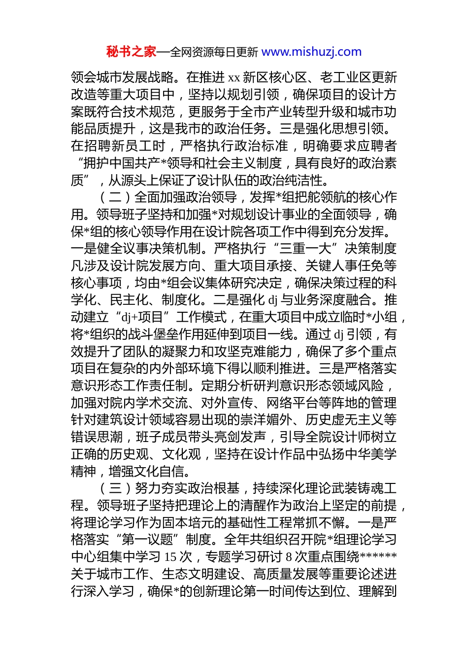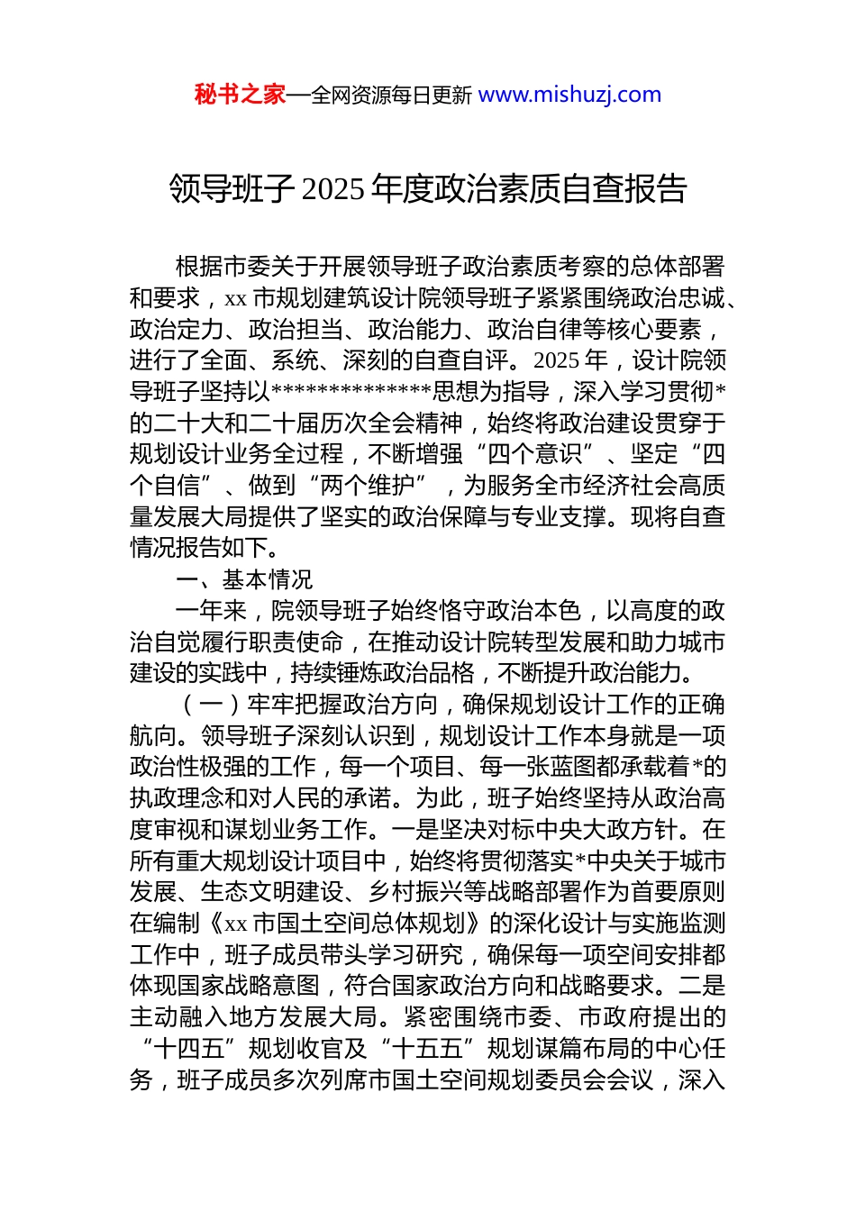 秘书之家—全网资源每日更新 www.mishuzj.com领导班子 2025 年度政治素质自查报告根据市委关于开展领导班子政治素质考察的总体部署和要求,xx 市规划建筑设计院领导班子紧紧围绕政治忠诚、政治定力、政治担当、政治能力、政治自律等核心要素,进行了全面、系统、深刻的自查自评。2025 年,设计院领导班子坚持以**************思想为指导,深入学习贯彻*的二十大和二十届历次全会精神,始终将政治建设贯穿于规划设计业务全过程,不断增强“四个意识”、坚定“四个自信”、做到“两个维护”,为服务全市经济社会高质量发展大局提供了坚实的政治保障与专业支撑。现将自查情况报告如下。一、基本情况一年来,院领导班子始终恪守政治本色,以高度的政治自觉履行职责使命,在推动设计院转型发展和助力城市建设的实践中,持续锤炼政治品格,不断提升政治能力。(一)牢牢把握政治方向,确保规划设计工作的正确航向。领导班子深刻认识到,规划设计工作本身就是一项政治性极强的工作,每一个项目、每一张蓝图都承载着*的执政理念和对人民的承诺。为此,班子始终坚持从政治高度审视和谋划业务工作。一是坚决对标中央大政方针。在所有重大规划设计项目中,始终将贯彻落实*中央关于城市发展、生态文明建设、乡村振兴等战略部署作为首要原则在编制《xx 市国土空间总体规划》的深化设计与实施监测工作中,班子成员带头学习研究,确保每一项空间安排都体现国家战略意图,符合国家政治方向和战略要求。二是主动融入地方发展大局。紧密围绕市委、市政府提出的“十四五”规划收官及“十五五”规划谋篇布局的中心任务,班子成员多次列席市国土空间规划委员会会议,深入秘书之家—全网资源每日更新 www.mishuzj.com领会城市发展战略。在推进 xx 新区核心区、老工业区更新改造等重大项目中,坚持以规划引领,确保项目的设计方案既符合技术规范,更服务于全市产业转型升级和城市功能品质提升,这是我市的政治任务。三是强化思想引领。在招聘新员工时,严格执行政治标准,明确要求应聘者“拥护中国共产*领导和社会主义制度,具有良好的政治素质”,从源头上保证了设计队伍的政治纯洁性。(二)全面加强政治领导,发挥*组把舵领航的核心作用。领导班子坚持和加强*对规划设计事业的全面领导,确保*组的核心领导作用在设计院各项工作中得到充分发挥。一是健全议事决策机制。严格执行“三重一大”决策制度凡涉及设计院发展方向、重大项目承接、关键人事任免等核心事项,均由*组会议集体研究决定,确保决策过程的科学化、民主化、制度化。二是强化 dj 与业务深度融合。推动建立“dj+项目”工作模式,在重大项目中成立临时*小组,将*组织的战斗堡垒作用延伸到项目一线。通过 dj 引领,有效提升了团队的凝聚力和攻坚克难能力,确保了多个重点项目在复杂的内外部环境下得以顺利推进。三是严格落实意识形态工作责任制。定期分析研判意识形态领域风险,加强对院内学术交流、对外宣传、网络平台等阵地的管理针对建筑设计领域容易出现的崇洋媚外、历史虚无主义等错误思潮,班子成员带头亮剑发声,引导全院设计师树立正确的历史观、文化观,坚持在设计作品中弘扬中华美学精神,增强文化自信。(三)努力夯实政治根基,持续深化理论武装铸魂工程。领导班子坚持把理论上的清醒作为政治上坚定的前提,将理论学习作为固本培元的基础性工程常抓不懈。一是严格落实“第一议题”制度。全年共组织召开院*组理论学习中心组集中学习 15 次,专题学习研讨 8 次重点围绕******关于城市工作、生态文明建设、高质量发展等重要论述进行深入学习,确保*的创新理论第一时间传达到位、理解到秘书之家—全网资源每日更新 www.mishuzj.com位、落实到位。二是创新学习方式与载体。结合设计院专业特点,组织开展“城市更新中的政治经济学”“绿色建筑与国家“双碳”战略”等专题讲座,邀请市委*校专家和行业学者进行辅导。通过“线上+线下”相结合的方式,利用“学习强国”等平台,推动理论学习常态化、制度化,班子成员年度人均线上学习时长超过 400 小时,撰写心得体会 20 余篇。三是注重学习成果转化。坚持学以致用,...