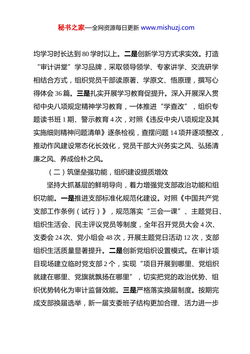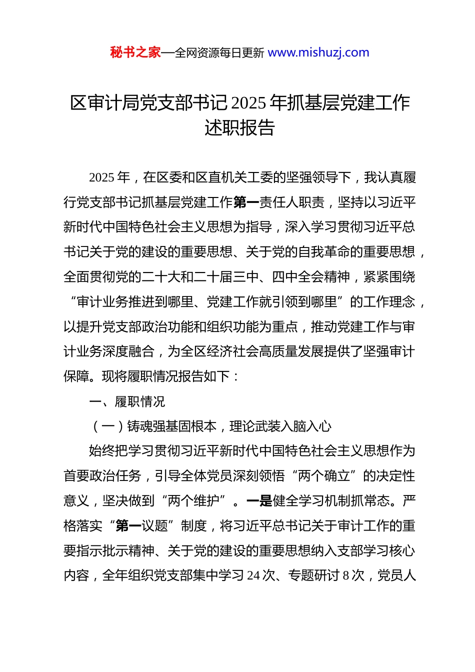 秘书之家—全网资源每日更新 www.mishuzj.com区审计局党支部书记 2025 年抓基层党建工作述职报告 2025 年,在区委和区直机关工委的坚强领导下,我认真履行党支部书记抓基层党建工作第一责任人职责,坚持以习近平新时代中国特色社会主义思想为指导,深入学习贯彻习近平总书记关于党的建设的重要思想、关于党的自我革命的重要思想,全面贯彻党的二十大和二十届三中、四中全会精神,紧紧围绕“审计业务推进到哪里、党建工作就引领到哪里”的工作理念,以提升党支部政治功能和组织功能为重点,推动党建工作与审计业务深度融合,为全区经济社会高质量发展提供了坚强审计保障。现将履职情况报告如下:一、履职情况(一)铸魂强基固根本,理论武装入脑入心始终把学习贯彻习近平新时代中国特色社会主义思想作为首要政治任务,引导全体党员深刻领悟“两个确立”的决定性意义,坚决做到“两个维护”。一是健全学习机制抓常态。严格落实“第一议题”制度,将习近平总书记关于审计工作的重要指示批示精神、关于党的建设的重要思想纳入支部学习核心内容,全年组织党支部集中学习 24 次、专题研讨 8 次,党员人秘书之家—全网资源每日更新 www.mishuzj.com均学习时长达到 80 学时以上。二是创新学习方式求实效。打造“审计讲堂”学习品牌,采取领导领学、专家讲学、交流研学相结合方式,组织党员干部读原著、学原文、悟原理,撰写心得体会 36 篇。三是扎实开展学习教育促提升。深入开展深入贯彻中央八项规定精神学习教育,一体推进“学查改”,组织专题读书班 1 期、警示教育 4 次,对照《违反中央八项规定及其实施细则精神问题清单》逐条检视,查摆问题 14 项并逐项整改,推动作风建设常态化长效化,党员干部大兴务实之风、弘扬清廉之风、养成俭朴之风。(二)筑堡垒强功能,组织建设提质增效坚持大抓基层的鲜明导向,着力增强党支部政治功能和组织功能。一是推进支部标准化规范化建设。对照《中国共产党支部工作条例(试行)》,规范落实“三会一课”、主题党日、组织生活会、民主评议党员等制度,全年召开党员大会 4 次、支委会 24 次、党小组会 48 次,开展主题党日活动 12 次,支部组织生活质量显著提升。二是创新党组织设置模式。在审计项目现场建立临时党支部 2 个,实现“项目开展到哪里、党组织就建在哪里、党旗就飘扬在哪里”,切实把党的政治优势、组织优势转化为审计监督效能。三是严格落实换届制度。按期完成支部换届选举,新一届支委班子结构更加合理、活力进一步秘书之家—全网资源每日更新 www.mishuzj.com增强,为推动党建工作高质量发展奠定了坚实组织基础。(三)锻先锋铸铁军,队伍建设严管厚爱坚持用改革精神和严的标准推进党员队伍建设,着力锻造靠得住、顶得上、过得硬的审计先锋队伍。一是强化党员教育培训。制定《党员教育培训年度计划》,围绕政治理论、审计业务、法律法规等开展专题培训 6 期,组织党员参加上级调训12 人次,党员综合素质明显提升。二是严把党员发展质量关。坚持“控制总量、优化结构、提高质量、发挥作用”的要求,注重把政治素养高、审计业务精、群众基础好的青年骨干发展为党员,全年发展党员 1 名、培养入党积极分子 2 名。三是加强党员管理监督。实施党员积分制管理,建立“党员先锋岗”3个、划定“党员责任区”4 个,开展民主评议党员工作,对表现突出的党员予以表扬,对不合格党员进行组织处理,党员队伍先进性纯洁性进一步增强。四是引导党员在网络空间发挥作用。组织党员通过网络评论等形式宣传政策、引导舆论,发布审计政策解读、典型案例等信息 20 余条,讲好审计故事、传播审计声音。五是加强和改进党徽党旗工作。规范党徽佩戴和党旗使用管理,在重大活动、重要场合规范使用党徽党旗,教育引导党员增强党员意识、牢记党员身份。(四)围中心服大局,党建业务深度融合秘书之家—全网资源每日更新 www.mishuzj.com坚持服务“国之大者”,充分发挥党支部战斗堡垒作用和党员先锋模范作用,在推动高质量发展、维护社会稳定、联系服务群众等重大任务中彰显担当。一是聚焦主责主业强监督。紧紧围绕区...