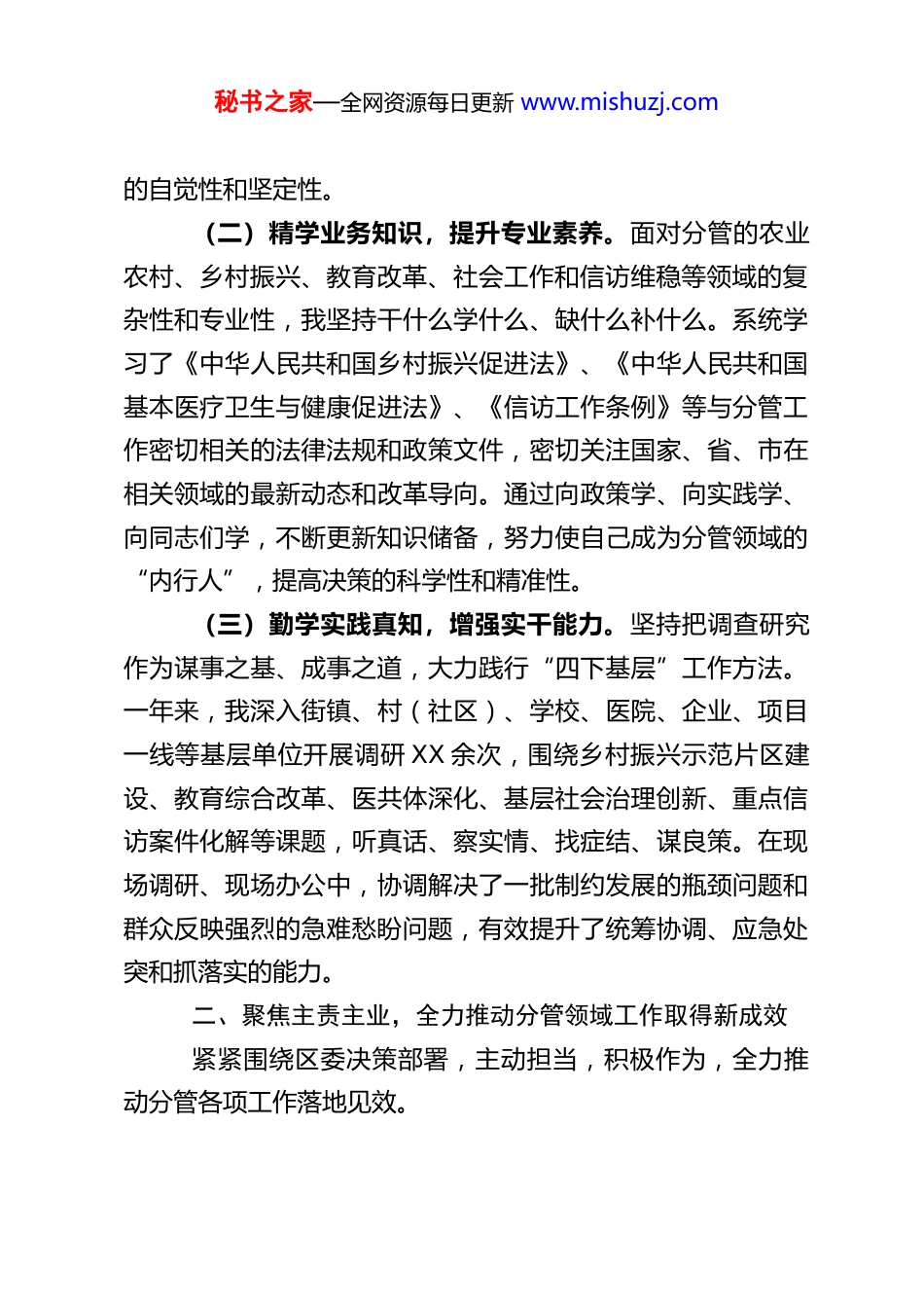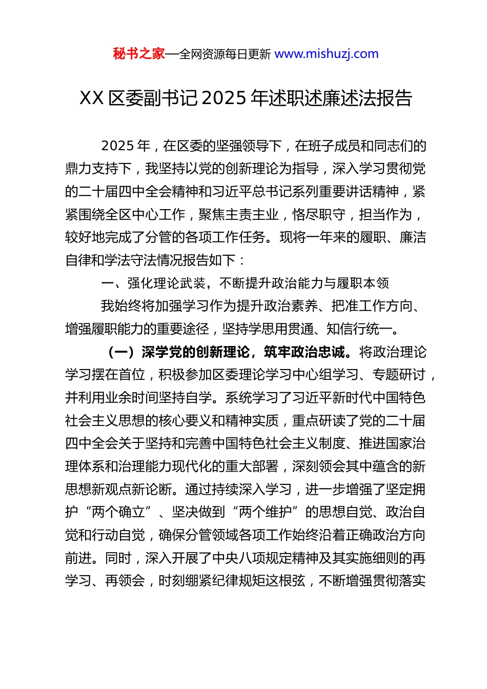秘书之家—全网资源每日更新 www.mishuzj.comXX 区委副书记 2025 年述职述廉述法报告2025 年,在区委的坚强领导下,在班子成员和同志们的鼎力支持下,我坚持以党的创新理论为指导,深入学习贯彻党的二十届四中全会精神和习近平总书记系列重要讲话精神,紧紧围绕全区中心工作,聚焦主责主业,恪尽职守,担当作为,较好地完成了分管的各项工作任务。现将一年来的履职、廉洁自律和学法守法情况报告如下:一、强化理论武装,不断提升政治能力与履职本领我始终将加强学习作为提升政治素养、把准工作方向、增强履职能力的重要途径,坚持学思用贯通、知信行统一。(一)深学党的创新理论,筑牢政治忠诚。将政治理论学习摆在首位,积极参加区委理论学习中心组学习、专题研讨,并利用业余时间坚持自学。系统学习了习近平新时代中国特色社会主义思想的核心要义和精神实质,重点研读了党的二十届四中全会关于坚持和完善中国特色社会主义制度、推进国家治理体系和治理能力现代化的重大部署,深刻领会其中蕴含的新思想新观点新论断。通过持续深入学习,进一步增强了坚定拥护“两个确立”、坚决做到“两个维护”的思想自觉、政治自觉和行动自觉,确保分管领域各项工作始终沿着正确政治方向前进。同时,深入开展了中央八项规定精神及其实施细则的再学习、再领会,时刻绷紧纪律规矩这根弦,不断增强贯彻落实秘书之家—全网资源每日更新 www.mishuzj.com的自觉性和坚定性。(二)精学业务知识,提升专业素养。面对分管的农业农村、乡村振兴、教育改革、社会工作和信访维稳等领域的复杂性和专业性,我坚持干什么学什么、缺什么补什么。系统学习了《中华人民共和国乡村振兴促进法》、《中华人民共和国基本医疗卫生与健康促进法》、《信访工作条例》等与分管工作密切相关的法律法规和政策文件,密切关注国家、省、市在相关领域的最新动态和改革导向。通过向政策学、向实践学、向同志们学,不断更新知识储备,努力使自己成为分管领域的“内行人”,提高决策的科学性和精准性。(三)勤学实践真知,增强实干能力。坚持把调查研究作为谋事之基、成事之道,大力践行“四下基层”工作方法。一年来,我深入街镇、村(社区)、学校、医院、企业、项目一线等基层单位开展调研 XX 余次,围绕乡村振兴示范片区建设、教育综合改革、医共体深化、基层社会治理创新、重点信访案件化解等课题,听真话、察实情、找症结、谋良策。在现场调研、现场办公中,协调解决了一批制约发展的瓶颈问题和群众反映强烈的急难愁盼问题,有效提升了统筹协调、应急处突和抓落实的能力。二、聚焦主责主业,全力推动分管领域工作取得新成效紧紧围绕区委决策部署,主动担当,积极作为,全力推动分管各项工作落地见效。秘书之家—全网资源每日更新 www.mishuzj.com(一)聚力乡村振兴,建设和美乡村。坚决扛起粮食安全政治责任,严格落实耕地保护和永久基本农田特殊保护制度,全年完成高标准农田建设 XX 万亩,粮食生产保持稳定。大力发展乡村特色产业,培育壮大新型农业经营主体 XX 家,新增省级以上农业龙头企业 X 家。深入实施农村人居环境整治提升行动,扎实推进“清洁家园”和小流域综合治理,农村生活垃圾收运处置体系覆盖率达 XX%,村容村貌显著改善。积极探索“党建+乡村振兴”模式,总结推广“共谋共建共管共评共享”经验,推动村级集体经济持续发展壮大,全区村均集体收入同比增长 XX%。成功打造 XX 个省级美丽乡村示范村。(二)深化教育改革,促进优质均衡。坚持教育优先发展战略,持续推进基础教育扩优提质。XX 中学新校区、XX 实验学校建设项目进展顺利,新增学位 XXXX 个。深入实施“县管校聘”管理改革,优化教师资源配置。推动学前教育普惠发展,普惠性幼儿园覆盖率达到 XX%。2025 年高考成绩稳中有进,本科上线率持续提升。聚焦“校园餐”安全与质量,建立常态化监管机制,守护学生“舌尖上的安全”。加强青少年思想道德建设和心理健康教育,营造良好育人环境。(三)创新社会治理,维护和谐稳定。牵头推动社会治理创新,健全完善基层社会治理体系。依托区“四下基层”一线办公室,推动资源力量...