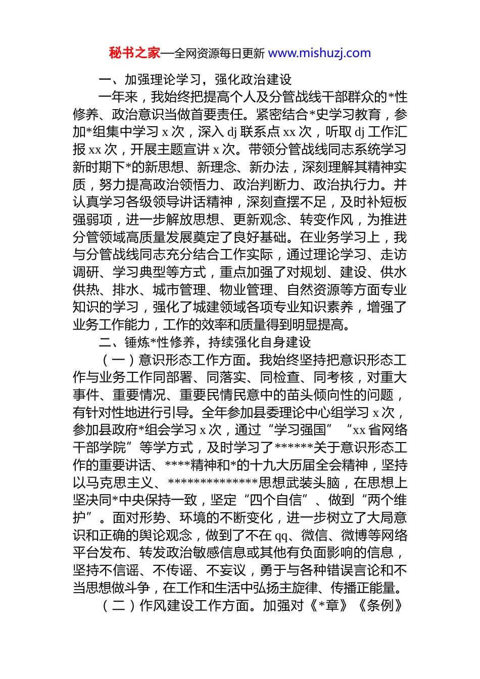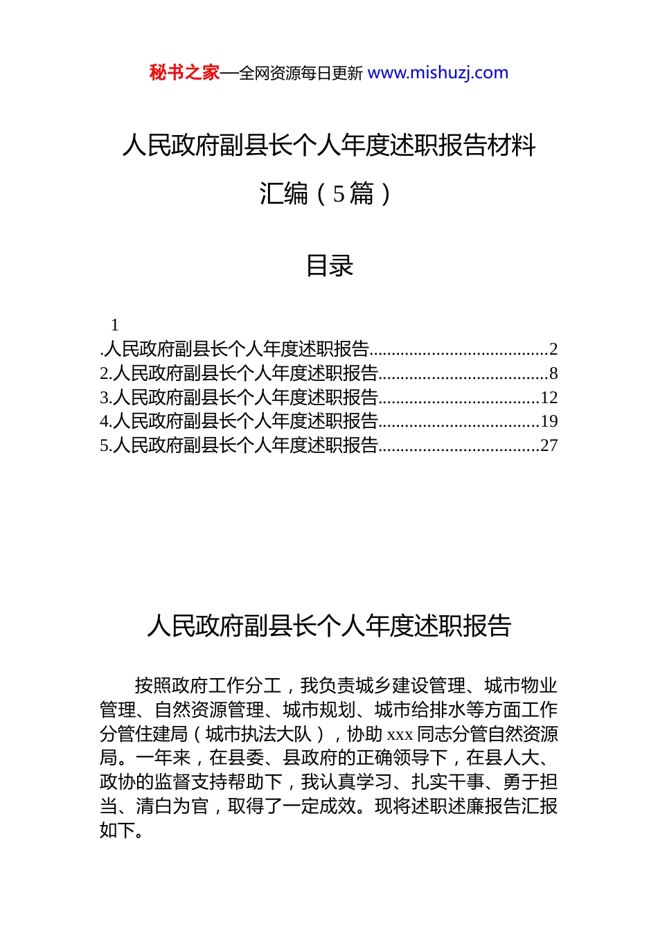 秘书之家—全网资源每日更新 www.mishuzj.com人民政府副县长个人年度述职报告材料汇编(5 篇)目录1.人民政府副县长个人年度述职报告........................................22.人民政府副县长个人年度述职报告......................................83.人民政府副县长个人年度述职报告....................................124.人民政府副县长个人年度述职报告....................................195.人民政府副县长个人年度述职报告....................................27人民政府副县长个人年度述职报告按照政府工作分工,我负责城乡建设管理、城市物业管理、自然资源管理、城市规划、城市给排水等方面工作分管住建局(城市执法大队),协助 xxx 同志分管自然资源局。一年来,在县委、县政府的正确领导下,在县人大、政协的监督支持帮助下,我认真学习、扎实干事、勇于担当、清白为官,取得了一定成效。现将述职述廉报告汇报如下。秘书之家—全网资源每日更新 www.mishuzj.com一、加强理论学习,强化政治建设一年来,我始终把提高个人及分管战线干部群众的*性修养、政治意识当做首要责任。紧密结合*史学习教育,参加*组集中学习 x 次,深入 dj 联系点 xx 次,听取 dj 工作汇报 xx 次,开展主题宣讲 x 次。带领分管战线同志系统学习新时期下*的新思想、新理念、新办法,深刻理解其精神实质,努力提高政治领悟力、政治判断力、政治执行力。并认真学习各级领导讲话精神,深刻查摆不足,及时补短板强弱项,进一步解放思想、更新观念、转变作风,为推进分管领域高质量发展奠定了良好基础。在业务学习上,我与分管战线同志充分结合工作实际,通过理论学习、走访调研、学习典型等方式,重点加强了对规划、建设、供水供热、排水、城市管理、物业管理、自然资源等方面专业知识的学习,强化了城建领域各项专业知识素养,增强了业务工作能力,工作的效率和质量得到明显提高。二、锤炼*性修养,持续强化自身建设(一)意识形态工作方面。我始终坚持把意识形态工作与业务工作同部署、同落实、同检查、同考核,对重大事件、重要情况、重要民情民意中的苗头倾向性的问题,有针对性地进行引导。全年参加县委理论中心组学习 x 次,参加县政府*组会学习 x 次,通过“学习强国”“xx 省网络干部学院”等学方式,及时学习了******关于意识形态工作的重要讲话、****精神和*的十九大历届全会精神,坚持以马克思主义、**************思想武装头脑,在思想上坚决同*中央保持一致,坚定“四个自信”、做到“两个维护”。面对形势、环境的不断变化,进一步树立了大局意识和正确的舆论观念,做到了不在 qq、微信、微博等网络平台发布、转发政治敏感信息或其他有负面影响的信息,坚持不信谣、不传谣、不妄议,勇于与各种错误言论和不当思想做斗争,在工作和生活中弘扬主旋律、传播正能量。(二)作风建设工作方面。加强对《*章》《条例》秘书之家—全网资源每日更新 www.mishuzj.com《准则》的深度学习,带头执行中央“八项规定”和省委“九项规定”,坚决杜绝形式主义、官僚主义等四风问题再次严明了政治纪律和政治规矩,持续保持为民服务的清廉本色;也再次告诫了自己要慎言慎行、防微杜渐,始终保持清醒的头脑,从小处“着手”、从细处“过滤”,杜绝微腐败;更再次提醒了自己要公私分明,做到警钟长鸣知敬畏、存戒惧、守底线,坚决不触碰廉洁自律这条带电的高压线,清清白白做人,干干净净做事。同时,严格教育配偶、子女和身边工作人员,绝不允许任何人凭借我的影响办私事、谋私利。(三)依法行政工作方面。严格遵循******关于依法治国的要求,积极树立法治思维,认真学习有关法律法规自觉做到学法、懂法、用法、提高依法行政能力。参加县政府常务会会前学法 x 次,深入学习《xx 省城市供热条例》《中华人民共和国安全生产法》《土地管理法实施条例》等各项法律法规 xx 部,不断提升自身法律素养和依法行政能力。在平时工作学习和生活中,我也认真学法用法加强依法行政能力的同时,以身作则,身体力行,恪守国家法律法规和*员干部廉洁自律准则,随时警醒自己秉公办...