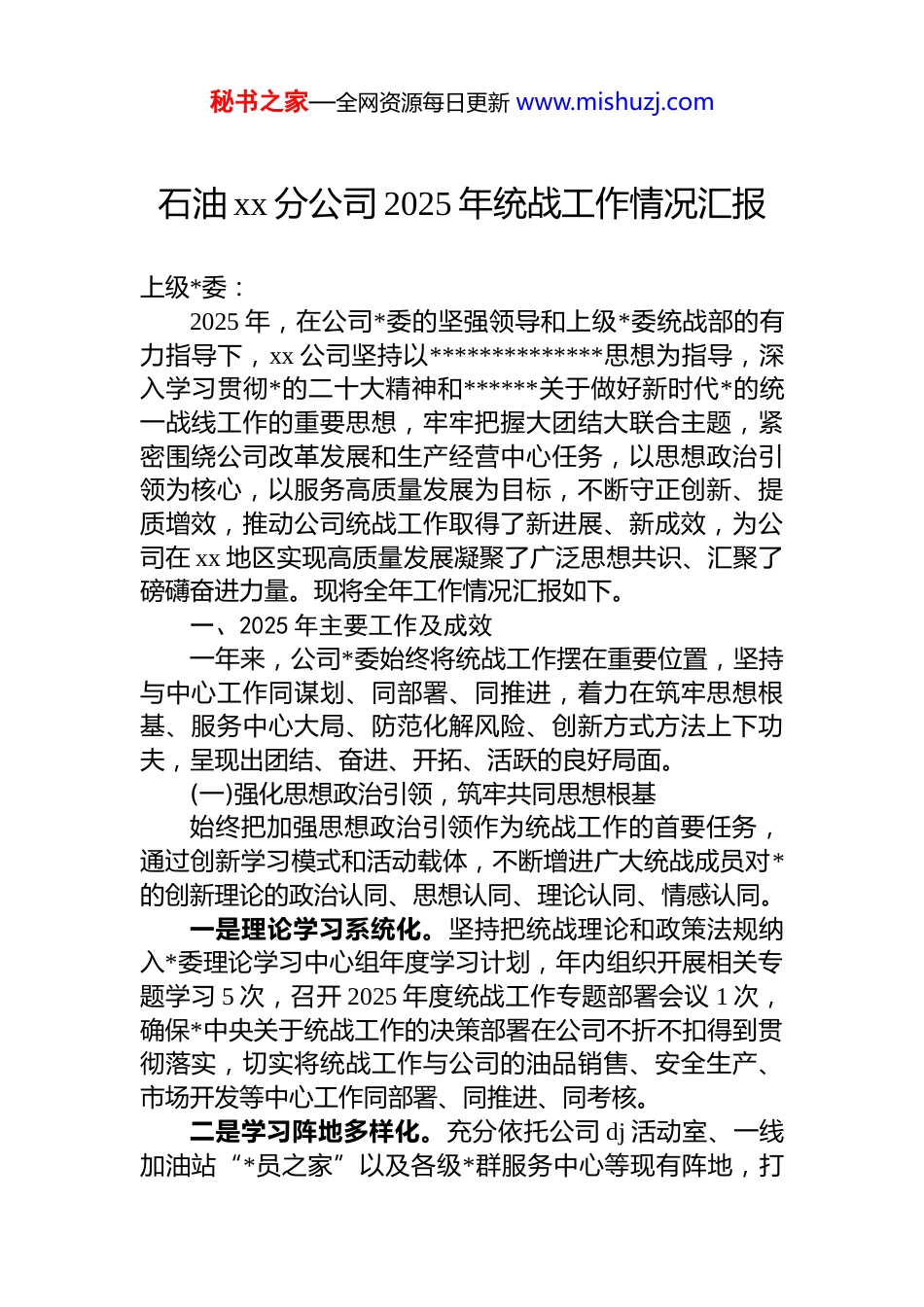秘书之家—全网资源每日更新 www.mishuzj.com石油 xx 分公司 2025 年统战工作情况汇报上级*委:2025 年,在公司*委的坚强领导和上级*委统战部的有力指导下,xx 公司坚持以**************思想为指导,深入学习贯彻*的二十大精神和******关于做好新时代*的统一战线工作的重要思想,牢牢把握大团结大联合主题,紧密围绕公司改革发展和生产经营中心任务,以思想政治引领为核心,以服务高质量发展为目标,不断守正创新、提质增效,推动公司统战工作取得了新进展、新成效,为公司在 xx 地区实现高质量发展凝聚了广泛思想共识、汇聚了磅礴奋进力量。现将全年工作情况汇报如下。一、2025 年主要工作及成效一年来,公司*委始终将统战工作摆在重要位置,坚持与中心工作同谋划、同部署、同推进,着力在筑牢思想根基、服务中心大局、防范化解风险、创新方式方法上下功夫,呈现出团结、奋进、开拓、活跃的良好局面。(一)强化思想政治引领,筑牢共同思想根基始终把加强思想政治引领作为统战工作的首要任务,通过创新学习模式和活动载体,不断增进广大统战成员对*的创新理论的政治认同、思想认同、理论认同、情感认同。一是理论学习系统化。坚持把统战理论和政策法规纳入*委理论学习中心组年度学习计划,年内组织开展相关专题学习 5 次,召开 2025 年度统战工作专题部署会议 1 次,确保*中央关于统战工作的决策部署在公司不折不扣得到贯彻落实,切实将统战工作与公司的油品销售、安全生产、市场开发等中心工作同部署、同推进、同考核。二是学习阵地多样化。充分依托公司 dj 活动室、一线加油站“*员之家”以及各级*群服务中心等现有阵地,打秘书之家—全网资源每日更新 www.mishuzj.com造常态化学习平台,每月定期开展“同心讲堂”等学习交流活动,组织统战成员深入学习*的路线方针政策,引导其自觉与*同心同德、同向同行。三是宣传宣讲广泛化。针对公司统战成员点多面广、分布于不同岗位和场站的特点,组建由*员领导干部、*支部书记、先进典型组成的“先锋宣讲队”,深入基层站队业务一线、客户群体中开展“微宣讲”,用通俗易懂的语言讲政策、讲形势、讲发展。2025 年累计开展各类学习宣讲活动 60 余场次,覆盖统战成员及相关员工 2000 余人次,有效提升了统战成员的学习热情和参与感。(二)聚焦服务中心大局,汇聚改革发展合力坚持围绕中心、服务大局,找准统战工作与公司生产经营的结合点和切入点,引导广大统战成员在各自岗位上建功立业,为公司高质量发展贡献智慧和力量。一是在服务经营发展上“搭桥梁”。主动作为,积极搭建内部协同和外部合作平台。年内组织召开“深化内外协作、服务地方发展”座谈会,邀请地方政府部门、重点合作企业代表与公司管理技术人员、*外知识分子等共同交流,完善企地、企间资源共享与合作机制,推动公司在成品油零售、非油品业务拓展、新能源项目开发等方面与地方经济实现更深层次的融合发展。二是在助力重点任务上“献良策”。充分发挥*外知识分子、业务骨干等统战成员的专业优势和智力优势,围绕公司市场保供、安全环保、服务提升、数字化转型等年度重点任务,定期组织“我为公司发展献一策”等活动,引导他们积极参与技术攻关、管理创新和市场研判。2025 年,共收到来自统战成员的合理化建议 30 余条,其中多项建议被采纳并应用于实际工作,有效提升了经营管理效能。三是在参与基层治理上“显担当”。引导统战成员积极参与公司安全生产、和谐企业建设等基层治理工作。在公司安全生产网格化管理体系中,明确统战成员的安全职秘书之家—全网资源每日更新 www.mishuzj.com责,鼓励其在隐患排查、应急演练、安全文化建设中发挥监督和带动作用。同时,通过设立矛盾纠纷调解小组,吸纳有威望、善沟通的统战成员参与,成功调处化解内部矛盾纠纷数起,营造了和谐稳定的内部环境。(三)防范化解风险隐患,筑牢和谐稳定防线全面贯彻总体国家安全观,高度重视统战领域风险防范工作,坚持底线思维,健全工作机制,牢牢掌握工作主动权,切实维护公司和社会的和谐稳定。一是提高政治站位,压实工作责任。深入学习领会******关于防范化解重大风险...