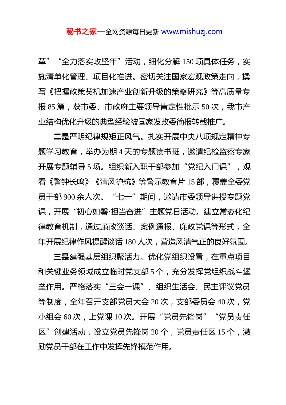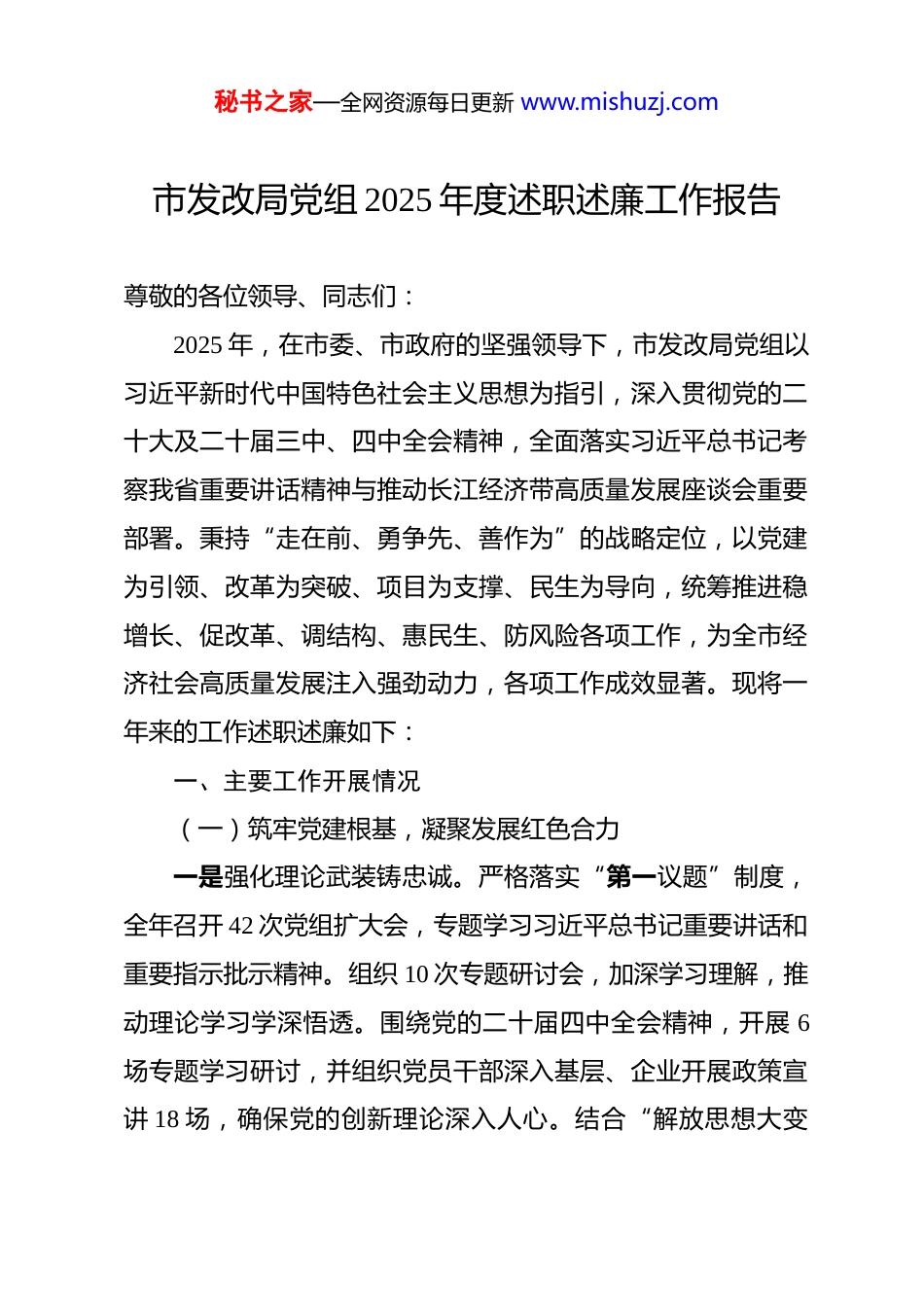 秘书之家—全网资源每日更新 www.mishuzj.com市发改局党组 2025 年度述职述廉工作报告 尊敬的各位领导、同志们:2025 年,在市委、市政府的坚强领导下,市发改局党组以习近平新时代中国特色社会主义思想为指引,深入贯彻党的二十大及二十届三中、四中全会精神,全面落实习近平总书记考察我省重要讲话精神与推动长江经济带高质量发展座谈会重要部署。秉持“走在前、勇争先、善作为”的战略定位,以党建为引领、改革为突破、项目为支撑、民生为导向,统筹推进稳增长、促改革、调结构、惠民生、防风险各项工作,为全市经济社会高质量发展注入强劲动力,各项工作成效显著。现将一年来的工作述职述廉如下:一、主要工作开展情况(一)筑牢党建根基,凝聚发展红色合力一是强化理论武装铸忠诚。严格落实“第一议题”制度,全年召开 42 次党组扩大会,专题学习习近平总书记重要讲话和重要指示批示精神。组织 10 次专题研讨会,加深学习理解,推动理论学习学深悟透。围绕党的二十届四中全会精神,开展 6场专题学习研讨,并组织党员干部深入基层、企业开展政策宣讲 18 场,确保党的创新理论深入人心。结合“解放思想大变秘书之家—全网资源每日更新 www.mishuzj.com革”“全力落实攻坚年”活动,细化分解 150 项具体任务,实施清单化管理、项目化推进。密切关注国家宏观政策走向,撰写《把握政策契机加速产业创新升级的策略研究》等高质量专报 85 篇,获市委、市政府主要领导肯定性批示 50 次,我市产业结构优化升级的典型经验被国家发改委简报转载推广。二是严明纪律规矩正风气。扎实开展中央八项规定精神专题学习教育,举办为期 4 天的专题读书班,邀请纪检监察专家开展专题辅导 5 场。组织新入职干部参加“党纪入门课”,观看《警钟长鸣》《清风护航》等警示教育片 15 部,覆盖全委党员干部 900 余人次。“七一”期间,邀请市委领导讲授专题党课,开展“初心如磐·担当奋进”主题党日活动。建立常态化纪律教育机制,通过廉政谈话、案例通报、廉政党课等形式,全年开展纪律作风提醒谈话 180 人次,营造风清气正的良好氛围。三是建强基层组织聚活力。优化党组织设置,在重点项目和关键业务领域成立临时党支部 5 个,充分发挥党组织战斗堡垒作用。严格落实“三会一课”、组织生活会、民主评议党员等制度,全年召开支部党员大会 20 次,支部委员会 40 次,党小组会 60 次,上党课 10 次。开展“党员先锋岗”“党员责任区”创建活动,设立党员先锋岗 20 个,党员责任区 15 个,激励党员干部在工作中发挥先锋模范作用。秘书之家—全网资源每日更新 www.mishuzj.com(二)深化改革创新,激发发展内生动力一是推进重点领域改革。深化经济体制改革,制定《市经济体制改革三年行动计划(2025-2027 年)》,明确改革目标和任务。推进要素市场化配置改革,建立健全土地、劳动力、资本、技术、数据等要素市场体系,促进要素自由流动和高效配置。加快推进价格改革,完善价格形成机制,加强价格监管,保持价格总水平基本稳定。二是优化营商环境。持续开展“营商环境提升年”活动,制定《优化营商环境十条措施》,从政务服务、市场准入、监管执法等方面提出具体举措。推进政务服务标准化、规范化、便利化建设,深化“一网通办”“最多跑一次”改革,实现政务服务事项网上可办率达到 95%以上。加强信用体系建设,建立健全守信联合激励和失信联合惩戒机制,营造诚实守信的市场环境。三是加强区域合作。积极融入长江经济带发展战略,加强与周边城市的合作交流。参与长江经济带城市协同发展联盟,与联盟城市在产业合作、科技创新、生态环保等方面开展合作项目 10 个。加强与长三角地区的对接,主动承接产业转移,引进长三角地区项目 20 个,总投资 100 亿元。(三)狠抓项目建设,增强发展支撑能力秘书之家—全网资源每日更新 www.mishuzj.com一是加强项目谋划储备。围绕国家重大战略和产业政策,结合我市实际,谋划储备重大项目 200 个,总投资 3000 亿元。建立重大项目储备库,实行动态管理,定期更新项目信息。加强与上级部门的沟通对接,争取更...