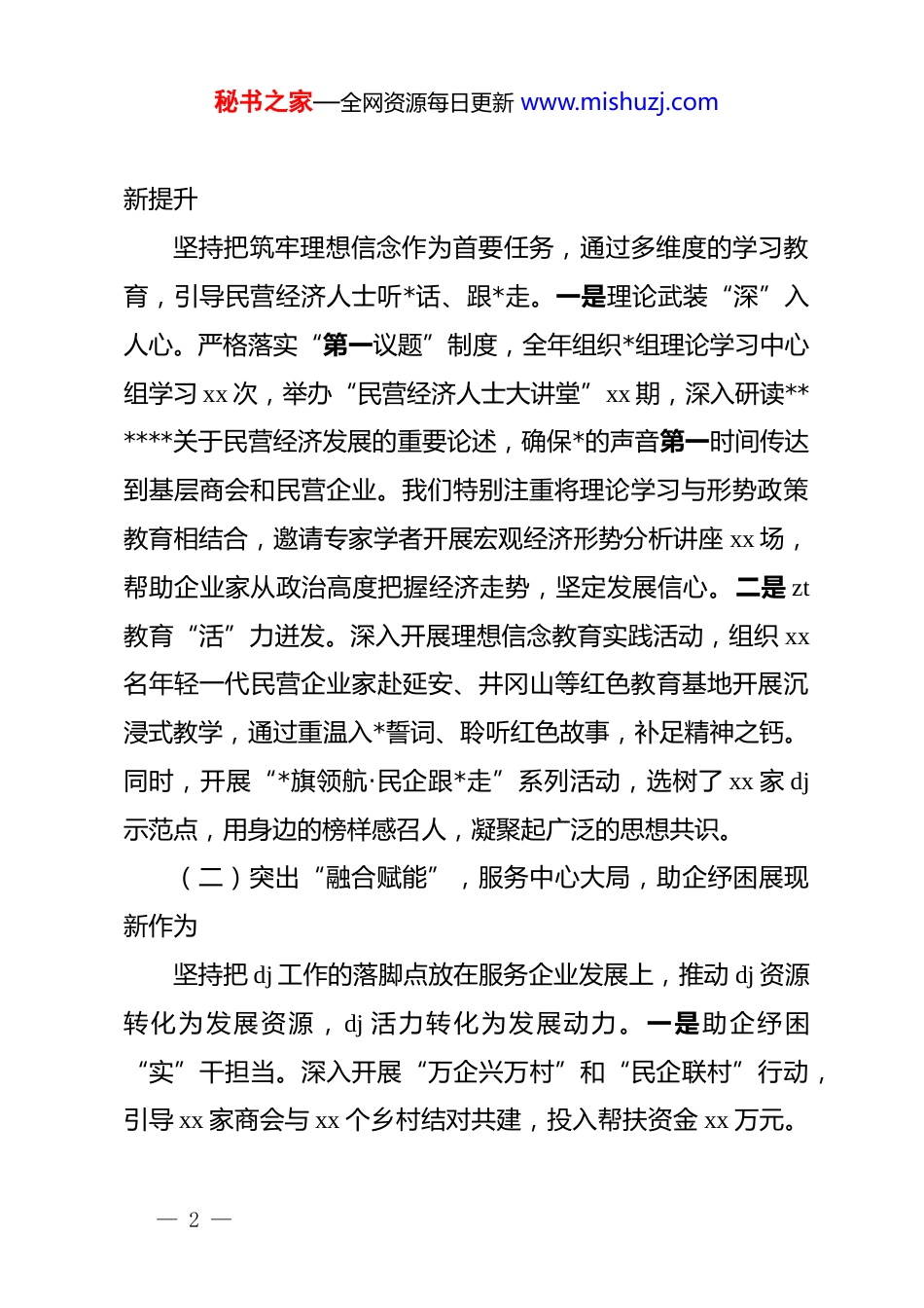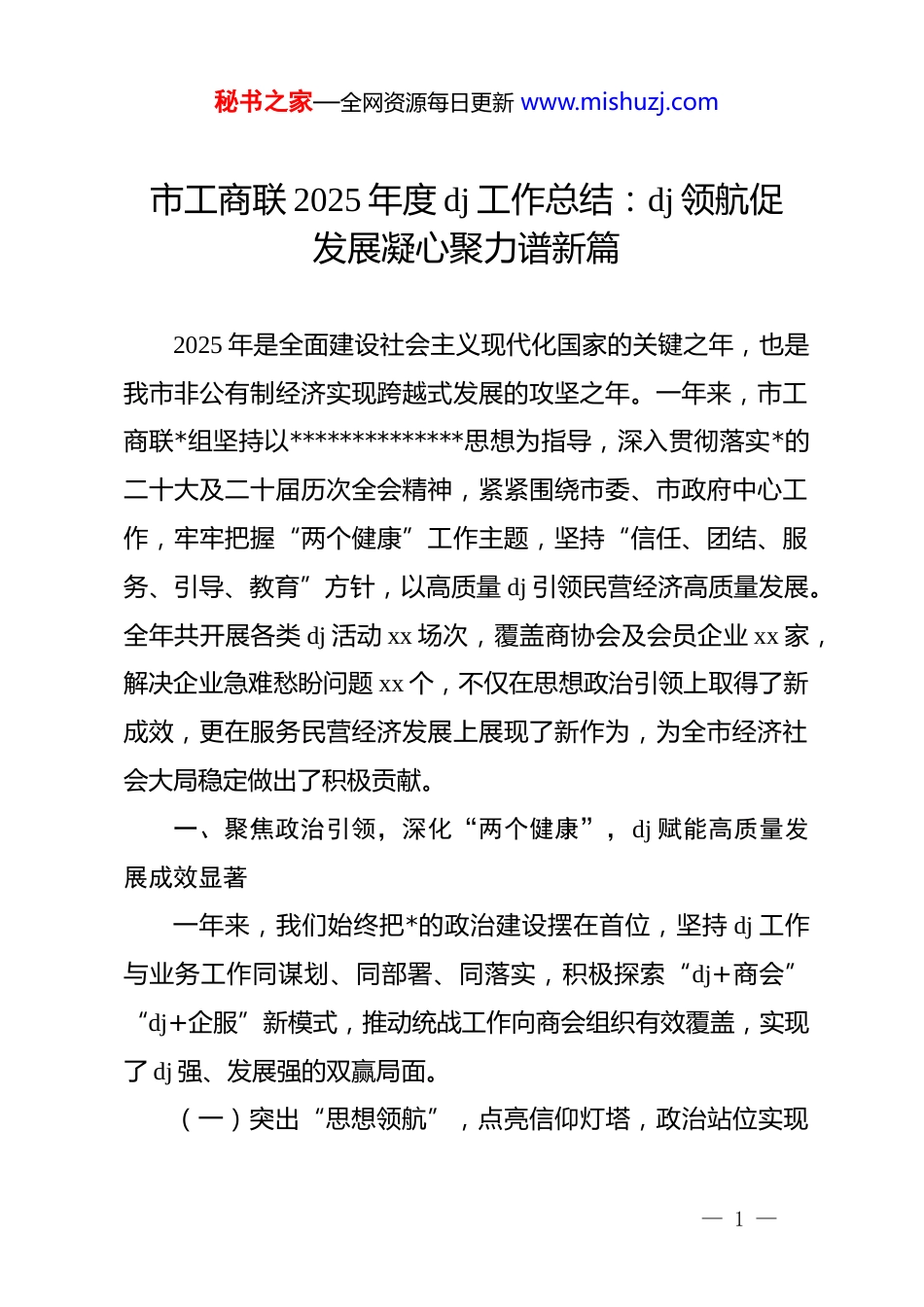 秘书之家—全网资源每日更新 www.mishuzj.com市工商联 2025 年度 dj 工作总结:dj 领航促发展凝心聚力谱新篇2025 年是全面建设社会主义现代化国家的关键之年,也是我市非公有制经济实现跨越式发展的攻坚之年。一年来,市工商联*组坚持以**************思想为指导,深入贯彻落实*的二十大及二十届历次全会精神,紧紧围绕市委、市政府中心工作,牢牢把握“两个健康”工作主题,坚持“信任、团结、服务、引导、教育”方针,以高质量 dj 引领民营经济高质量发展。全年共开展各类 dj 活动 xx 场次,覆盖商协会及会员企业 xx 家,解决企业急难愁盼问题 xx 个,不仅在思想政治引领上取得了新成效,更在服务民营经济发展上展现了新作为,为全市经济社会大局稳定做出了积极贡献。一、聚焦政治引领,深化“两个健康”,dj 赋能高质量发展成效显著一年来,我们始终把*的政治建设摆在首位,坚持 dj 工作与业务工作同谋划、同部署、同落实,积极探索“dj+商会”“dj+企服”新模式,推动统战工作向商会组织有效覆盖,实现了 dj 强、发展强的双赢局面。(一)突出“思想领航”,点亮信仰灯塔,政治站位实现— 1 —秘书之家—全网资源每日更新 www.mishuzj.com新提升坚持把筑牢理想信念作为首要任务,通过多维度的学习教育,引导民营经济人士听*话、跟*走。一是理论武装“深”入人心。严格落实“第一议题”制度,全年组织*组理论学习中心组学习 xx 次,举办“民营经济人士大讲堂”xx 期,深入研读******关于民营经济发展的重要论述,确保*的声音第一时间传达到基层商会和民营企业。我们特别注重将理论学习与形势政策教育相结合,邀请专家学者开展宏观经济形势分析讲座 xx 场,帮助企业家从政治高度把握经济走势,坚定发展信心。二是 zt教育“活”力迸发。深入开展理想信念教育实践活动,组织 xx名年轻一代民营企业家赴延安、井冈山等红色教育基地开展沉浸式教学,通过重温入*誓词、聆听红色故事,补足精神之钙。同时,开展“*旗领航·民企跟*走”系列活动,选树了 xx 家 dj示范点,用身边的榜样感召人,凝聚起广泛的思想共识。(二)突出“融合赋能”,服务中心大局,助企纾困展现新作为坚持把 dj 工作的落脚点放在服务企业发展上,推动 dj 资源转化为发展资源,dj 活力转化为发展动力。一是助企纾困“实”干担当。深入开展“万企兴万村”和“民企联村”行动,引导 xx 家商会与 xx 个乡村结对共建,投入帮扶资金 xx 万元。— 2 —秘书之家—全网资源每日更新 www.mishuzj.com建立“dj+助企”服务机制,联合市直相关部门开展“政企面对面”恳谈会 xx 场,梳理并解决企业融资难、用工缺、审批慢等具体问题 xx 件,做到了事事有回音、件件有着落。二是搭建平台“广”聚资源。充分发挥工商联桥梁纽带作用,开展“百家商会进 xx”招商引资活动,签约项目 xx 个,总投资额达 xx 亿元。我们创新实施“红色引擎”产业链 dj 工程,推动成立了 xx 个产业链*支部,把支部建在链上,让*员聚在链上,促进了上下游企业在技术、市场、人才等方面的深度合作,有效提升了产业链供应链的韧性和竞争力。(三)突出“强基固本”,织密组织体系,战斗堡垒迸发新活力坚持抓基层打基础,不断扩大*组织在商会和非公企业的有形覆盖和有效覆盖,筑牢*在非公领域的战斗堡垒。一是组织覆盖“严”格规范。按照“应建尽建”原则,开展商会*组织“双孵化”工作,即在筹备商会时同步筹备*组织、在商会注册登记时同步成立*组织。2025 年,新成立商会*支部 xx 个,并在 xx家暂不具备组建条件的商会选派了 dj 指导员,实现了所属商会dj 工作全覆盖。二是队伍建设“优”化提升。实施“双向培养”工程,把业务骨干培养成*员,把*员培养成经营管理骨干。全年新发展*员 xx 名,其中企业出资人 xx 名,高管及技术骨干— 3 —秘书之家—全网资源每日更新 www.mishuzj.comxx 名,不仅优化了*员结构,更增强了*组织在企业决策中的话语权。同时,举办了 xx 期商会*支部书记培训班,提升了基层*务工作者的业务能力和履职水平。(四)突出“正风肃纪”,涵养清风...