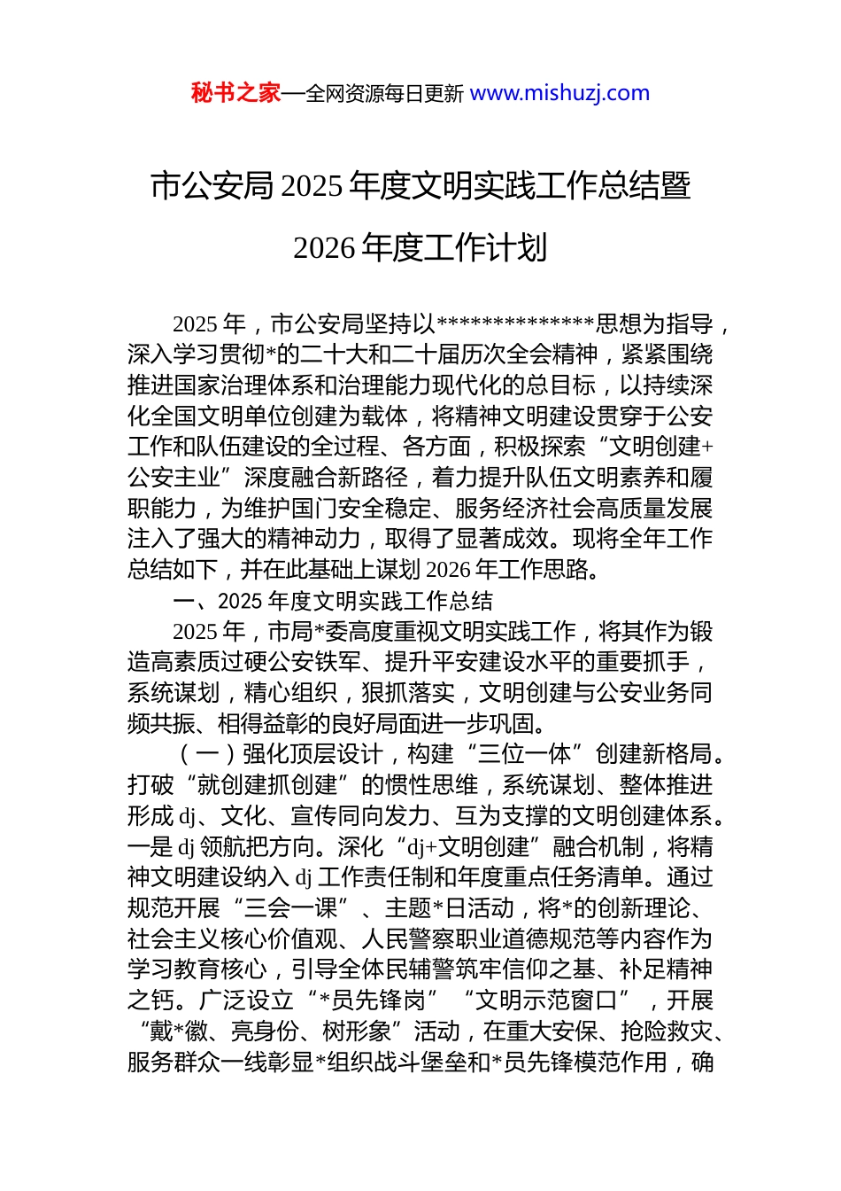 秘书之家—全网资源每日更新 www.mishuzj.com市公安局 2025 年度文明实践工作总结暨2026 年度工作计划2025 年,市公安局坚持以**************思想为指导,深入学习贯彻*的二十大和二十届历次全会精神,紧紧围绕推进国家治理体系和治理能力现代化的总目标,以持续深化全国文明单位创建为载体,将精神文明建设贯穿于公安工作和队伍建设的全过程、各方面,积极探索“文明创建+公安主业”深度融合新路径,着力提升队伍文明素养和履职能力,为维护国门安全稳定、服务经济社会高质量发展注入了强大的精神动力,取得了显著成效。现将全年工作总结如下,并在此基础上谋划 2026 年工作思路。一、2025 年度文明实践工作总结2025 年,市局*委高度重视文明实践工作,将其作为锻造高素质过硬公安铁军、提升平安建设水平的重要抓手,系统谋划,精心组织,狠抓落实,文明创建与公安业务同频共振、相得益彰的良好局面进一步巩固。(一)强化顶层设计,构建“三位一体”创建新格局。打破“就创建抓创建”的惯性思维,系统谋划、整体推进形成 dj、文化、宣传同向发力、互为支撑的文明创建体系。一是 dj 领航把方向。深化“dj+文明创建”融合机制,将精神文明建设纳入 dj 工作责任制和年度重点任务清单。通过规范开展“三会一课”、主题*日活动,将*的创新理论、社会主义核心价值观、人民警察职业道德规范等内容作为学习教育核心,引导全体民辅警筑牢信仰之基、补足精神之钙。广泛设立“*员先锋岗”“文明示范窗口”,开展“戴*徽、亮身份、树形象”活动,在重大安保、抢险救灾、服务群众一线彰显*组织战斗堡垒和*员先锋模范作用,确秘书之家—全网资源每日更新 www.mishuzj.com保文明创建工作始终沿着正确政治方向前进。二是文化浸润强根基。以社会公德、职业道德、家庭美德“三德”建设为核心,升级打造警营文化阵地。优化图书室功能,增设“文明建设”“英模风采”“法治文库”等专题书架,定期举办读书分享会、理论研讨会。充分利用人民警察节国庆等重要节点,举行庄严的升旗仪式、荣誉表彰、从警纪念等活动,增强职业荣誉感和归属感。成功举办“忠诚铸警魂”演讲比赛、警营书画摄影展、警体运动会等系列文化活动,极大丰富了警营文化生活。特别是原创歌曲《平安 xx》在“砥砺奋进七十载天山南北唱新歌”全民欢唱大赛中荣获二等奖,以及多部文艺作品在各级评选中获奖,充分展现了队伍的文化软实力和积极向上的精神风貌三是宣传引导树形象。整合宣传资源,建强以宣传文化中心为枢纽、基层通讯员为骨干的宣传矩阵。聚焦“平安 xx”新媒体平台,围绕春节、学雷锋日、警察节等时间节点,精心策划主题宣传,通过图文、短视频、海报等形式,生动讲述民辅警守护平安、服务群众的暖心故事和感人事迹全年在市级以上媒体刊发稿件 750 余篇,其中在人民日报、人民公安报等中央级、省级权威媒体发稿 360 余篇,《结合实践探索为民服务新途径》《xx 公安加强生态保护》等稿件引发良好社会反响,有效传播了公安正能量,塑造了新时代文明警队良好形象。(二)深耕品牌实践,推动文明实践走深走实。立足边境口岸实际,精心培育和打造五大文明实践品牌,推动精神文明建设从“内化于心”到“外化于行”。一是“国门金盾·守护同行”志愿服务品牌深入人心。紧密围绕市委市政府中心工作和群众急难愁盼,常态化、项目化开展志愿服务。结合爱国卫生运动,组织民辅警开展环境卫生整治 20 余场次;弘扬雷锋精神,在口岸、车站等人流密集区域开展便民指引、扶弱助残等志愿服务 150 余次;聚焦反诈防骗,开展“线上+线下”全方位宣传,举办讲座 150 余场,秘书之家—全网资源每日更新 www.mishuzj.com发放资料 1.2 万余份,切实提升了群众安全防范意识和能力。二是“便民利民、高效规范”窗口服务品牌提质增效。公安窗口单位持续深化“放管服”改革,全面优化服务流程设立“绿色通道”“老年人专窗”,提供预约、上门、延时等个性化服务。大力推广“新疆公安微警务”小程序,推动高频政务服务事项“网上办、掌上办”。全面推行“一窗通办”“跨省通办”,打破地域壁垒。通过系列举措,高频事...