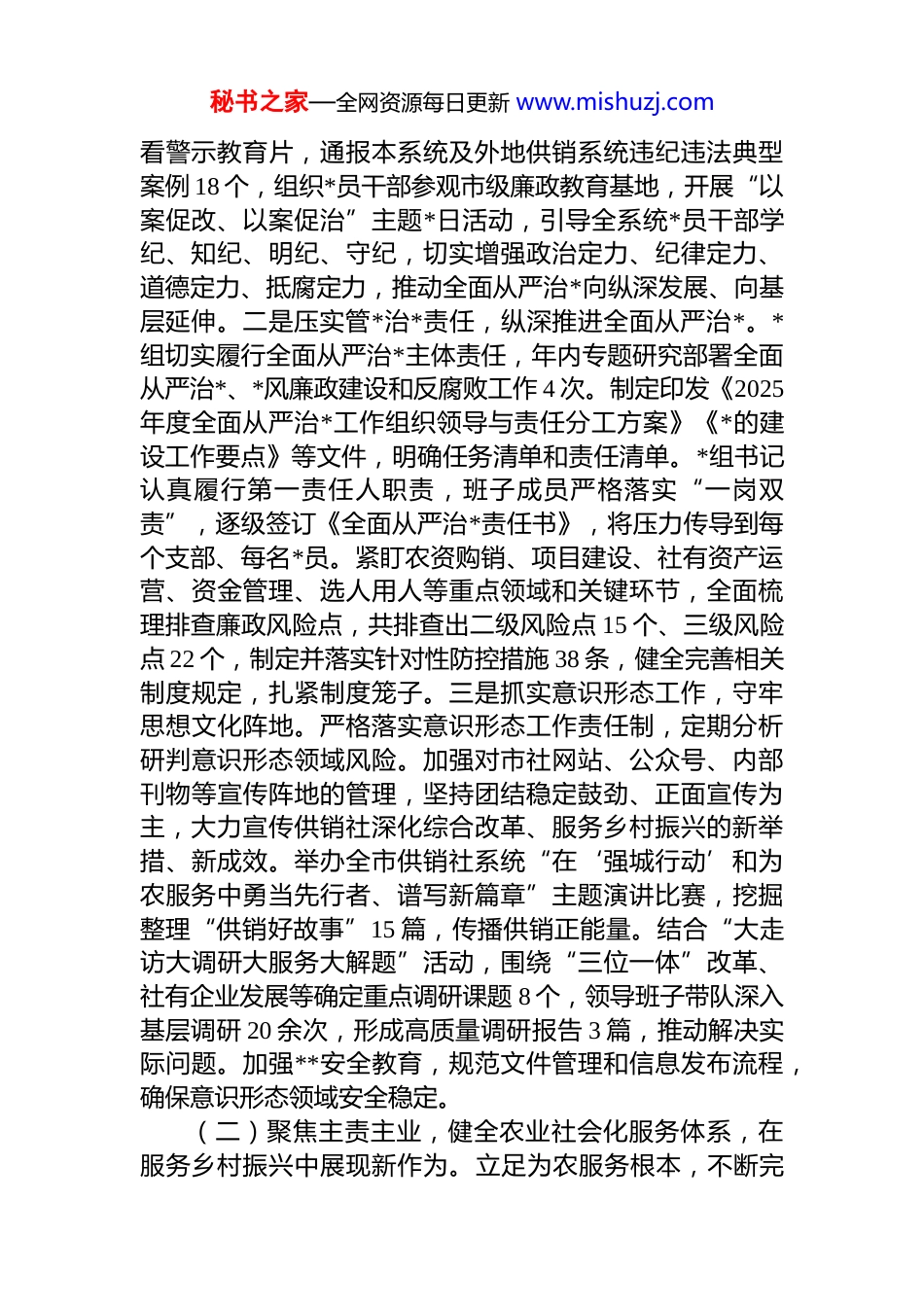 秘书之家—全网资源每日更新 www.mishuzj.com市供销社*组 2025 年述职述廉述 dj 工作总结2025 年,在市委、市政府的坚强领导下,市供销社*组坚持以**************思想为指导,全面贯彻落实*的二十大和二十届三中、四中全会精神,深入学习贯彻******关于“三农”工作的重要论述和考察重要讲话、指示批示精神,紧紧围绕市委、市政府中心工作,牢牢把握服务“三农”根本宗旨,坚持和加强*的全面领导,纵深推进全面从严治*,主动担当作为,勇于改革创新,各项事业取得新进展、新成效,为全市全面推进乡村振兴、加快建设农业强市贡献了供销力量。一、2025 年主要工作情况(一)聚焦政治引领,全面筑牢管*治*根基,为供销合作事业高质量发展提供坚强保障。市社*组始终坚持把*的政治建设摆在首位,自觉用*的创新理论武装头脑、指导实践、推动工作,确保供销合作事业发展的正确政治方向一是强化政治理论学习,持续筑牢思想根基。坚持将学习**************思想作为*组会议“第一议题”、理论学习中心组学习“第一主题”,及时跟进学习贯彻******最新重要讲话和指示批示精神,特别是关于“三农”工作、供销合作社工作的重要论述。全年组织*组会议学习 22 次,理论学习中心组专题研讨 8 次。深入开展深入贯彻中央八项规定精神学习教育,制定专门方案,召开动员部署会,通过集中学习、个人自学、专题辅导、现场教学、警示教育、交流研讨等多种形式,组织*员干部深入学习《中国共产 dj律处分条例》等*内法规,认真学习******关于*的自我革命的重要思想和关于加强 d 的纪律建设的重要论述。组织观秘书之家—全网资源每日更新 www.mishuzj.com看警示教育片,通报本系统及外地供销系统违纪违法典型案例 18 个,组织*员干部参观市级廉政教育基地,开展“以案促改、以案促治”主题*日活动,引导全系统*员干部学纪、知纪、明纪、守纪,切实增强政治定力、纪律定力、道德定力、抵腐定力,推动全面从严治*向纵深发展、向基层延伸。二是压实管*治*责任,纵深推进全面从严治*。*组切实履行全面从严治*主体责任,年内专题研究部署全面从严治*、*风廉政建设和反腐败工作 4 次。制定印发《2025年度全面从严治*工作组织领导与责任分工方案》《*的建设工作要点》等文件,明确任务清单和责任清单。*组书记认真履行第一责任人职责,班子成员严格落实“一岗双责”,逐级签订《全面从严治*责任书》,将压力传导到每个支部、每名*员。紧盯农资购销、项目建设、社有资产运营、资金管理、选人用人等重点领域和关键环节,全面梳理排查廉政风险点,共排查出二级风险点 15 个、三级风险点 22 个,制定并落实针对性防控措施 38 条,健全完善相关制度规定,扎紧制度笼子。三是抓实意识形态工作,守牢思想文化阵地。严格落实意识形态工作责任制,定期分析研判意识形态领域风险。加强对市社网站、公众号、内部刊物等宣传阵地的管理,坚持团结稳定鼓劲、正面宣传为主,大力宣传供销社深化综合改革、服务乡村振兴的新举措、新成效。举办全市供销社系统“在‘强城行动’和为农服务中勇当先行者、谱写新篇章”主题演讲比赛,挖掘整理“供销好故事”15 篇,传播供销正能量。结合“大走访大调研大服务大解题”活动,围绕“三位一体”改革、社有企业发展等确定重点调研课题 8 个,领导班子带队深入基层调研 20 余次,形成高质量调研报告 3 篇,推动解决实际问题。加强**安全教育,规范文件管理和信息发布流程,确保意识形态领域安全稳定。(二)聚焦主责主业,健全农业社会化服务体系,在服务乡村振兴中展现新作为。立足为农服务根本,不断完秘书之家—全网资源每日更新 www.mishuzj.com善服务功能,创新服务方式,努力成为服务农民生产生活的综合平台。一是全力保障农资供应,守牢粮食安全底线面对农资市场价格波动等挑战,市、县两级供销社成立农资保供工作专班,动态监测供需,加强统筹调度。全市系统确定并公布 12 家重点农资保供企业,农资经营网点稳定在 650 个以上,构建了覆盖城乡的供应网络。全年累计组织调运、储备、供应各类化肥约 10.5 万吨、农药约 1650 吨、农膜约 380 吨...