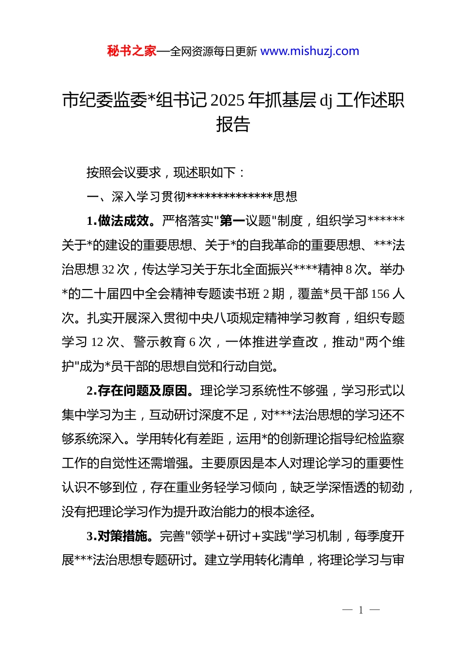 秘书之家—全网资源每日更新 www.mishuzj.com市纪委监委*组书记 2025 年抓基层 dj 工作述职报告按照会议要求,现述职如下:一、深入学习贯彻**************思想1.做法成效。严格落实"第一议题"制度,组织学习******关于*的建设的重要思想、关于*的自我革命的重要思想、***法治思想 32 次,传达学习关于东北全面振兴****精神 8 次。举办*的二十届四中全会精神专题读书班 2 期,覆盖*员干部 156 人次。扎实开展深入贯彻中央八项规定精神学习教育,组织专题学习 12 次、警示教育 6 次,一体推进学查改,推动"两个维护"成为*员干部的思想自觉和行动自觉。2.存在问题及原因。理论学习系统性不够强,学习形式以集中学习为主,互动研讨深度不足,对***法治思想的学习还不够系统深入。学用转化有差距,运用*的创新理论指导纪检监察工作的自觉性还需增强。主要原因是本人对理论学习的重要性认识不够到位,存在重业务轻学习倾向,缺乏学深悟透的韧劲,没有把理论学习作为提升政治能力的根本途径。3.对策措施。完善"领学+研讨+实践"学习机制,每季度开展***法治思想专题研讨。建立学用转化清单,将理论学习与审— 1 —秘书之家—全网资源每日更新 www.mishuzj.com查调查、监督执纪实践紧密结合,切实提升运用*的创新理论指导工作的能力水平。二、推动机关 dj 与纪检监察中心工作深度融合1.做法成效。深入开展基层 dj"质量提升年"活动,制定任务清单 18 项,逐项推进落实。建立"dj+监督"融合机制,围绕优化营商环境、乡村振兴等重点领域开展专项监督 6 次,推动解决问题 42 个。增强基层*组织政治功能和组织功能,机关*支部领办民生实事 8 件,*员参与志愿服务 320 人次,在服务保障东北全面振兴中充分发挥战斗堡垒作用。2.存在问题及原因。dj 与业务融合深度不够,存在就 dj 抓dj、"两张皮"现象,"dj+"品牌特色不够鲜明。基层*组织政治功能发挥不充分,个别支部组织生活质量不高、创新性不足。主要原因是本人统筹谋划能力不足,没有把 dj 工作与纪检监察中心工作同研究、同部署、同推进,缺乏系统思维和融合意识。3.对策措施。深化"dj+监督"融合机制,将 dj 工作嵌入监督执纪执法全过程。每月开展支部工作督查,提升组织生活质量。打造具有纪检监察特色的 dj 品牌,推动机关 dj 在服务保障高质量发展中发挥更大作用。三、加强*员队伍教育管理1.做法成效。坚持用改革精神和严的标准推进队伍建设,— 2 —秘书之家—全网资源每日更新 www.mishuzj.com组织*员参加各类培训 28 期、186 人次。深化*的创新理论武装,严把发展*员质量关,发展*员 3 名,培养入*积极分子 5 名。严格*费收缴管理使用,按时足额收缴*费 12.6 万元。完成 2 个*支部按期换届,规范*徽*旗使用管理。开展*员示范岗创建,评选先进典型 8 名,锻造靠得住、顶得上、过得硬的纪检监察铁军。2.存在问题及原因。*员教育培训针对性实效性不够强,对年轻干部的培养力度不足,传帮带机制不够健全。*员先锋模范作用发挥不够充分,在急难险重任务中担当作为有差距。主要原因是本人对*员队伍建设重视程度不够,缺乏对*员思想动态的深入了解和精准把握,激励约束机制不够完善。3.对策措施。制定*员分类培训计划,加大年轻干部培养力度,健全"传帮带"机制。完善*员积分制考核,开展岗位练兵、业务比武,激发*员干事创业活力。严格落实基层*组织按期换届制度,持续提升*员队伍整体素质。四、认真履行*组书记第一责任人职责1.做法成效。坚持把 dj 工作摆在突出位置,召开*组会议研究 dj 工作 12 次,讲授专题*课 4 次。与班子成员、支部书记开展谈心谈话 36 人次,层层压实 dj 责任。落实*风廉政建设责任制,签订责任书 28 份。落实意识形态工作责任制,定期分析研判形势,全年未发生舆情事件。推动整治形式主义为基层减负,— 3 —秘书之家—全网资源每日更新 www.mishuzj.com精简会议文件 30%,优化考核指标 15 项,以上率下种好"dj 责任田"。2.存在问题及原因。抓 dj 工作精力投入不够均衡,存在"年初部署多、平时督促少"现象,日常指导督促不够经常...