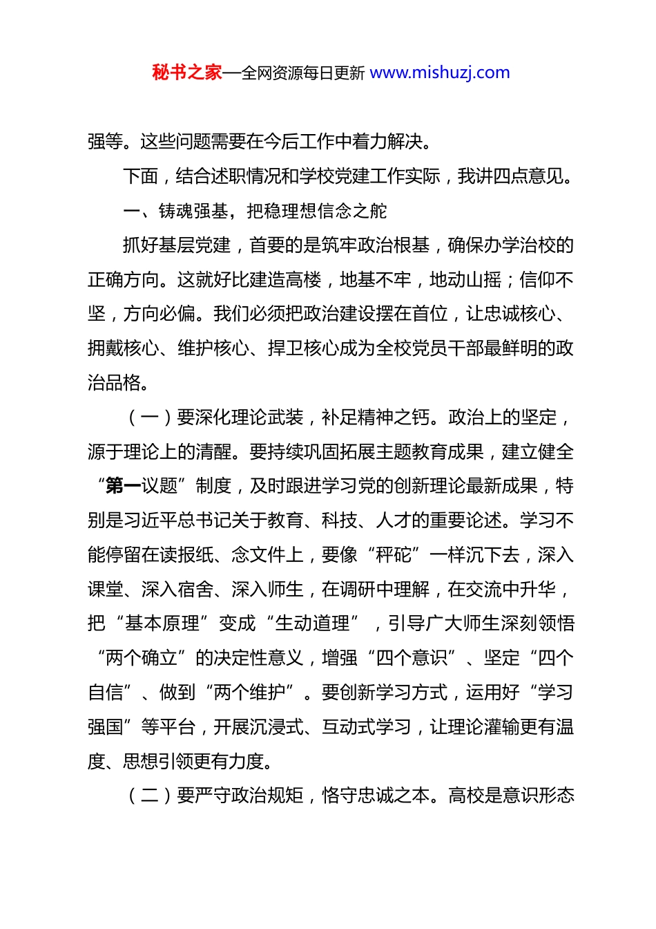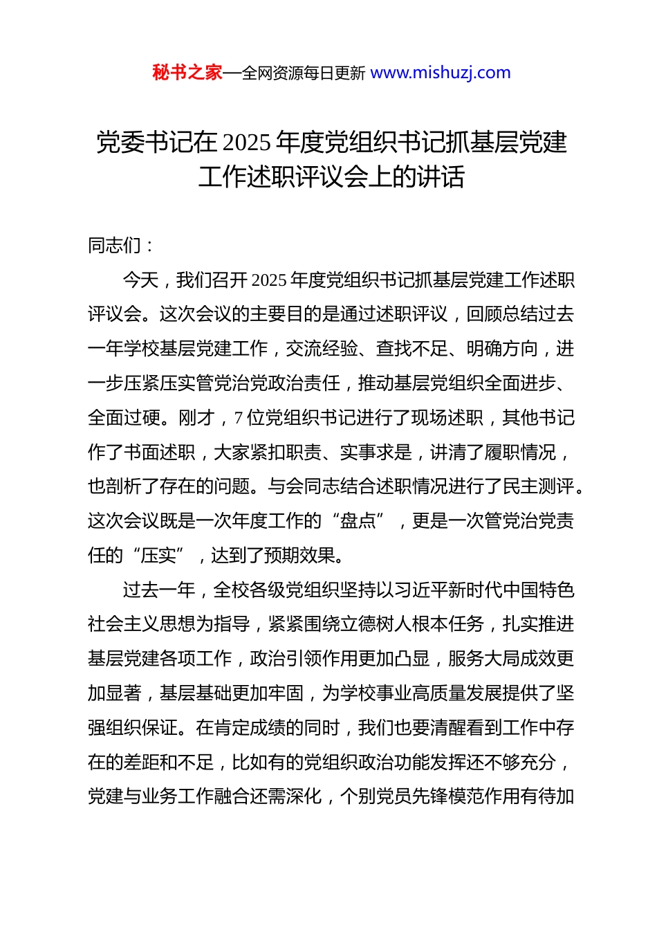 秘书之家—全网资源每日更新 www.mishuzj.com党委书记在 2025 年度党组织书记抓基层党建工作述职评议会上的讲话 同志们:今天,我们召开 2025 年度党组织书记抓基层党建工作述职评议会。这次会议的主要目的是通过述职评议,回顾总结过去一年学校基层党建工作,交流经验、查找不足、明确方向,进一步压紧压实管党治党政治责任,推动基层党组织全面进步、全面过硬。刚才,7 位党组织书记进行了现场述职,其他书记作了书面述职,大家紧扣职责、实事求是,讲清了履职情况,也剖析了存在的问题。与会同志结合述职情况进行了民主测评。这次会议既是一次年度工作的“盘点”,更是一次管党治党责任的“压实”,达到了预期效果。过去一年,全校各级党组织坚持以习近平新时代中国特色社会主义思想为指导,紧紧围绕立德树人根本任务,扎实推进基层党建各项工作,政治引领作用更加凸显,服务大局成效更加显著,基层基础更加牢固,为学校事业高质量发展提供了坚强组织保证。在肯定成绩的同时,我们也要清醒看到工作中存在的差距和不足,比如有的党组织政治功能发挥还不够充分,党建与业务工作融合还需深化,个别党员先锋模范作用有待加秘书之家—全网资源每日更新 www.mishuzj.com强等。这些问题需要在今后工作中着力解决。下面,结合述职情况和学校党建工作实际,我讲四点意见。一、铸魂强基,把稳理想信念之舵抓好基层党建,首要的是筑牢政治根基,确保办学治校的正确方向。这就好比建造高楼,地基不牢,地动山摇;信仰不坚,方向必偏。我们必须把政治建设摆在首位,让忠诚核心、拥戴核心、维护核心、捍卫核心成为全校党员干部最鲜明的政治品格。(一)要深化理论武装,补足精神之钙。政治上的坚定,源于理论上的清醒。要持续巩固拓展主题教育成果,建立健全“第一议题”制度,及时跟进学习党的创新理论最新成果,特别是习近平总书记关于教育、科技、人才的重要论述。学习不能停留在读报纸、念文件上,要像“秤砣”一样沉下去,深入课堂、深入宿舍、深入师生,在调研中理解,在交流中升华,把“基本原理”变成“生动道理”,引导广大师生深刻领悟“两个确立”的决定性意义,增强“四个意识”、坚定“四个自信”、做到“两个维护”。要创新学习方式,运用好“学习强国”等平台,开展沉浸式、互动式学习,让理论灌输更有温度、思想引领更有力度。(二)要严守政治规矩,恪守忠诚之本。高校是意识形态秘书之家—全网资源每日更新 www.mishuzj.com斗争的前沿阵地,必须把严守政治纪律和政治规矩作为生命线。要严格执行新形势下党内政治生活若干准则,提高“三会一课”质量,用好批评和自我批评武器,增强党内政治生活的政治性、时代性、原则性、战斗性。这就像人体的免疫系统,经常“红脸出汗”,才能“排毒杀菌”,保持肌体健康。要加强对课堂教学、论坛讲座、网络平台等阵地的管理,绝不给错误思想言论提供传播渠道。要教育引导党员干部自觉在思想上政治上行动上同以习近平同志为核心的党中央保持高度一致,做到党中央提倡的坚决响应、党中央决定的坚决执行、党中央禁止的坚决不做。(三)要提升政治能力,把准方向之舵。政治能力是第一位的能力。要着力提高党员干部的政治判断力、政治领悟力、政治执行力,善于从一般事务中发现政治问题,从苗头性、倾向性问题中感知政治风险,确保学校各项工作始终沿着正确政治方向前进。比如,在推进学科建设、人才培养、对外交流等工作中,都要首先从政治上看,考虑政治影响,防范政治风险。要加强政治训练和实践锻炼,把党员干部放到重大任务、复杂环境中去淬炼,让他们在应对挑战、解决问题的过程中,锤炼政治本领,锻造成为政治上的“明白人”。二、固本强体,筑牢战斗堡垒之基秘书之家—全网资源每日更新 www.mishuzj.com基层党组织是党的肌体的“神经末梢”,是党在高校全部工作和战斗力的基础。基础不牢,地动山摇。我们必须树立大抓基层的鲜明导向,着力解决“沙滩流水不到头”的问题,让每个支部都成为坚不可摧的战斗堡垒。(一)要健全组织体系,织密覆盖之网。要按照“党旗飘在阵地上、支部建在连上”的原则,优化基层党组织设置,确保...