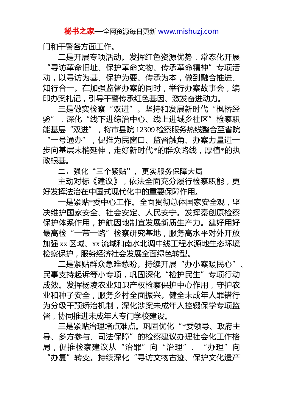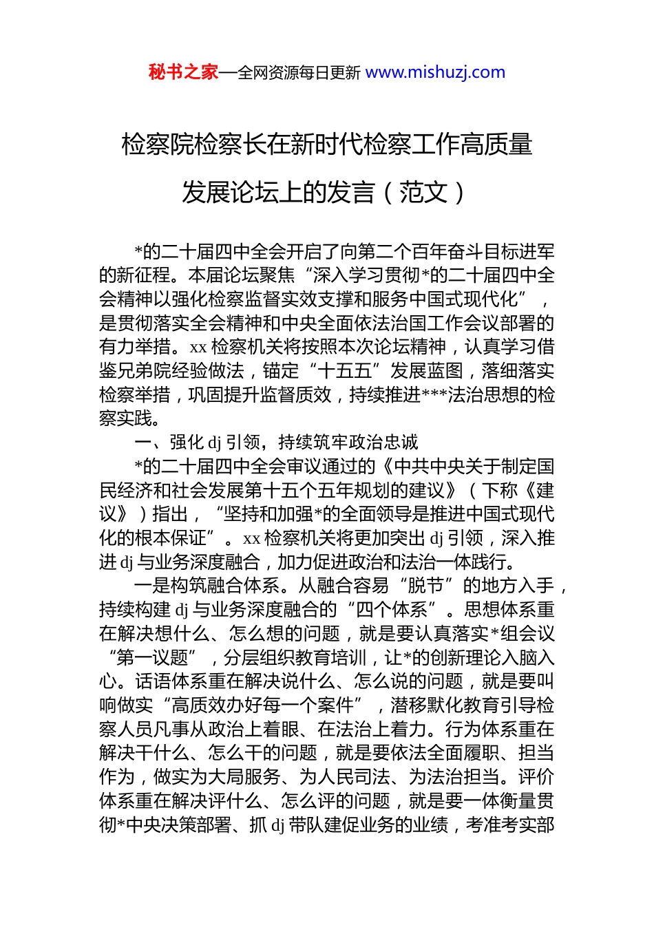 秘书之家—全网资源每日更新 www.mishuzj.com检察院检察长在新时代检察工作高质量发展论坛上的发言(范文)*的二十届四中全会开启了向第二个百年奋斗目标进军的新征程。本届论坛聚焦“深入学习贯彻*的二十届四中全会精神以强化检察监督实效支撑和服务中国式现代化”,是贯彻落实全会精神和中央全面依法治国工作会议部署的有力举措。xx 检察机关将按照本次论坛精神,认真学习借鉴兄弟院经验做法,锚定“十五五”发展蓝图,落细落实检察举措,巩固提升监督质效,持续推进***法治思想的检察实践。一、强化 dj 引领,持续筑牢政治忠诚*的二十届四中全会审议通过的《中共中央关于制定国民经济和社会发展第十五个五年规划的建议》(下称《建议》)指出,“坚持和加强*的全面领导是推进中国式现代化的根本保证”。xx 检察机关将更加突出 dj 引领,深入推进 dj 与业务深度融合,加力促进政治和法治一体践行。一是构筑融合体系。从融合容易“脱节”的地方入手,持续构建 dj 与业务深度融合的“四个体系”。思想体系重在解决想什么、怎么想的问题,就是要认真落实*组会议“第一议题”,分层组织教育培训,让*的创新理论入脑入心。话语体系重在解决说什么、怎么说的问题,就是要叫响做实“高质效办好每一个案件”,潜移默化教育引导检察人员凡事从政治上着眼、在法治上着力。行为体系重在解决干什么、怎么干的问题,就是要依法全面履职、担当作为,做实为大局服务、为人民司法、为法治担当。评价体系重在解决评什么、怎么评的问题,就是要一体衡量贯彻*中央决策部署、抓 dj 带队建促业务的业绩,考准考实部秘书之家—全网资源每日更新 www.mishuzj.com门和干警各方面工作。二是开展专项活动。发挥红色资源优势,常态化开展“寻访革命旧址、保护革命文物、传承革命精神”专项活动,以寻访为基、保护为要、传承为本,做到融合推进、知行合一。在加强监督办案的同时,举行办案故事会,编印办案札记,引导干警传承红色基因、激发奋进动力。三是做实检察“双进”。坚持和发展新时代“枫桥经验”,深化“线下进综治中心、线上进城乡社区”检察职能基层“双进”,将市县院 12309 检察服务热线整合至省院“一号通办”,促推为民窗口、监督触角、办案力量进一步向基层末梢延伸,走好新时代*的群众路线,厚植*的执政根基。二、强化“三个紧贴”,更实服务保障大局主动对标《建议》,依法全面充分履行检察职能,更好发挥法治在中国式现代化中的重要保障作用。一是紧贴*委中心工作。全面贯彻总体国家安全观,坚决维护国家安全、社会安定、人民安宁。发挥秦创原检察保护体系作用,护航因地制宜发展新质生产力。建好用好最高检“一带一路”检察研究基地,服务高水平对外开放加强 xx 区域、xx 流域和南水北调中线工程水源地生态环境检察保护,服务经济社会发展全面绿色转型。二是紧贴群众急难愁盼。持续开展“办小案暖民心”、民事支持起诉等小专项,巩固深化“检护民生”专项行动成效。发挥杨凌农业知识产权检察保护中心作用,守护农业和种子安全,服务乡村全面振兴。健全未成年人罪错行为分级干预矫治机制,深化涉案未成年人控辍保学专项监督,协同推进未成年人专门学校建设。三是紧贴治理堵点难点。巩固优化“*委领导、政府主导、多方参与、司法保障”的检察建议办理社会化工作格局,促推检察建议从“治罪”向“治理”、“办理”向“办复”转变。持续深化“寻访文物古迹、保护文化遗产秘书之家—全网资源每日更新 www.mishuzj.com传承中华文明”专项活动,一体推进秦直道、秦蜀古道、魏长城遗址等线性保护,促进加强文物监督管理。三、强化检察监督,依法维护公平正义认真落实《建议》“强化检察监督”的重要部署,聚焦法律监督主责主业、高质效办案本职本源,确保严格执法、公正司法。一是秉持客观公正立场。注重纠错与维护司法权威并重,监督纠正确有错误的司法裁判,依法支持正确裁判,着力提高司法裁判公正性稳定性权威性。注重惩罚犯罪与保障人权并重,强化诉讼活动制约配合,发挥程序保障作用。注重通过公开听证等方式听取各方意见,提升审查逮捕、起诉工作质效。二是优化法律监...