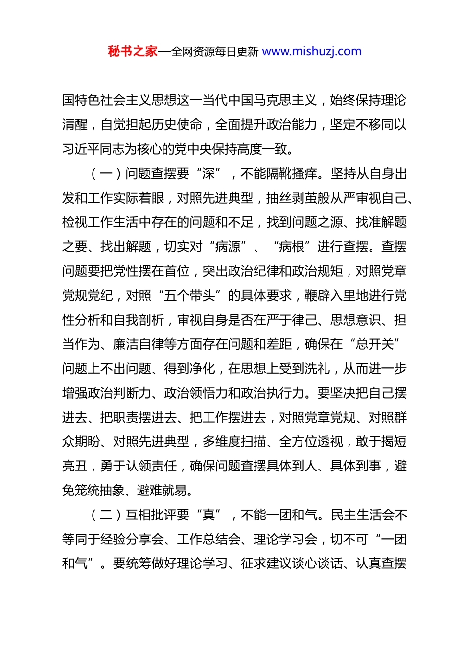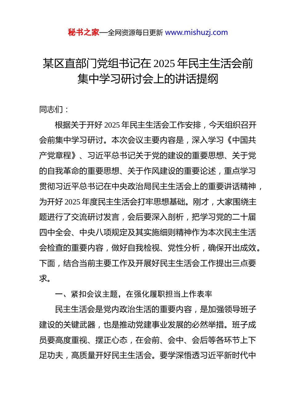 秘书之家—全网资源每日更新 www.mishuzj.com某区直部门党组书记在 2025 年民主生活会前集中学习研讨会上的讲话提纲 同志们:根据关于开好 2025 年民主生活会工作安排,今天组织召开会前集中学习研讨。本次会议主要内容是,深入学习《中国共产党章程》、习近平总书记关于党的建设的重要思想、关于党的自我革命的重要思想、关于作风建设的重要论述,重点学习贯彻习近平总书记在中央政治局民主生活会上的重要讲话精神,为开好 2025 年度民主生活会打牢思想基础。刚才,大家围绕主题进行了交流研讨发言,会后要深入剖析,把学习党的二十届四中全会、中央八项规定及其实施细则精神作为本次民主生活会检查的重要内容,做好自我检视、党性分析,确保开出成效。下面,结合当前主要工作及开展好民主生活会工作提出三点要求。一、紧扣会议主题,在强化履职担当上作表率民主生活会是党内政治生活的重要内容,是加强领导班子建设的关键武器,也是推动党建事业发展的必然举措。班子成员要高度重视、摆正心态,在会前、会中、会后等各环节上下足功夫,高质量开好民主生活会。要学深悟透习近平新时代中秘书之家—全网资源每日更新 www.mishuzj.com国特色社会主义思想这一当代中国马克思主义,始终保持理论清醒,自觉担起历史使命,全面提升政治能力,坚定不移同以习近平同志为核心的党中央保持高度一致。(一)问题查摆要“深”,不能隔靴搔痒。坚持从自身出发和工作实际着眼,对照先进典型,抽丝剥茧般从严审视自己、检视工作生活中存在的问题和不足,找到问题之源、找准解题之要、找出解题,切实对“病源”、“病根”进行查摆。查摆问题要把党性摆在首位,突出政治纪律和政治规矩,对照党章党规党纪,对照“五个带头”的具体要求,鞭辟入里地进行党性分析和自我剖析,审视自身是否在严于律己、思想意识、担当作为、廉洁自律等方面存在问题和差距,确保在“总开关”问题上不出问题、得到净化,在思想上受到洗礼,从而进一步增强政治判断力、政治领悟力和政治执行力。要坚决把自己摆进去、把职责摆进去、把工作摆进去,对照党章党规、对照群众期盼、对照先进典型,多维度扫描、全方位透视,敢于揭短亮丑,勇于认领责任,确保问题查摆具体到人、具体到事,避免笼统抽象、避难就易。(二)互相批评要“真”,不能一团和气。民主生活会不等同于经验分享会、工作总结会、理论学习会,切不可“一团和气”。要统筹做好理论学习、征求建议谈心谈话、认真查摆秘书之家—全网资源每日更新 www.mishuzj.com问题、典型案例分析、撰写对照检查材料等工作,自觉贯彻整风精神,坚持刀刃向内、自我革命,充分运用批评和自我批评武器,开展积极健康的思想斗争。自我批评时,要敢于开门见山把问题晒出来,深刻查摆问题、分析党性,不能“炒剩饭”、“老黄历”,更不能报喜藏忧、护短遮丑。对同志进行批评时,要敢于捅破“窗户纸”,本着治病救人的态度打开天窗说亮话,坚持就事论事、客观公正地揪出思想上的偏差、工作上的短板、行动中的弱项,不能存有“老好人”、怕得罪人的思想,要切实做到“讲党性不讲私情、讲真理不讲面子”。对他人提出的批评意见,要本着“有则改之,无则加勉”的态度,虚心接纳,诚恳接受,并在会后要逐一整改落实销号。(三)问题整改要“实”,不能应付了事。民主生活会不是“批评完了就了事”,相互批评不是目的,整改提高才是关键所在。要以“不解决问题不撒手,不达到目的不收兵”的态度,明确整改措施,并细化步骤、作出计划、扎实去做,通过有力行动和行之有效的手段去斩断“病根”,拔除“病灶”,达到专题民主生活会成果内化于心、外践于行、落地见效。要坚持“当下改”同“长久立”有机结合,不仅要注重民主生活会上的问题查摆改正,更要围绕主题教育专题民主生活会的主题进行经常性、日常性的反思,从而进一步转变优化作风、办秘书之家—全网资源每日更新 www.mishuzj.com好为民实事、淬炼忠诚干净担当的政治品格,推进学习工作迈上新台阶。要以此次民主生活会为契机,把问题整改与建章立制结合起来,既治标又治本,防止同类问题反复发生。针对查摆出的问题,逐项制...