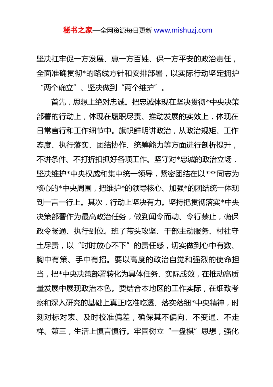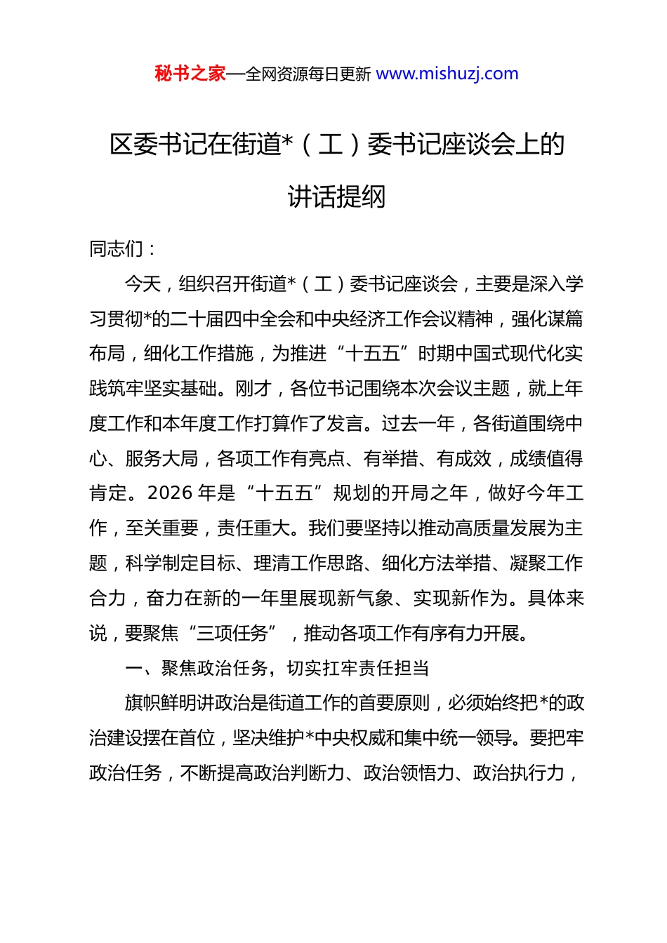 秘书之家—全网资源每日更新 www.mishuzj.com区委书记在街道*(工)委书记座谈会上的讲话提纲同志们:今天,组织召开街道*(工)委书记座谈会,主要是深入学习贯彻*的二十届四中全会和中央经济工作会议精神,强化谋篇布局,细化工作措施,为推进“十五五”时期中国式现代化实践筑牢坚实基础。刚才,各位书记围绕本次会议主题,就上年度工作和本年度工作打算作了发言。过去一年,各街道围绕中心、服务大局,各项工作有亮点、有举措、有成效,成绩值得肯定。2026 年是“十五五”规划的开局之年,做好今年工作,至关重要,责任重大。我们要坚持以推动高质量发展为主题,科学制定目标、理清工作思路、细化方法举措、凝聚工作合力,奋力在新的一年里展现新气象、实现新作为。具体来说,要聚焦“三项任务”,推动各项工作有序有力开展。一、聚焦政治任务,切实扛牢责任担当旗帜鲜明讲政治是街道工作的首要原则,必须始终把*的政治建设摆在首位,坚决维护*中央权威和集中统一领导。要把牢政治任务,不断提高政治判断力、政治领悟力、政治执行力,秘书之家—全网资源每日更新 www.mishuzj.com坚决扛牢促一方发展、惠一方百姓、保一方平安的政治责任,全面准确贯彻*的路线方针和安排部署,以实际行动坚定拥护“两个确立”、坚决做到“两个维护”。首先,思想上绝对忠诚。把忠诚体现在坚决贯彻*中央决策部署的行动上,体现在履职尽责、推动发展的实效上,体现在日常言行和工作细节中。旗帜鲜明讲政治,从政治规矩、工作态度、执行落实、团结协作、统筹能力等方面进行剖析提升,不讲条件、不打折扣抓好各项工作。坚守对*忠诚的政治立场,坚决维护*中央权威和集中统一领导,紧密团结在以***同志为核心的*中央周围,把维护*的领导核心、加强*的团结统一体现到一言一行上。其次,行动上坚决有力。坚持把贯彻落实*中央决策部署作为最高政治任务,做到闻令而动、令行禁止,确保政令畅通、执行到位。班子带头攻坚、干部主动服务、村社守土尽责,以“时时放心不下”的责任感,切实做到心中有数、胸中有策、手中有招。要以高度的政治自觉和强烈的使命担当,把*中央决策部署转化为具体任务、实际成效,在推动高质量发展中展现政治本色。要结合本地区的工作实际,在细致考察和深入研究的基础上真正吃准吃透、落实落细*中央精神,时刻对标对表、及时校准偏差,确保其不偏向、不变通、不走样。第三,生活上慎言慎行。牢固树立“一盘棋”思想,强化秘书之家—全网资源每日更新 www.mishuzj.com大局意识、集体观念,务必保持头脑清醒、务必坚持公正履职、务必做到严于律己。严守纪律底线,始终做到心有所畏、言有所戒、行有所止,自觉净化社交圈、生活圈、朋友圈,筑牢拒腐防变的思想防线和行为堤坝。坚持秉公用权、依法用权、廉洁用权,主动接受监督,习惯在“聚光灯”下工作生活,确保权力在阳光下运行。二、把握中心任务,推动工作高质高效街道工作直接面对群众、直通基层,必须坚持系统观念、强化统筹协调,聚焦高质量发展首要任务,把上级部署与本地实际紧密结合,善于抓重点、破难点、通堵点。要强化工作执行,以钉钉子精神抓落实,做到任务明确、时限清晰、责任到人。坚持问题导向、目标导向、结果导向相统一,强化过程管理、动态跟踪和督查问效,确保各项重点工作落地见效。首先,底线思维守安全。安全工作是街道工作的生命线,是必须守住的底线。要始终保持战战兢兢、如履薄冰,做到超前预判、快速响应、常抓长效,将安全稳定牢牢抓在手中,以“一失万无”的底线思维确保万无一失。要健全风险防控机制,紧盯安全生产、信访维稳、社会治安等重点领域,深化隐患排查整治,压实属地责任、监管责任和主体责任,坚决防止“黑天鹅”“灰犀牛”事件发生。坚持源头治理、系统治理、秘书之家—全网资源每日更新 www.mishuzj.com依法治理,提升基层治理精细化水平,切实把矛盾化解在早、处置在小。持续加强应急能力建设,完善预案体系,强化实战演练,确保关键时刻拉得出、冲得上、控得住。其次,项目建设提速度。项目建设是民生工程的生命线,是增进民生福祉的重要支撑。要坚持以人民为中心的发展思想,...