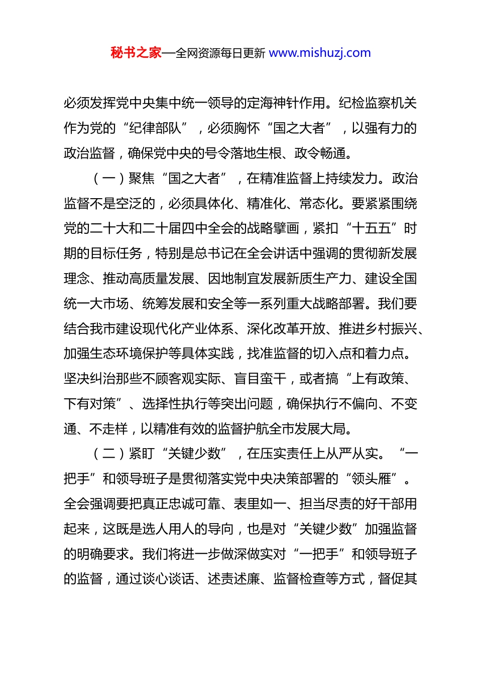 秘书之家—全网资源每日更新 www.mishuzj.com市纪委书记在市委理论学习中心组专题学习二十届中央纪委五次全会精神研讨交流会上的发言 同志们:刚刚胜利闭幕的二十届中央纪委五次全会,是在我国进入“十五五”时期关键阶段召开的一次重要会议。习近平总书记发表的重要讲话,高屋建瓴、思想深邃、内涵丰富,系统总结了新时代全面从严治党取得的历史性成就,深刻阐述了党的自我革命的重要思想,对持续发力、纵深推进反腐败斗争作出战略部署,为我们做好当前和今后一个时期的纪检监察工作指明了前进方向、提供了根本遵循。深入学习领会、坚决贯彻落实全会精神,特别是总书记重要讲话精神,是全市纪检监察机关的首要政治任务。下面,我结合工作实际,谈几点学习体会和落实思考。一、以国之大者的政治担当,筑牢护航发展的铜墙铁壁“贯彻落实党中央重大决策部署,是维护党中央权威和集中统一领导的根本要求,也是党和人民事业不断发展进步的重要历史经验。”总书记的这一重要论断,深刻揭示了加强政治监督的极端重要性。“十五五”时期任务艰巨,风险挑战叠加,秘书之家—全网资源每日更新 www.mishuzj.com必须发挥党中央集中统一领导的定海神针作用。纪检监察机关作为党的“纪律部队”,必须胸怀“国之大者”,以强有力的政治监督,确保党中央的号令落地生根、政令畅通。(一)聚焦“国之大者”,在精准监督上持续发力。政治监督不是空泛的,必须具体化、精准化、常态化。要紧紧围绕党的二十大和二十届四中全会的战略擘画,紧扣“十五五”时期的目标任务,特别是总书记在全会讲话中强调的贯彻新发展理念、推动高质量发展、因地制宜发展新质生产力、建设全国统一大市场、统筹发展和安全等一系列重大战略部署。我们要结合我市建设现代化产业体系、深化改革开放、推进乡村振兴、加强生态环境保护等具体实践,找准监督的切入点和着力点。坚决纠治那些不顾客观实际、盲目蛮干,或者搞“上有政策、下有对策”、选择性执行等突出问题,确保执行不偏向、不变通、不走样,以精准有效的监督护航全市发展大局。(二)紧盯“关键少数”,在压实责任上从严从实。“一把手”和领导班子是贯彻落实党中央决策部署的“领头雁”。全会强调要把真正忠诚可靠、表里如一、担当尽责的好干部用起来,这既是选人用人的导向,也是对“关键少数”加强监督的明确要求。我们将进一步做深做实对“一把手”和领导班子的监督,通过谈心谈话、述责述廉、监督检查等方式,督促其秘书之家—全网资源每日更新 www.mishuzj.com严于律己、严负其责、严管所辖。今年地方将开始换届,我们要严明政治纪律和组织纪律,加强廉政意见回复把关,坚决防止“带病提拔”,确保换届风清气正,推动各级领导干部树立和践行正确政绩观,真正成为贯彻落实党中央决策部署的坚定行动派和实干家。(三)贯通监督合力,在提升效能上协同联动。政治监督效能的提升,有赖于各类监督力量的贯通协调。要深化纪检监察监督与巡视巡察监督、审计监督、统计监督、财会监督等贯通协同,健全信息沟通、线索移交、措施配合、成果共享机制。特别要用好巡视巡察成果,强化整改监督,做好“后半篇文章”,对整改不力、敷衍塞责的严肃问责。要推动党内监督主导下各类监督系统集成,形成常态长效的监督合力,将制度优势更好转化为治理效能,为“十五五”规划在我市顺利实施扫清障碍、保驾护航。二、以制度治本的法治思维,编织规范权力的严密铁笼“党的自我革命重在治权,把权力关进制度笼子是新时代全面从严治党的一项重要任务。”总书记用“铁规矩”、“带电的高压线”等生动比喻,强调了制度的刚性约束力。十八大以来,以中央八项规定破题,党风政风为之一新,根本在于让铁规发力、禁令生威。新征程上,必须坚持法治思维和法治方式,秘书之家—全网资源每日更新 www.mishuzj.com不断完善制度、强化执行,让权力在阳光下运行。(一)立足“密而不繁”,在制度完善上求实求精。制度不在多,而在精,在于务实管用。要结合我市实际,围绕权力运行的关键环节、廉政风险的高发领域,特别是资源开发、土地出让、工程建设、国资监管、金融信贷等方面,持续完善配套...