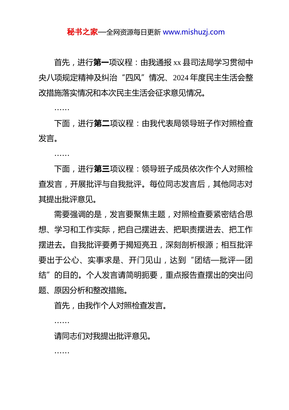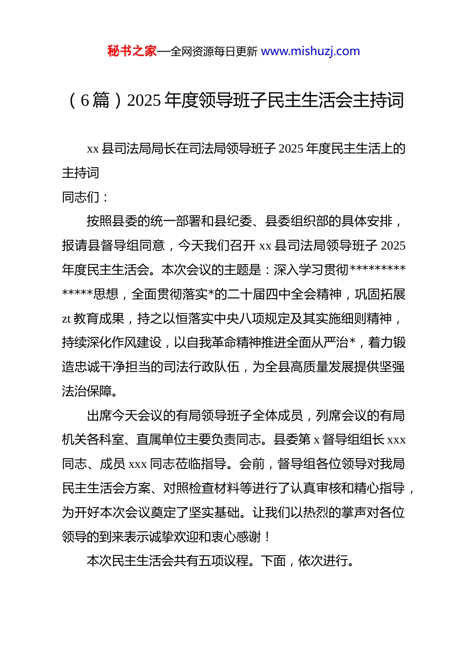 秘书之家—全网资源每日更新 www.mishuzj.com(6 篇)2025 年度领导班子民主生活会主持词xx 县司法局局长在司法局领导班子 2025 年度民主生活上的主持词同志们:按照县委的统一部署和县纪委、县委组织部的具体安排,报请县督导组同意,今天我们召开 xx 县司法局领导班子 2025年度民主生活会。本次会议的主题是:深入学习贯彻**************思想,全面贯彻落实*的二十届四中全会精神,巩固拓展zt 教育成果,持之以恒落实中央八项规定及其实施细则精神,持续深化作风建设,以自我革命精神推进全面从严治*,着力锻造忠诚干净担当的司法行政队伍,为全县高质量发展提供坚强法治保障。出席今天会议的有局领导班子全体成员,列席会议的有局机关各科室、直属单位主要负责同志。县委第 x 督导组组长 xxx同志、成员 xxx 同志莅临指导。会前,督导组各位领导对我局民主生活会方案、对照检查材料等进行了认真审核和精心指导,为开好本次会议奠定了坚实基础。让我们以热烈的掌声对各位领导的到来表示诚挚欢迎和衷心感谢!本次民主生活会共有五项议程。下面,依次进行。秘书之家—全网资源每日更新 www.mishuzj.com首先,进行第一项议程:由我通报 xx 县司法局学习贯彻中央八项规定精神及纠治“四风”情况、2024 年度民主生活会整改措施落实情况和本次民主生活会征求意见情况。……下面,进行第二项议程:由我代表局领导班子作对照检查发言。……下面,进行第三项议程:领导班子成员依次作个人对照检查发言,开展批评与自我批评。每位同志发言后,其他同志对其提出批评意见。需要强调的是,发言要聚焦主题,对照检查要紧密结合思想、学习和工作实际,把自己摆进去、把职责摆进去、把工作摆进去。自我批评要勇于揭短亮丑,深刻剖析根源;相互批评要出于公心、实事求是、开门见山,达到“团结—批评—团结”的目的。个人发言请简明扼要,重点报告查摆出的突出问题、原因分析和整改措施。首先,由我作个人对照检查发言。……请同志们对我提出批评意见。……秘书之家—全网资源每日更新 www.mishuzj.com(班子成员 xxx 同志、xxx 同志、xxx 同志……依次进行个人对照检查,其他同志分别提出批评意见。流程同上,此处省略具体发言记录)……领导班子成员对照检查和相互批评环节到此结束。下面,进行第四项议程:让我们以热烈掌声欢迎县委督导组组长 xxx同志作点评讲话。……同志们,刚才,督导组 xxx 组长对我们的民主生活会给予了中肯评价,指出了存在的问题和不足,并对下一步整改落实工作提出了明确要求和宝贵意见。这既是对我们的鼓励,更是鞭策,我们一定要认真学习领会,坚决抓好贯彻落实。下面,进行第五项议程:由我代表局领导班子作会议总结和表态发言。经过认真筹备和大家的共同努力,本次民主生活会即将结束。会上,大家紧扣主题,对照*的创新理论,对照*章*规 dj,对照初心使命,对照人民群众新期待,深入查摆了自身在政治、思想、作风、能力、廉洁等方面存在的突出问题,深刻剖析了问题根源,明确了整改方向。相互批评坦诚相见、直言不讳,体现了对*、对事业、对同志高度负责的态度,达到了统一思想、秘书之家—全网资源每日更新 www.mishuzj.com增进团结、改进作风、促进工作的预期目的。为了切实巩固好、运用好这次民主生活会成果,扎实做好“后半篇文章”,我代表局领导班子,再强调四点意见:一、持续强化理论武装,在筑牢政治忠诚上作表率。要坚持把学习贯彻**************思想作为首要政治任务,特别是要深学细悟*的二十届四中全会精神,深刻把握关于坚持全面依法治国、推进法治中国建设的战略部署,自觉用以武装头脑、指导实践、推动工作。要始终把*的政治建设摆在首位,深刻领悟“两个确立”的决定性意义,增强“四个意识”、坚定“四个自信”、做到“两个维护”,确保司法行政工作始终沿着正确政治方向前进。班子成员要带头加强理论学习,带动全局*员干部不断提升政治判断力、政治领悟力、政治执行力,切实把学习成果转化为推动全面依法治县和司法行政工作高质量发展的思路举措和实际成效。二、发扬自我革命精神,在抓实问题整改上见真章。要对会...