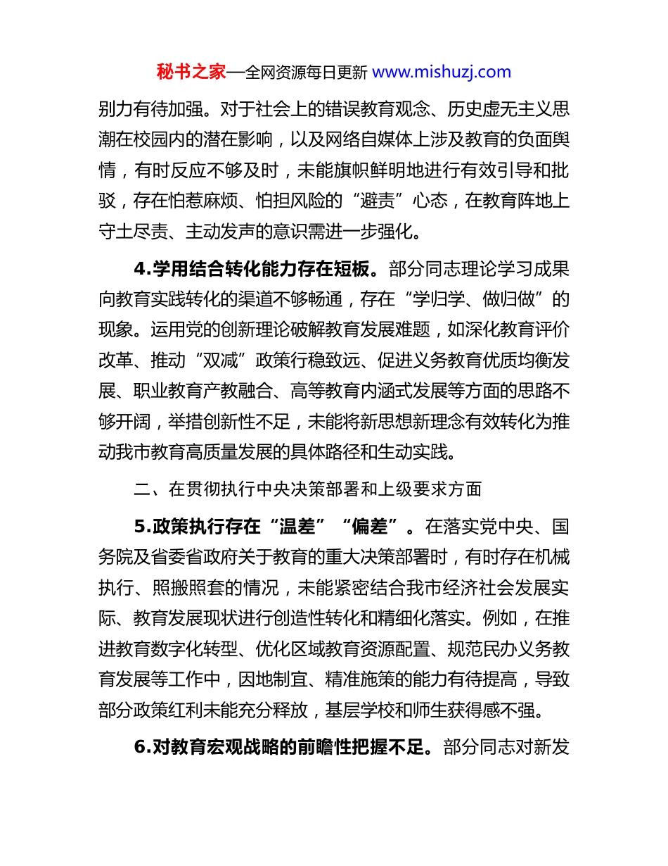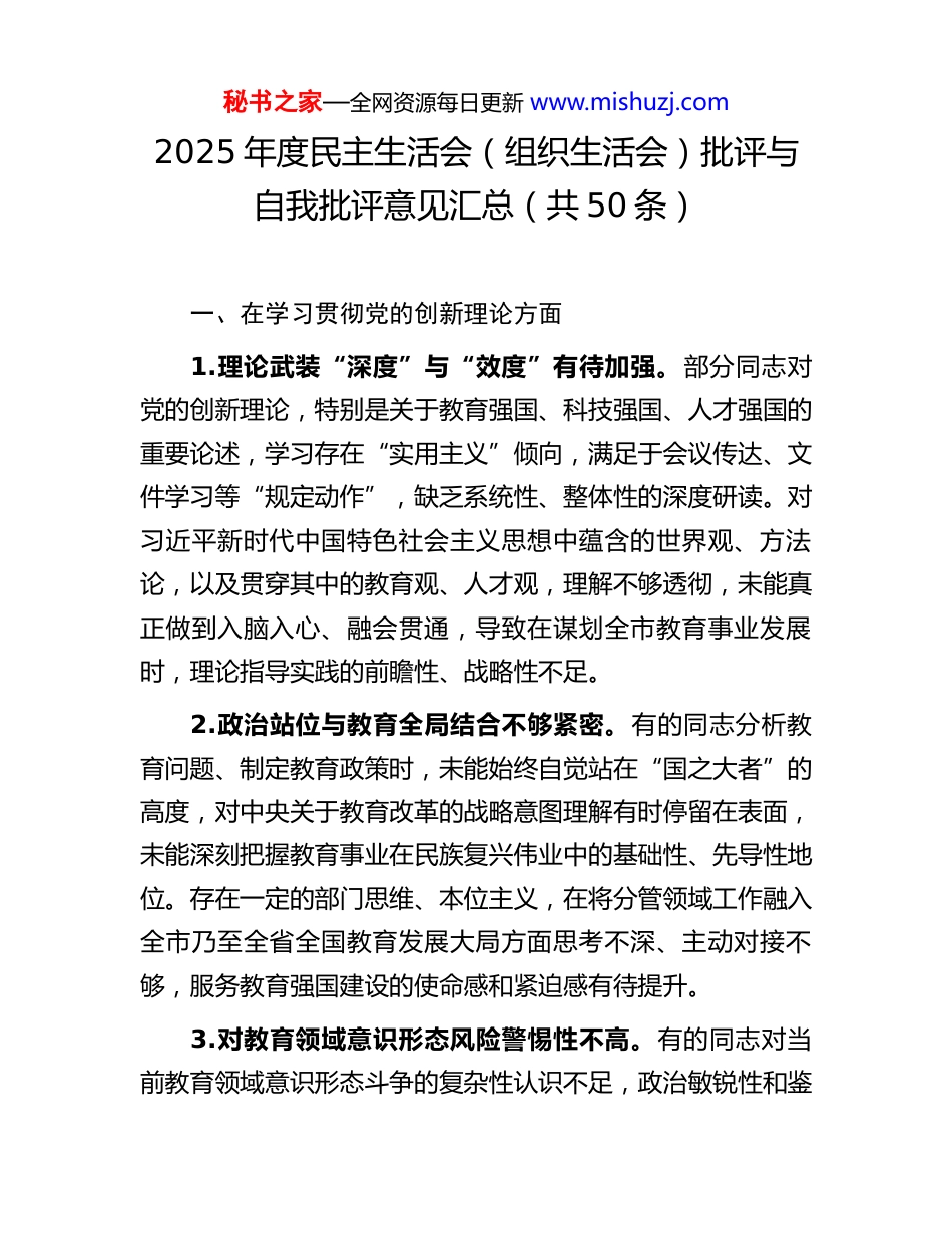 秘书之家—全网资源每日更新 www.mishuzj.com2025 年度民主生活会(组织生活会)批评与自我批评意见汇总(共 50 条)一、在学习贯彻党的创新理论方面1.理论武装“深度”与“效度”有待加强。部分同志对党的创新理论,特别是关于教育强国、科技强国、人才强国的重要论述,学习存在“实用主义”倾向,满足于会议传达、文件学习等“规定动作”,缺乏系统性、整体性的深度研读。对习近平新时代中国特色社会主义思想中蕴含的世界观、方法论,以及贯穿其中的教育观、人才观,理解不够透彻,未能真正做到入脑入心、融会贯通,导致在谋划全市教育事业发展时,理论指导实践的前瞻性、战略性不足。2.政治站位与教育全局结合不够紧密。有的同志分析教育问题、制定教育政策时,未能始终自觉站在“国之大者”的高度,对中央关于教育改革的战略意图理解有时停留在表面,未能深刻把握教育事业在民族复兴伟业中的基础性、先导性地位。存在一定的部门思维、本位主义,在将分管领域工作融入全市乃至全省全国教育发展大局方面思考不深、主动对接不够,服务教育强国建设的使命感和紧迫感有待提升。3.对教育领域意识形态风险警惕性不高。有的同志对当前教育领域意识形态斗争的复杂性认识不足,政治敏锐性和鉴秘书之家—全网资源每日更新 www.mishuzj.com别力有待加强。对于社会上的错误教育观念、历史虚无主义思潮在校园内的潜在影响,以及网络自媒体上涉及教育的负面舆情,有时反应不够及时,未能旗帜鲜明地进行有效引导和批驳,存在怕惹麻烦、怕担风险的“避责”心态,在教育阵地上守土尽责、主动发声的意识需进一步强化。4.学用结合转化能力存在短板。部分同志理论学习成果向教育实践转化的渠道不够畅通,存在“学归学、做归做”的现象。运用党的创新理论破解教育发展难题,如深化教育评价改革、推动“双减”政策行稳致远、促进义务教育优质均衡发展、职业教育产教融合、高等教育内涵式发展等方面的思路不够开阔,举措创新性不足,未能将新思想新理念有效转化为推动我市教育高质量发展的具体路径和生动实践。二、在贯彻执行中央决策部署和上级要求方面5.政策执行存在“温差”“偏差”。在落实党中央、国务院及省委省政府关于教育的重大决策部署时,有时存在机械执行、照搬照套的情况,未能紧密结合我市经济社会发展实际、教育发展现状进行创造性转化和精细化落实。例如,在推进教育数字化转型、优化区域教育资源配置、规范民办义务教育发展等工作中,因地制宜、精准施策的能力有待提高,导致部分政策红利未能充分释放,基层学校和师生获得感不强。6.对教育宏观战略的前瞻性把握不足。部分同志对新发秘书之家—全网资源每日更新 www.mishuzj.com展阶段教育面临的新形势、新挑战研究不够深入,对人口结构变化、科技革命影响、社会需求变迁等给教育带来的深远影响预判不足。在谋划“十五五”教育发展规划、布局未来教育发展新赛道时,战略眼光和前瞻性思维有待拓展,系统谋划、长远布局的深度和广度不够。7.攻坚克难的锐气和担当精神有所减弱。面对教育领域长期存在的“硬骨头”,如破解“择校热”、减轻教师不合理负担、改善乡村小规模学校办学条件、防范校园安全风险等难题时,有的同志存在畏难情绪和路径依赖,缺乏敢闯敢试、一抓到底的决心和魄力。主动“啃硬骨头”、接“烫手山芋”的劲头不足,有时存在绕着问题走、等待上级指示的现象。8.“钉钉子”抓落实的韧劲不足。一些重点工作部署后,跟踪问效、督促检查不够严格,缺乏一抓到底的韧劲。对于年度教育工作要点、重点改革任务清单,存在“重部署、轻落实”的情况,对推进过程中遇到的堵点、难点问题,未能及时有效协调解决,导致部分工作进展缓慢或效果不佳,未能形成有效闭环。三、在践行正确政绩观、推动高质量发展方面9.政绩观存在一定偏差。有的同志在工作中,有时过于关注短期内容易出成绩、显亮点的工作(如学科竞赛获奖、升学率等),而对夯实教育基础、促进教育公平、提升学生综合秘书之家—全网资源每日更新 www.mishuzj.com素养等打基础、利长远的工作投入精力不足。未能完全将“办好人民满意的教育”作为一切工作的出发点和落...