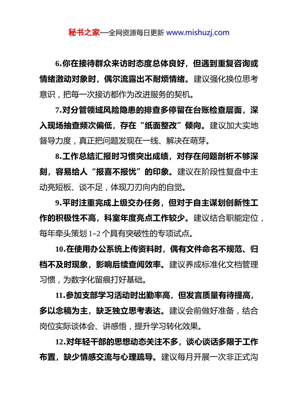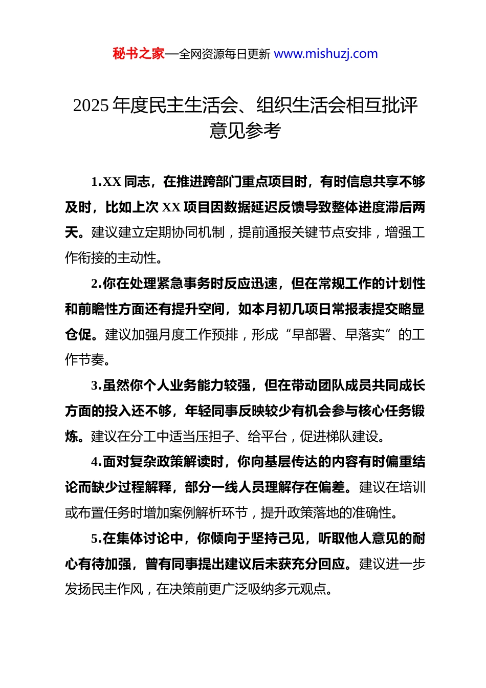 秘书之家—全网资源每日更新 www.mishuzj.com2025 年度民主生活会、组织生活会相互批评意见参考 1.XX 同志,在推进跨部门重点项目时,有时信息共享不够及时,比如上次 XX 项目因数据延迟反馈导致整体进度滞后两天。建议建立定期协同机制,提前通报关键节点安排,增强工作衔接的主动性。2.你在处理紧急事务时反应迅速,但在常规工作的计划性和前瞻性方面还有提升空间,如本月初几项日常报表提交略显仓促。建议加强月度工作预排,形成“早部署、早落实”的工作节奏。3.虽然你个人业务能力较强,但在带动团队成员共同成长方面的投入还不够,年轻同事反映较少有机会参与核心任务锻炼。建议在分工中适当压担子、给平台,促进梯队建设。4.面对复杂政策解读时,你向基层传达的内容有时偏重结论而缺少过程解释,部分一线人员理解存在偏差。建议在培训或布置任务时增加案例解析环节,提升政策落地的准确性。5.在集体讨论中,你倾向于坚持己见,听取他人意见的耐心有待加强,曾有同事提出建议后未获充分回应。建议进一步发扬民主作风,在决策前更广泛吸纳多元观点。秘书之家—全网资源每日更新 www.mishuzj.com6.你在接待群众来访时态度总体良好,但遇到重复咨询或情绪激动对象时,偶尔流露出不耐烦情绪。建议强化换位思考意识,把每一次接访都作为改进服务的契机。7.对分管领域风险隐患的排查多停留在台账检查层面,深入现场抽查频次偏低,存在“纸面整改”倾向。建议加大实地督导力度,真正把问题发现在一线、解决在萌芽。8.工作总结汇报时习惯突出成绩,对存在问题剖析不够深刻,容易给人“报喜不报忧”的印象。建议在阶段性复盘中主动亮短板、谈不足,体现刀刃向内的自觉。9.平时注重完成上级交办任务,但对于自主谋划创新性工作的积极性不高,科室年度亮点工作较少。建议结合职能定位,每年牵头策划 1–2 个具有突破性的专项试点。10.在使用办公系统上传资料时,偶有文件命名不规范、归档不及时现象,影响后续查阅效率。建议养成标准化文档管理习惯,为数字化留痕打好基础。11.参加支部学习活动时出勤率高,但发言质量有待提高,多以念稿为主,缺乏独立思考表达。建议会前做好准备,结合岗位实际谈体会、讲感悟,提升学习转化效果。12.对年轻干部的思想动态关注不多,谈心谈话多限于工作布置,缺少情感交流与心理疏导。建议每月开展一次非正式沟秘书之家—全网资源每日更新 www.mishuzj.com通,营造组织温暖氛围。13.推动重点工作时偏重结果导向,对过程中的干部承受压力考虑不足,个别同志反映节奏过紧。建议在抓落实的同时注意劳逸结合,科学调配人力资源。14.政策宣传方式仍以发放材料、集中宣讲为主,新媒体手段运用不足,青年群体覆盖面有限。建议探索短视频、图文推送等形式,增强传播吸引力。15.在应对突发事件处置中协调有力,但事后复盘机制不健全,经验未能有效固化推广。建议建立应急事件“一案一总结”制度,推动由个案应对向系统防范转变。16.分管工作中对上级精神传达较快,但结合本单位实际细化落实方案的速度较慢,存在“中间梗阻”。建议接到文件后第一时间组织研读,制定操作性强的实施细则。17.你在文字材料写作上功底扎实,但有时过于追求文采修饰,导致篇幅冗长、重点模糊。建议坚持“短实新”文风,突出核心信息,提升材料实用性。18.对党风廉政建设重视程度有待加强,廉政提醒谈话记录简单,内容千篇一律。建议针对不同岗位风险点定制化谈话提纲,增强警示教育针对性。19.开展调查研究时偏好去基础较好的单位,对困难多、矛秘书之家—全网资源每日更新 www.mishuzj.com盾集中的地方走访相对较少。建议优化调研路线设计,真正沉下去听真话、察实情。20.承担专项任务期间能够加班加点,但长期高强度运转下出现倦怠苗头,影响持续战斗力。建议合理安排作息,保持身心健康,做到可持续履职。21.在推动改革举措落地过程中,对可能引发的负面反应预判不足,群众解释工作不到位。建议重大调整前开展风险评估,并配套做好宣传引导预案。22.科室内部职责边界划分不够清晰,个别工作出现多人不管或多头管理现象。建议牵头梳理岗位职责清单,明确主责与配合责任...