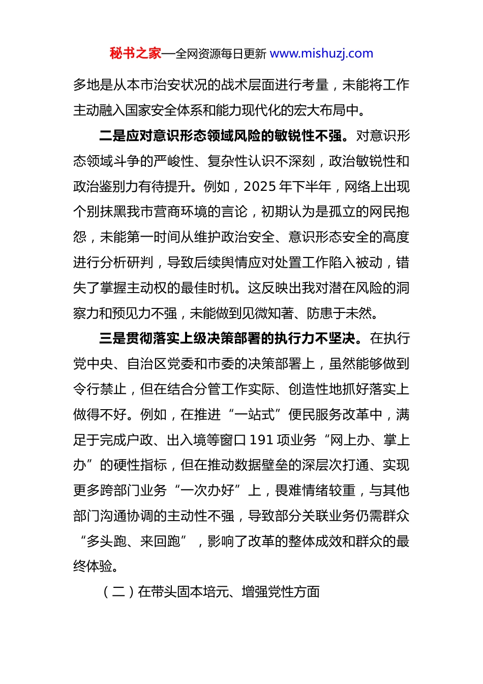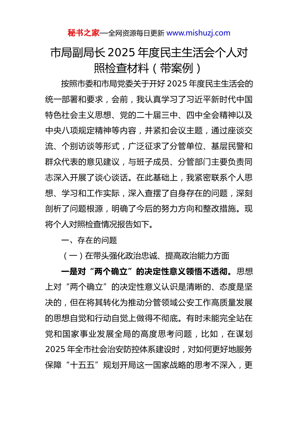秘书之家—全网资源每日更新 www.mishuzj.com市局副局长 2025 年度民主生活会个人对照检查材料(带案例)按照市委和市局党委关于开好 2025 年度民主生活会的统一部署和要求,会前,我认真学习了习近平新时代中国特色社会主义思想、党的二十届三中、四中全会精神以及中央八项规定精神等内容,并紧扣会议主题,通过座谈交流、个别访谈等形式,广泛征求了分管单位、基层民警和群众代表的意见建议,与班子成员、分管部门主要负责同志深入开展了谈心谈话。在此基础上,我紧密联系个人思想、学习和工作实际,深入查摆了自身存在的问题,深刻剖析了问题根源,明确了今后的努力方向和整改措施。现将个人对照检查情况报告如下。一、存在的问题(一)在带头强化政治忠诚、提高政治能力方面一是对“两个确立”的决定性意义领悟不透彻。思想上对“两个确立”的决定性意义认识是清晰的、态度是坚决的,但在将其转化为推动分管领域公安工作高质量发展的思想自觉和行动自觉上做得不彻底。有时未能完全站在党和国家事业发展全局的高度思考问题,比如,在谋划2025 年全市社会治安防控体系建设时,对如何更好地服务保障“十五五”规划开局这一国家战略的思考不深入,更秘书之家—全网资源每日更新 www.mishuzj.com多地是从本市治安状况的战术层面进行考量,未能将工作主动融入国家安全体系和能力现代化的宏大布局中。二是应对意识形态领域风险的敏锐性不强。对意识形态领域斗争的严峻性、复杂性认识不深刻,政治敏锐性和政治鉴别力有待提升。例如,2025 年下半年,网络上出现个别抹黑我市营商环境的言论,初期认为是孤立的网民抱怨,未能第一时间从维护政治安全、意识形态安全的高度进行分析研判,导致后续舆情应对处置工作陷入被动,错失了掌握主动权的最佳时机。这反映出我对潜在风险的洞察力和预见力不强,未能做到见微知著、防患于未然。三是贯彻落实上级决策部署的执行力不坚决。在执行党中央、自治区党委和市委的决策部署上,虽然能够做到令行禁止,但在结合分管工作实际、创造性地抓好落实上做得不好。例如,在推进“一站式”便民服务改革中,满足于完成户政、出入境等窗口 191 项业务“网上办、掌上办”的硬性指标,但在推动数据壁垒的深层次打通、实现更多跨部门业务“一次办好”上,畏难情绪较重,与其他部门沟通协调的主动性不强,导致部分关联业务仍需群众“多头跑、来回跑”,影响了改革的整体成效和群众的最终体验。(二)在带头固本培元、增强党性方面秘书之家—全网资源每日更新 www.mishuzj.com一是理论学习与实践运用结合不紧密。在学习习近平新时代中国特色社会主义思想时,系统性、全面性做得不好,存在“干什么学什么、缺什么补什么”的实用主义倾向。对党的二十届四中全会提出的“健全全面从严治党体系”等新论断新要求的学习,停留在通读公报、听取传达的层面,但在如何指导分管的经侦、禁毒等队伍建设,构建权责清晰、运行高效的内部监督体系方面,缺乏深入研究和具体举措,导致理论学习与公安实践“两张皮”现象依然存在。二是党性锤炼的自觉性主动性不高。作为一名在公安战线工作多年的老党员,有时会产生“歇歇脚、松口气”的念头,自我革命精神有所懈怠。党性分析和自我剖析的“辣味”不浓,习惯于“隔靴搔痒”,不愿真正触及思想深处的矛盾和问题。在参加党支部组织生活时,更多地是以领导身份作指导、提要求,而以普通党员身份接受教育接受监督的自觉性不强,批评与自我批评的武器运用得不好。三是价值观念的“总开关”拧得不牢固。在世界观、人生观、价值观的改造上自我要求不严格,艰苦奋斗、勤俭节约的意识有所淡化。例如,在审批分管部门的经费预算时,对于一些可开可不开的会议、可搞可不搞的活动,秘书之家—全网资源每日更新 www.mishuzj.com有时考虑到“提振士气”“搞好关系”,把关不严,审批放行。这反映出我在思想深处对享乐主义、奢靡之风的危害性认识不足,未能时时刻刻用共产党员的标准严格要求自己,防微杜渐的堤坝筑得不牢。(三)在带头敬畏人民、敬畏组织、敬畏法纪方面一是践行群众路线的方式方法不深入。落实“四下基层”制度不扎实...