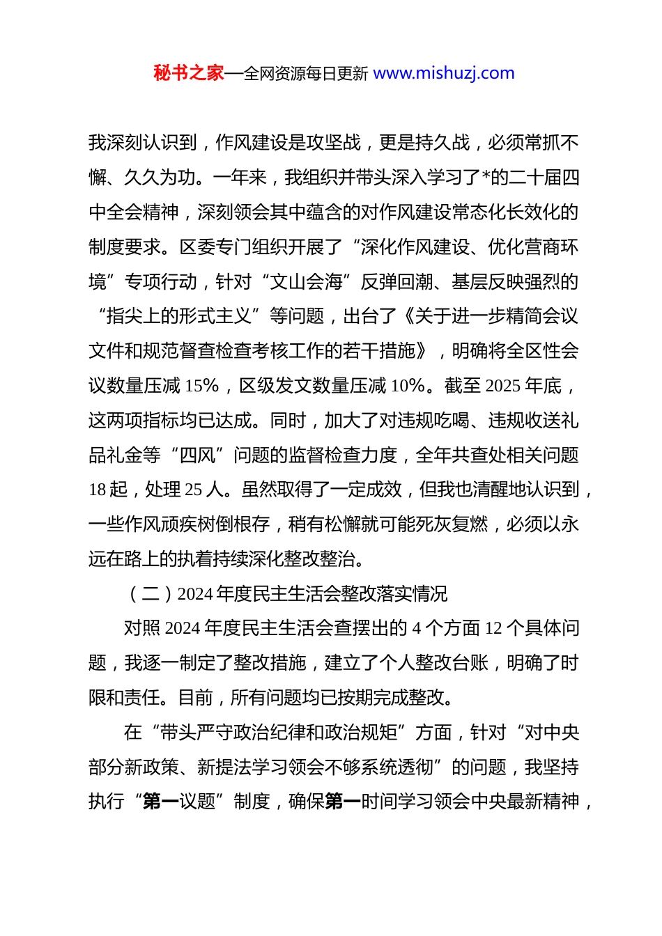 秘书之家—全网资源每日更新 www.mishuzj.com(36 篇)2025 年度民主生活会个人对照检查材料区委书记 2025 年度民主生活会个人对照检查材料(五个带头)根据区委关于召开 2025 年度民主生活会的统一安排,我紧扣本次民主生活会主题,在认真开展个人自学、积极参加区委理论学习中心组集中学习研讨的基础上,深入学习了**************思想,全面系统学习了*的二十届三中、四中全会精神和******重要讲话、****批示精神。同时,我严格按照要求,与区委班子成员、部分基层单位负责同志开展了深入的谈心谈话,广泛征求了意见建议,为开好这次民主生活会奠定了坚实的思想基础。下面,我结合思想和工作实际,进行深刻的*性分析和自我剖析,深入查摆问题、剖析根源,并明确整改方向。不妥之处,请同志们批评指正。一、之前问题整改整治情况(一)深入贯彻中央八项规定精神学习教育查摆问题整改整治情况2025 年,我始终把贯彻落实中央八项规定及其实施细则精神作为一项重要的政治任务来抓,坚持以身作则、以上率下。秘书之家—全网资源每日更新 www.mishuzj.com我深刻认识到,作风建设是攻坚战,更是持久战,必须常抓不懈、久久为功。一年来,我组织并带头深入学习了*的二十届四中全会精神,深刻领会其中蕴含的对作风建设常态化长效化的制度要求。区委专门组织开展了“深化作风建设、优化营商环境”专项行动,针对“文山会海”反弹回潮、基层反映强烈的“指尖上的形式主义”等问题,出台了《关于进一步精简会议文件和规范督查检查考核工作的若干措施》,明确将全区性会议数量压减 15%,区级发文数量压减 10%。截至 2025 年底,这两项指标均已达成。同时,加大了对违规吃喝、违规收送礼品礼金等“四风”问题的监督检查力度,全年共查处相关问题18 起,处理 25 人。虽然取得了一定成效,但我也清醒地认识到,一些作风顽疾树倒根存,稍有松懈就可能死灰复燃,必须以永远在路上的执着持续深化整改整治。(二)2024 年度民主生活会整改落实情况对照 2024 年度民主生活会查摆出的 4 个方面 12 个具体问题,我逐一制定了整改措施,建立了个人整改台账,明确了时限和责任。目前,所有问题均已按期完成整改。在“带头严守政治纪律和政治规矩”方面,针对“对中央部分新政策、新提法学习领会不够系统透彻”的问题,我坚持执行“第一议题”制度,确保第一时间学习领会中央最新精神,秘书之家—全网资源每日更新 www.mishuzj.com并牵头制定了区委常委会会前学法学规制度,个人政治判断力、政治领悟力、政治执行力得到进一步增强。在“带头增强*性、严守纪律、砥砺作风”方面,针对“下基层调研存在‘走马观花’现象”的问题,我严格落实“四下基层”制度,全年累计超过三分之一的工作时间深入镇街、村居和企业一线,特别是采取“四不两直”方式开展调研 15 次,有效解决了一批群众急难愁盼问题,如推动解决了老旧小区加装电梯资金筹措难等问题。在“带头在遵规守纪、清正廉洁前提下勇于担责、敢于创新”方面,针对“面对历史遗留的烂尾楼盘问题存在畏难情绪”的问题,我牵头成立工作专班,亲自协调市级部门和司法机关,成功引入社会资本盘活了停滞近十年的“**商业城”项目,保障了数百户购房群众的合法权益,展现了担当作为。在“带头履行全面从严治*政治责任”方面,针对“对分管领域和部门的*风廉政建设压力传导存在层层递减现象”的问题,我亲自带队对全区 10 个重点单位开展了全面从严治*主体责任落实情况专项督查,约谈了 3 位“一把手”,推动完善了廉政风险防控机制 22 项,管*治*责任链条进一步拧紧。总的来看,去年的整改工作取得了实效,但仍有少数问题需要长期坚持、持续深化,例如将调研成果高效转化为具体政秘书之家—全网资源每日更新 www.mishuzj.com策措施的长效机制仍需进一步优化,这也是我在今后工作中需要持续关注和努力的方向。二、存在的问题紧扣本次民主生活会主题,对照 5 个方面要求,我深入查摆了自身存在的问题和不足。(一)在带头强化政治忠诚、提高政治能力方面一是将“两个确立”的决定性意义内化于心、外化于行的结合度还不够紧密。...