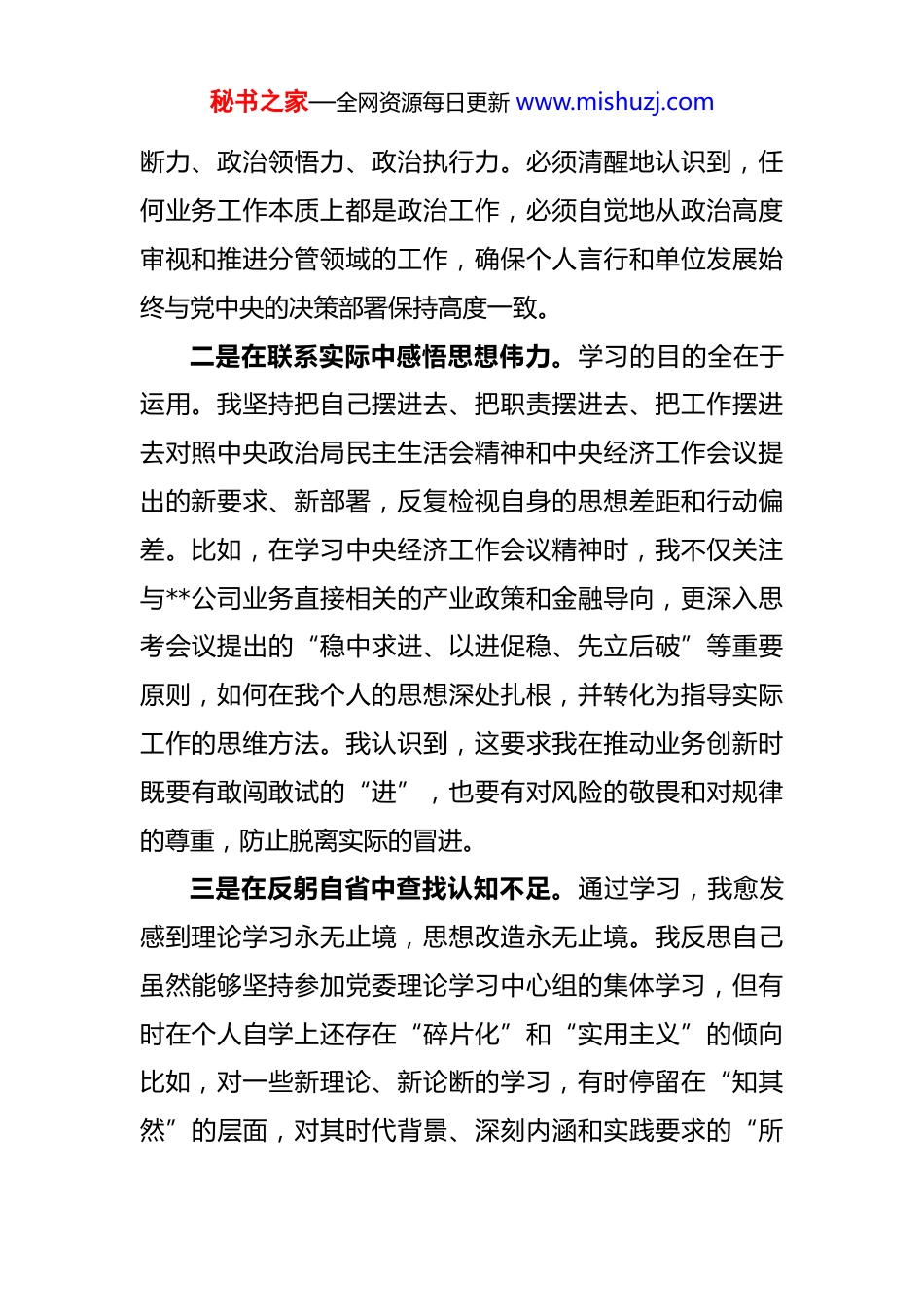 秘书之家—全网资源每日更新 www.mishuzj.com在民主生活会会前专题学习会上的研讨发言同志们:根据单位党委的统一安排,今天我们召开这次专题学习会,主要任务是深入学习领会中央政治局民主生活会精神与中央经济工作会议精神,为高质量开好即将召开的年度民主生活会打下坚实的思想基础。下面,结合我的个人学习和思想实际,谈几点初步的认识和体会,不妥之处,请同志们批评指正。一、深化理论武装,在对标对表中校准思想航向思想是行动的先导,理论是实践的指南。民主生活会既是一次全面的“政治体检”,也是一次深刻的思想洗礼要开好这次会议,首要任务就是把思想认识摆在第一位,真正做到学深悟透、融会贯通。正如相关研究指出的,会前学习是查摆问题、剖析根源的前提。一是在深学细悟中强化政治忠诚。通过本次集中学习,我重温了中央政治局民主生活会的相关报道和重要讲话精神,深刻感受到中央领导集体以身作则、以上率下的政治自觉和刀刃向内的彻底革命精神。这为全党树立了标杆、作出了示范。我深刻认识到,作为一名党员领导干部,必须时刻把政治纪律和政治规矩挺在前面,不断提高政治判秘书之家—全网资源每日更新 www.mishuzj.com断力、政治领悟力、政治执行力。必须清醒地认识到,任何业务工作本质上都是政治工作,必须自觉地从政治高度审视和推进分管领域的工作,确保个人言行和单位发展始终与党中央的决策部署保持高度一致。二是在联系实际中感悟思想伟力。学习的目的全在于运用。我坚持把自己摆进去、把职责摆进去、把工作摆进去对照中央政治局民主生活会精神和中央经济工作会议提出的新要求、新部署,反复检视自身的思想差距和行动偏差。比如,在学习中央经济工作会议精神时,我不仅关注与**公司业务直接相关的产业政策和金融导向,更深入思考会议提出的“稳中求进、以进促稳、先立后破”等重要原则,如何在我个人的思想深处扎根,并转化为指导实际工作的思维方法。我认识到,这要求我在推动业务创新时既要有敢闯敢试的“进”,也要有对风险的敬畏和对规律的尊重,防止脱离实际的冒进。三是在反躬自省中查找认知不足。通过学习,我愈发感到理论学习永无止境,思想改造永无止境。我反思自己虽然能够坚持参加党委理论学习中心组的集体学习,但有时在个人自学上还存在“碎片化”和“实用主义”的倾向比如,对一些新理论、新论断的学习,有时停留在“知其然”的层面,对其时代背景、深刻内涵和实践要求的“所秘书之家—全网资源每日更新 www.mishuzj.com以然”钻研得不够深、不够透。这种学习上的欠缺,直接影响了思想认识的高度和工作谋划的深度,这是我必须正视并加以改进的。二、坚持问题导向,以动真碰硬的态度剖析自我民主生活会的核心在于严肃开展批评和自我批评。自我批评必须要有勇气和担当,敢于揭短亮丑,触及思想和灵魂的深处。对照学习内容和党员标准,结合同志们在会前谈心谈话中对我提出的宝贵意见,我初步查摆了自身存在的一些问题和不足。一是在理想信念的锤炼上还需持续加压。我始终坚信共产主义远大理想,但在具体的实践中,有时会不自觉地把远大理想和现实工作割裂开来。面对当前错综复杂的经济金融形势和公司转型发展的艰巨任务,偶尔会产生畏难情绪和本领恐慌,攻坚克难的锐气和斗争精神有所减弱。究其根源,还是在于党性修养的“内功”练得不够扎实未能时时刻刻用最高标准来要求自己,导致在面对重大挑战时,思想深处的韧劲和定力出现松动。二是在宗旨意识的践行上还需继续深化。作为班子成员,我深知自己手中的权力来自人民,必须服务于企业发展和职工群众。在工作中,我也努力做到深入基层、了解实情。但我必须坦诚,这种“深入”的质量还有待提高。秘书之家—全网资源每日更新 www.mishuzj.com有时下去调研,听取汇报、开座谈会多,与一线员工进行“零距离”、不设防的谈心交流少;关心工作任务完成情况多,对员工思想动态、家庭困难等方面的关心关怀少。这反映出我内心深处的群众观念还不够牢固,没有真正做到从根本上解决“为了谁、依靠谁、我是谁”的问题。三是在工作作风的改进上还需更加严格。我反思,随着工作阅历的增长,有时会不自觉...
