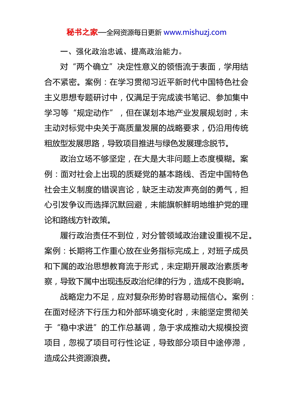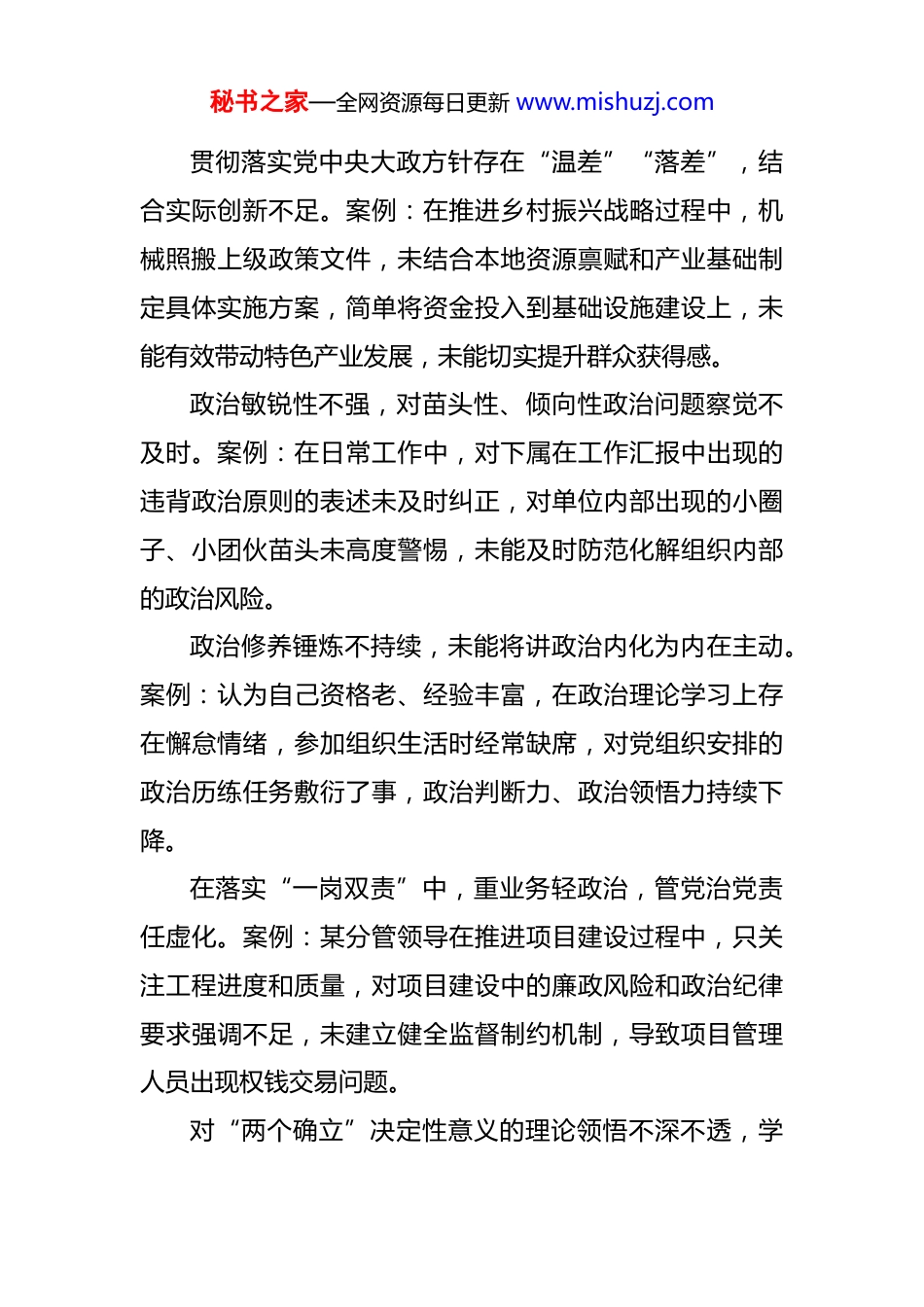 秘书之家—全网资源每日更新 www.mishuzj.com一、强化政治忠诚、提高政治能力。对“两个确立”决定性意义的领悟流于表面,学用结合不紧密。案例:在学习贯彻习近平新时代中国特色社会主义思想专题研讨中,仅满足于完成读书笔记、参加集中学习等“规定动作”,但在谋划本地产业发展规划时,未主动对标党中央关于高质量发展的战略要求,仍沿用传统粗放型发展思路,导致项目推进与绿色发展理念脱节。政治立场不够坚定,在大是大非问题上态度模糊。案例:面对社会上出现的质疑党的基本路线、否定中国特色社会主义制度的错误言论,缺乏主动发声亮剑的勇气,担心引发争议而选择沉默回避,未能旗帜鲜明地维护党的理论和路线方针政策。履行政治责任不到位,对分管领域政治建设重视不足。案例:长期将工作重心放在业务指标完成上,对班子成员和下属的政治思想教育流于形式,未定期开展政治素质考察,导致下属中出现违反政治纪律的行为,造成不良影响。战略定力不足,应对复杂形势时容易动摇信心。案例:在面对经济下行压力和外部环境变化时,未能坚定贯彻关于“稳中求进”的工作总基调,急于求成推动大规模投资项目,忽视了项目可行性论证,导致部分项目中途停滞,造成公共资源浪费。秘书之家—全网资源每日更新 www.mishuzj.com贯彻落实党中央大政方针存在“温差”“落差”,结合实际创新不足。案例:在推进乡村振兴战略过程中,机械照搬上级政策文件,未结合本地资源禀赋和产业基础制定具体实施方案,简单将资金投入到基础设施建设上,未能有效带动特色产业发展,未能切实提升群众获得感。政治敏锐性不强,对苗头性、倾向性政治问题察觉不及时。案例:在日常工作中,对下属在工作汇报中出现的违背政治原则的表述未及时纠正,对单位内部出现的小圈子、小团伙苗头未高度警惕,未能及时防范化解组织内部的政治风险。政治修养锤炼不持续,未能将讲政治内化为内在主动。案例:认为自己资格老、经验丰富,在政治理论学习上存在懈怠情绪,参加组织生活时经常缺席,对党组织安排的政治历练任务敷衍了事,政治判断力、政治领悟力持续下降。在落实“一岗双责”中,重业务轻政治,管党治党责任虚化。案例:某分管领导在推进项目建设过程中,只关注工程进度和质量,对项目建设中的廉政风险和政治纪律要求强调不足,未建立健全监督制约机制,导致项目管理人员出现权钱交易问题。对“两个确立”决定性意义的理论领悟不深不透,学秘书之家—全网资源每日更新 www.mishuzj.com用脱节。在组织本单位专题学习时,仅满足于传达原文、完成学习次数,未结合工作实际深入研讨其核心要义与实践要求。例如,在学习贯彻高质量发展相关论述时,仅停留在记笔记、写心得的表面层面,未能将“两个确立”的政治引领作用与本地区产业转型升级工作深度融合,导致制定的产业扶持政策缺乏系统性和前瞻性,在应对市场波动时未能有效发挥政策效能,3 个重点扶持项目因规划不科学出现进度滞后问题。政治敏锐性不足,对意识形态领域风险防范意识薄弱。面对网络传播的各类信息,缺乏主动甄别和警惕性,未能及时发现潜在的政治风险隐患。例如,某网络平台出现关于本单位重大项目建设的不实传言,涉及资金使用和工程质量等敏感内容,初期未引起足够重视,未及时启动舆情应对机制,导致传言扩散蔓延,引发部分群众误解和质疑损害了单位公信力,后续花费大量精力开展辟谣工作才逐步平息。落实“两个维护”存在温差落差,执行上级决策部署不够坚决。在推进跨区域生态环境联合整治工作中,因涉及本地部分企业整改成本较高,担心影响地方短期经济指标,出现犹豫观望态度,未严格按照上级要求的时间节点推进整治工作。例如,上级明确要求 3 个月内完成辖区内秘书之家—全网资源每日更新 www.mishuzj.com12 家污染企业的整改关停,但实际推进中因过度考虑企业诉求,协调力度不足,导致 4 家企业未能按时完成整改,影响了区域生态环境治理整体成效。政治理论学习长效机制不健全,学习系统性和针对性缺失。学习计划制定流于形式,多以集中传达文件、观看教育影片为主,缺乏分层分类的学习设计和实践研讨环节例如,全年组织的 20 ...