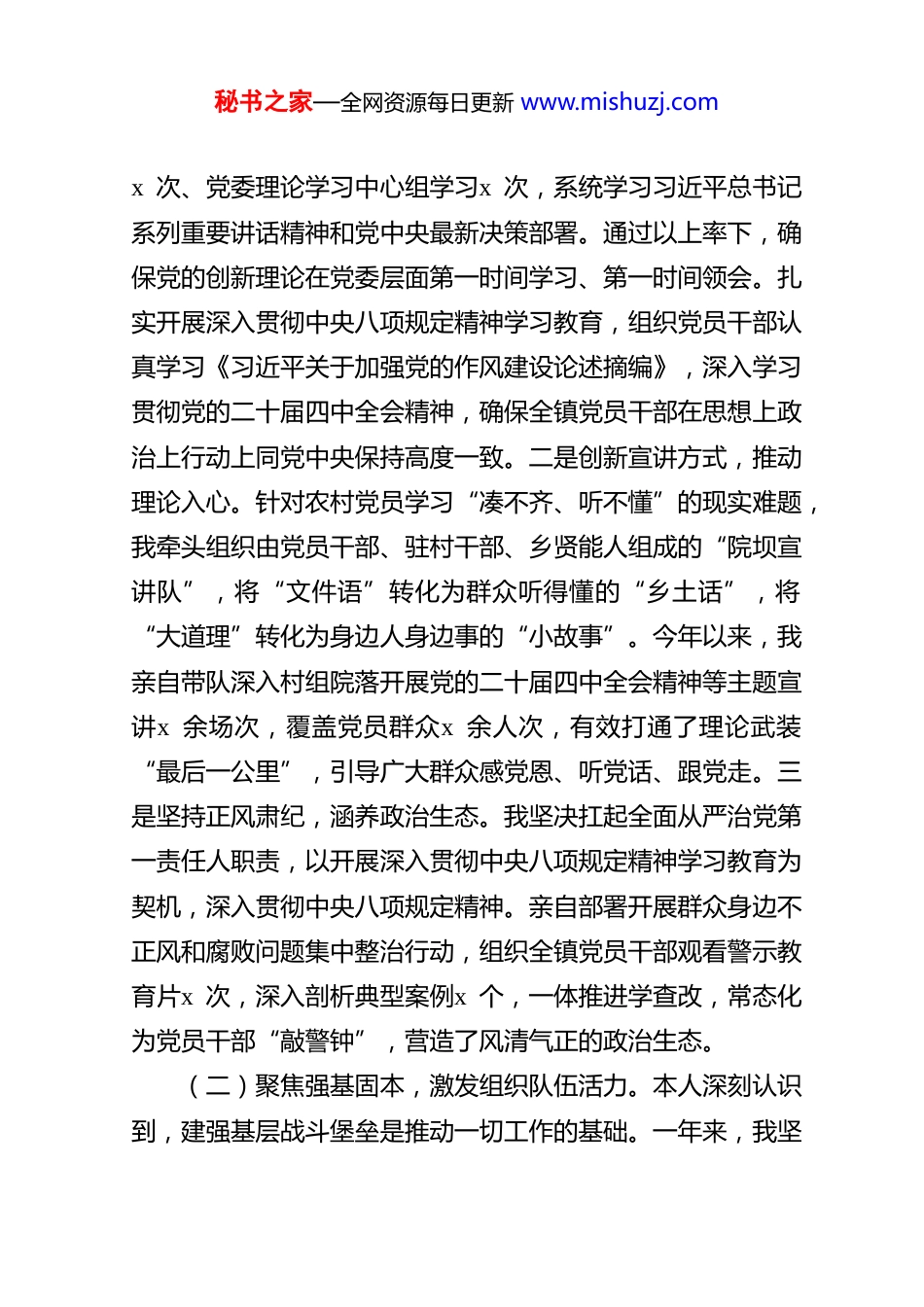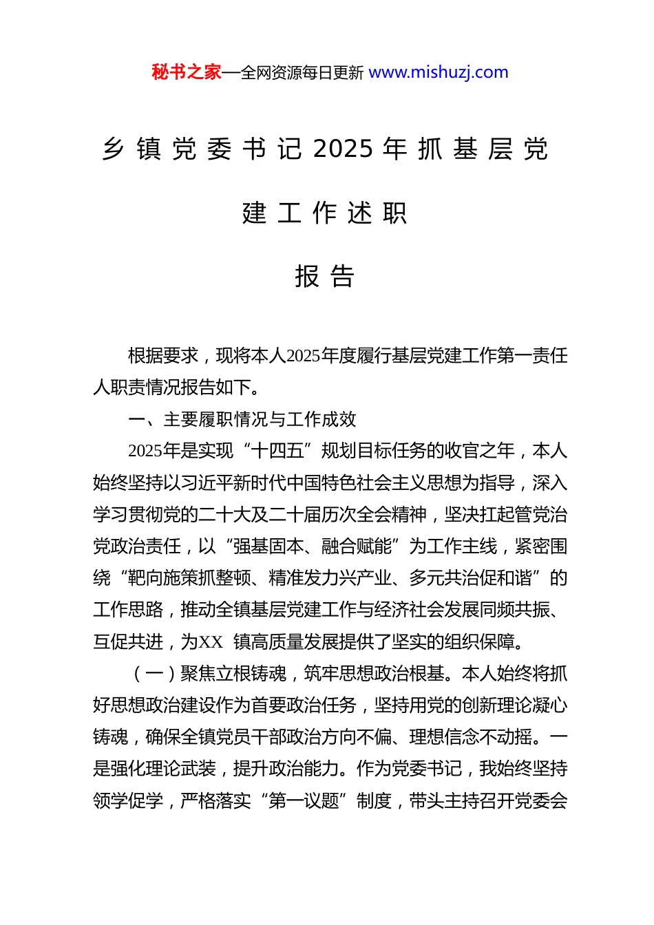 秘书之家—全网资源每日更新 www.mishuzj.com乡 镇 党 委 书 记 2025 年 抓 基 层 党建 工 作 述 职报 告根据要求,现将本人2025年度履行基层党建工作第一责任人职责情况报告如下。一、主要履职情况与工作成效2025年是实现“十四五”规划目标任务的收官之年,本人始终坚持以习近平新时代中国特色社会主义思想为指导,深入学习贯彻党的二十大及二十届历次全会精神,坚决扛起管党治党政治责任,以“强基固本、融合赋能”为工作主线,紧密围绕“靶向施策抓整顿、精准发力兴产业、多元共治促和谐”的工作思路,推动全镇基层党建工作与经济社会发展同频共振、互促共进,为XX 镇高质量发展提供了坚实的组织保障。(一)聚焦立根铸魂,筑牢思想政治根基。本人始终将抓好思想政治建设作为首要政治任务,坚持用党的创新理论凝心铸魂,确保全镇党员干部政治方向不偏、理想信念不动摇。一是强化理论武装,提升政治能力。作为党委书记,我始终坚持领学促学,严格落实“第一议题”制度,带头主持召开党委会秘书之家—全网资源每日更新 www.mishuzj.comx 次、党委理论学习中心组学习x 次,系统学习习近平总书记系列重要讲话精神和党中央最新决策部署。通过以上率下,确保党的创新理论在党委层面第一时间学习、第一时间领会。扎实开展深入贯彻中央八项规定精神学习教育,组织党员干部认真学习《习近平关于加强党的作风建设论述摘编》,深入学习贯彻党的二十届四中全会精神,确保全镇党员干部在思想上政治上行动上同党中央保持高度一致。二是创新宣讲方式,推动理论入心。针对农村党员学习“凑不齐、听不懂”的现实难题,我牵头组织由党员干部、驻村干部、乡贤能人组成的“院坝宣讲队”,将“文件语”转化为群众听得懂的“乡土话”,将“大道理”转化为身边人身边事的“小故事”。今年以来,我亲自带队深入村组院落开展党的二十届四中全会精神等主题宣讲x 余场次,覆盖党员群众x 余人次,有效打通了理论武装“最后一公里”,引导广大群众感党恩、听党话、跟党走。三是坚持正风肃纪,涵养政治生态。我坚决扛起全面从严治党第一责任人职责,以开展深入贯彻中央八项规定精神学习教育为契机,深入贯彻中央八项规定精神。亲自部署开展群众身边不正风和腐败问题集中整治行动,组织全镇党员干部观看警示教育片x 次,深入剖析典型案例x 个,一体推进学查改,常态化为党员干部“敲警钟”,营造了风清气正的政治生态。(二)聚焦强基固本,激发组织队伍活力。本人深刻认识到,建强基层战斗堡垒是推动一切工作的基础。一年来,我坚秘书之家—全网资源每日更新 www.mishuzj.com持把抓基层、打基础作为长远之计和固本之策,着力建强组织、配强队伍。一是精准施策,整顿软弱涣散组织。我始终把建强基层党组织作为基础性工程,严格落实“县委组织部指导、乡党委具体抓、村党支部抓落实”的三级整顿责任体系。针对个别村党组织存在的战斗力不强、服务能力弱等问题,我坚持亲自调研、精准“画像”,牵头实施“排队抓尾”行动。今年,通过深入研判,成功补齐了1 个村的党支部书记和x 个村的副主任,并针对性地指导其发展蜂蜜、林下养殖等特色集体经济产业,有效激发了后进村的内生动力。二是拓宽视野,建强后备干部队伍。为解决村级干部队伍青黄不接的问题,我提出并实施了村级后备力量“雏雁计划”。坚持政治标准,亲自把关,从农村致富带头人、优秀退役军人、返乡本土大学生等群体中,精心选拔储备村级后备力量x 名。同时,我主导建立了“一人一档、结对帮带”培养机制,通过交任务、压担子,让年轻后备干部在乡村振兴一线经风雨、壮筋骨,打造了一支懂政策、能致富、善管理的新时代基层干部队伍。三是多措并举,提升干部综合素养。我高度重视党员干部的能力提升,深入实施村(社区)干部学历能力“双提升”计划。通过“走出去”与“引进来”相结合的方式,今年共组织村“两委”干部、农村党员等到先进地区考察学习、参加专题培训x 余人次,并成功帮助x 名在职村干部提升了学历层次。这些举措显著提升了基秘书之家—全网资源每日更新 www.mishuzj.com层干部的政治理论水平和综合业...