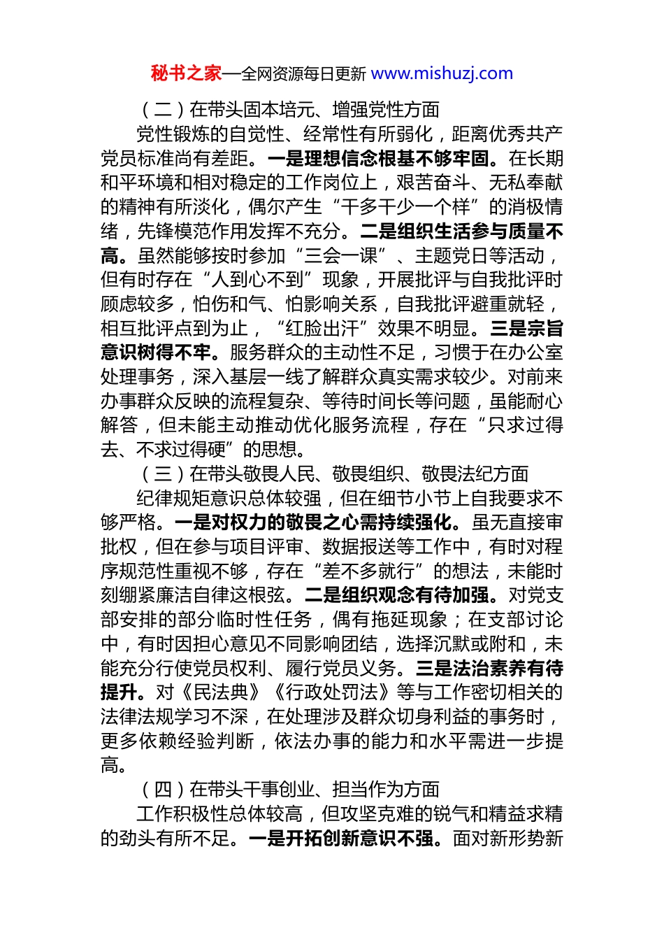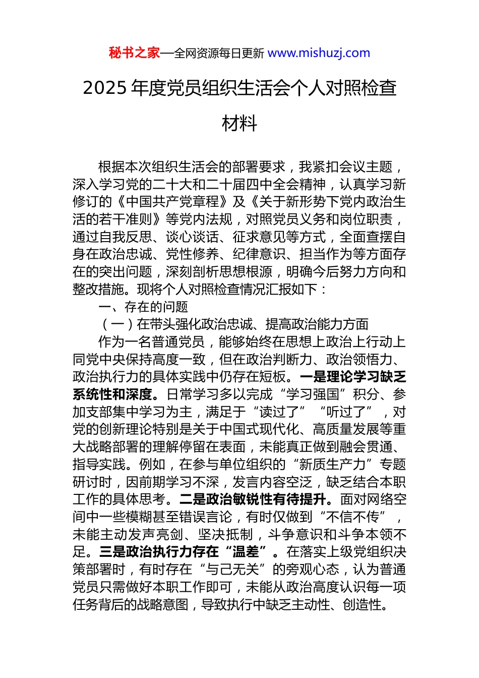 秘书之家—全网资源每日更新 www.mishuzj.com2025 年度党员组织生活会个人对照检查材料根据本次组织生活会的部署要求,我紧扣会议主题,深入学习党的二十大和二十届四中全会精神,认真学习新修订的《中国共产党章程》及《关于新形势下党内政治生活的若干准则》等党内法规,对照党员义务和岗位职责,通过自我反思、谈心谈话、征求意见等方式,全面查摆自身在政治忠诚、党性修养、纪律意识、担当作为等方面存在的突出问题,深刻剖析思想根源,明确今后努力方向和整改措施。现将个人对照检查情况汇报如下:一、存在的问题(一)在带头强化政治忠诚、提高政治能力方面作为一名普通党员,能够始终在思想上政治上行动上同党中央保持高度一致,但在政治判断力、政治领悟力、政治执行力的具体实践中仍存在短板。一是理论学习缺乏系统性和深度。日常学习多以完成“学习强国”积分、参加支部集中学习为主,满足于“读过了”“听过了”,对党的创新理论特别是关于中国式现代化、高质量发展等重大战略部署的理解停留在表面,未能真正做到融会贯通、指导实践。例如,在参与单位组织的“新质生产力”专题研讨时,因前期学习不深,发言内容空泛,缺乏结合本职工作的具体思考。二是政治敏锐性有待提升。面对网络空间中一些模糊甚至错误言论,有时仅做到“不信不传”,未能主动发声亮剑、坚决抵制,斗争意识和斗争本领不足。三是政治执行力存在“温差”。在落实上级党组织决策部署时,有时存在“与己无关”的旁观心态,认为普通党员只需做好本职工作即可,未能从政治高度认识每一项任务背后的战略意图,导致执行中缺乏主动性、创造性。秘书之家—全网资源每日更新 www.mishuzj.com(二)在带头固本培元、增强党性方面党性锻炼的自觉性、经常性有所弱化,距离优秀共产党员标准尚有差距。一是理想信念根基不够牢固。在长期和平环境和相对稳定的工作岗位上,艰苦奋斗、无私奉献的精神有所淡化,偶尔产生“干多干少一个样”的消极情绪,先锋模范作用发挥不充分。二是组织生活参与质量不高。虽然能够按时参加“三会一课”、主题党日等活动,但有时存在“人到心不到”现象,开展批评与自我批评时顾虑较多,怕伤和气、怕影响关系,自我批评避重就轻,相互批评点到为止,“红脸出汗”效果不明显。三是宗旨意识树得不牢。服务群众的主动性不足,习惯于在办公室处理事务,深入基层一线了解群众真实需求较少。对前来办事群众反映的流程复杂、等待时间长等问题,虽能耐心解答,但未能主动推动优化服务流程,存在“只求过得去、不求过得硬”的思想。(三)在带头敬畏人民、敬畏组织、敬畏法纪方面纪律规矩意识总体较强,但在细节小节上自我要求不够严格。一是对权力的敬畏之心需持续强化。虽无直接审批权,但在参与项目评审、数据报送等工作中,有时对程序规范性重视不够,存在“差不多就行”的想法,未能时刻绷紧廉洁自律这根弦。二是组织观念有待加强。对党支部安排的部分临时性任务,偶有拖延现象;在支部讨论中,有时因担心意见不同影响团结,选择沉默或附和,未能充分行使党员权利、履行党员义务。三是法治素养有待提升。对《民法典》《行政处罚法》等与工作密切相关的法律法规学习不深,在处理涉及群众切身利益的事务时,更多依赖经验判断,依法办事的能力和水平需进一步提高。(四)在带头干事创业、担当作为方面工作积极性总体较高,但攻坚克难的锐气和精益求精的劲头有所不足。一是开拓创新意识不强。面对新形势新秘书之家—全网资源每日更新 www.mishuzj.com任务,习惯沿用老经验、老办法,对数字化转型、智慧政务等新趋势研究不深、应用不多。例如,在推进本部门业务系统升级过程中,因担心操作复杂、影响效率,对新功能推广积极性不高。二是工作标准不够高。满足于完成领导交办的任务,缺乏“跳起来摘桃子”的进取精神,在文稿起草、数据分析等工作中,有时存在校对不细、逻辑不清等问题,影响工作质效。三是担当精神有待增强。面对急难险重任务时,偶尔存在“等靠要”思想,主动请缨、迎难而上的勇气不足;对同事工作中出现的疏漏,有时碍于情面未能及时提醒纠正,存在“老好人”心态。(五)在...