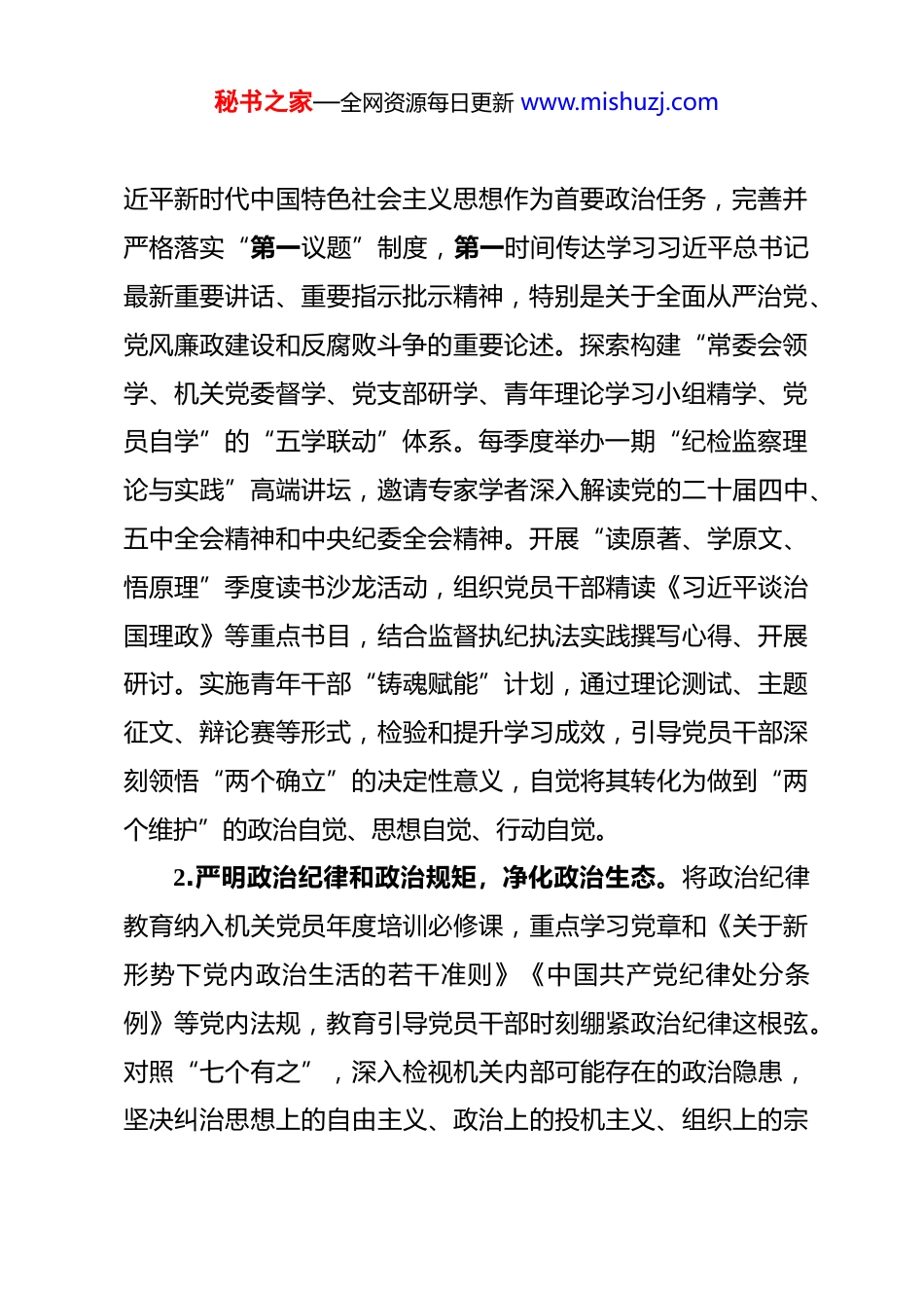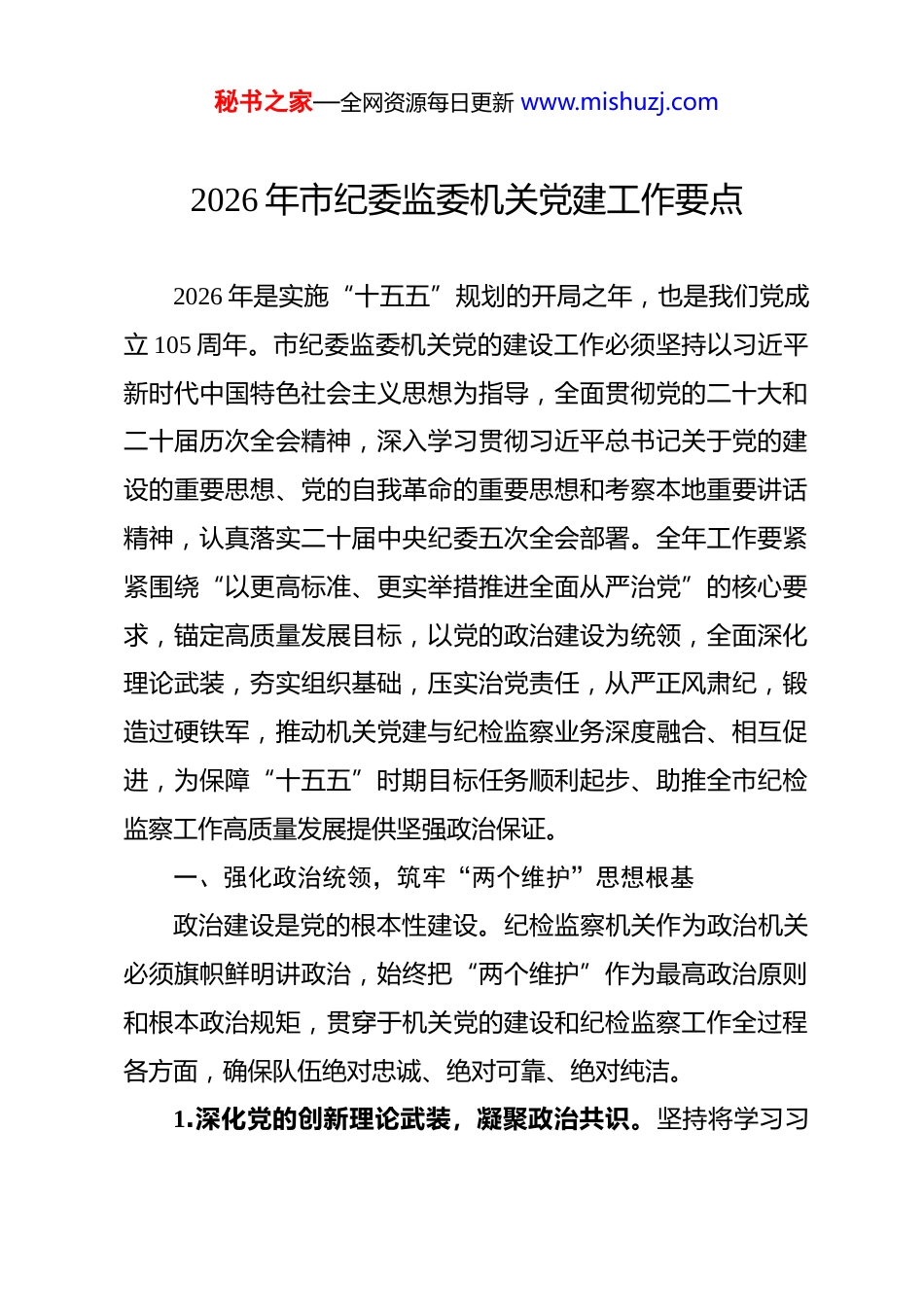秘书之家—全网资源每日更新 www.mishuzj.com2026 年市纪委监委机关党建工作要点 2026 年是实施“十五五”规划的开局之年,也是我们党成立 105 周年。市纪委监委机关党的建设工作必须坚持以习近平新时代中国特色社会主义思想为指导,全面贯彻党的二十大和二十届历次全会精神,深入学习贯彻习近平总书记关于党的建设的重要思想、党的自我革命的重要思想和考察本地重要讲话精神,认真落实二十届中央纪委五次全会部署。全年工作要紧紧围绕“以更高标准、更实举措推进全面从严治党”的核心要求,锚定高质量发展目标,以党的政治建设为统领,全面深化理论武装,夯实组织基础,压实治党责任,从严正风肃纪,锻造过硬铁军,推动机关党建与纪检监察业务深度融合、相互促进,为保障“十五五”时期目标任务顺利起步、助推全市纪检监察工作高质量发展提供坚强政治保证。一、强化政治统领,筑牢“两个维护”思想根基政治建设是党的根本性建设。纪检监察机关作为政治机关必须旗帜鲜明讲政治,始终把“两个维护”作为最高政治原则和根本政治规矩,贯穿于机关党的建设和纪检监察工作全过程各方面,确保队伍绝对忠诚、绝对可靠、绝对纯洁。1.深化党的创新理论武装,凝聚政治共识。坚持将学习习秘书之家—全网资源每日更新 www.mishuzj.com近平新时代中国特色社会主义思想作为首要政治任务,完善并严格落实“第一议题”制度,第一时间传达学习习近平总书记最新重要讲话、重要指示批示精神,特别是关于全面从严治党、党风廉政建设和反腐败斗争的重要论述。探索构建“常委会领学、机关党委督学、党支部研学、青年理论学习小组精学、党员自学”的“五学联动”体系。每季度举办一期“纪检监察理论与实践”高端讲坛,邀请专家学者深入解读党的二十届四中、五中全会精神和中央纪委全会精神。开展“读原著、学原文、悟原理”季度读书沙龙活动,组织党员干部精读《习近平谈治国理政》等重点书目,结合监督执纪执法实践撰写心得、开展研讨。实施青年干部“铸魂赋能”计划,通过理论测试、主题征文、辩论赛等形式,检验和提升学习成效,引导党员干部深刻领悟“两个确立”的决定性意义,自觉将其转化为做到“两个维护”的政治自觉、思想自觉、行动自觉。2.严明政治纪律和政治规矩,净化政治生态。将政治纪律教育纳入机关党员年度培训必修课,重点学习党章和《关于新形势下党内政治生活的若干准则》《中国共产党纪律处分条例》等党内法规,教育引导党员干部时刻绷紧政治纪律这根弦。对照“七个有之”,深入检视机关内部可能存在的政治隐患,坚决纠治思想上的自由主义、政治上的投机主义、组织上的宗秘书之家—全网资源每日更新 www.mishuzj.com派主义、工作上的本位主义、履责上的好人主义等突出问题。建立机关党员干部政治素质考察档案,在干部选拔任用、评优评先中突出政治标准,对政治不合格的“一票否决”。严肃查处机关内部存在的对党不忠诚不老实、阳奉阴违的“两面人”“两面派”行为,确保纪检监察队伍的纯洁性,维护党的团结统一。3.提升政治监督具体化精准化常态化水平,保障政令畅通。聚焦“国之大者”和“省之要事”、“市之重点”,制定出台《市纪委监委机关推动政治监督具体化精准化常态化工作指引》。围绕贯彻落实习近平总书记考察本地重要讲话精神、党的二十届四中全会决策部署以及“十五五”规划开局起步任务,动态建立年度政治监督重点事项清单和责任台账。创新“嵌入式”监督方式,在开展审查调查、巡视巡察、日常监督时,首先从政治视角审视问题、从政治高度研判问题、从政治层面报告问题。建立政治监督效果评估机制,定期对监督发现的问题进行政治生态“画像”和整改成效“回头看”,推动党中央重大决策部署和省委、市委工作要求在市纪委监委机关不折不扣执行到位,以强有力的政治监督护航高质量发展。4.严肃规范党内政治生活,锤炼政治品格。严格执行《关于新形势下党内政治生活的若干准则》,认真落实“三会一秘书之家—全网资源每日更新 www.mishuzj.com课”、民主生活会、组织生活会、民主评议党员、谈心谈话等制度,增强党内政治生活的政治性、时代性、原则性、战斗性。领导...