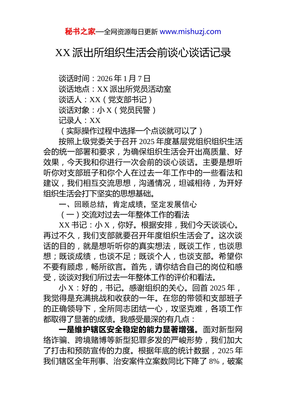 秘书之家—全网资源每日更新 www.mishuzj.comXX 派出所组织生活会前谈心谈话记录谈话时间:2026 年 1 月 7 日谈话地点:XX 派出所党员活动室谈话人:XX(党支部书记)谈话对象:小 X(党员民警)记录人:XX(实际操作过程中选择一个点谈就可以了)按照上级党委关于召开 2025 年度基层党组织组织生活会的统一部署和要求,为确保组织生活会开出高质量、好效果,今天我和你进行一次会前的谈心谈话。主要是想听听你对支部班子和你个人在过去一年工作中的一些看法和建议,我们相互交流思想,沟通情况,坦诚相待,为开好组织生活会打下坚实的思想基础。一、回顾总结,肯定成绩,坚定发展信心(一)交流对过去一年整体工作的看法XX 书记:小 X,你好。根据安排,我们今天谈谈心。再过不久,我们支部就要召开年度组织生活会了。这次谈话的目的,就是想听听你的真实想法,既谈工作,也谈思想;既谈成绩,也谈不足;既谈个人,也谈支部。希望你不要有顾虑,畅所欲言。首先,请你结合自己的岗位和感受,谈谈对我们所过去一年整体工作的评价和看法。小 X:好的,书记。感谢组织的关心。回首 2025 年,我觉得是充满挑战和收获的一年。在您的带领和支部班子的正确领导下,全所同志团结一心,攻坚克难,各项工作都取得了显著的成绩。我感受最深的有几点:一是维护辖区安全稳定的能力显著增强。面对新型网络诈骗、跨境赌博等新型犯罪多发的严峻形势,我们加大了打击和预防宣传的力度。根据年底的统计数据,2025 年我们辖区全年刑事、治安案件立案数同比下降了 8%,破案秘书之家—全网资源每日更新 www.mishuzj.com率达到了 96%,特别是系列性、团伙性案件的侦破取得了重大突破。这些成绩来之不易,是全所同志夜以继日奋斗的结果。二是服务人民群众的水平迈上了新台阶。我们深化“放管服”改革,优化窗口服务流程,户籍、出入境等业务的办理效率提升了近 20%。同时,我们积极开展“百万警进千万家”活动,主动上门为群众排忧解难,化解矛盾纠纷 300 余起,调解成功率超过 98%。在 2025 年市局组织的群众安全感和满意度测评中,我们辖区的得分高达98.5%,创下了历史新高。三是队伍的凝聚力和战斗力空前高涨。支部狠抓政治建警,常态化开展政治理论学习和党史学习教育,全体民警的政治判断力、政治领悟力、政治执行力得到了有效提升。大家心往一处想,劲往一处使,无论是日常巡逻防控,还是重大安保任务,都能做到召之即来、来之能战、战之必胜。(二)肯定成绩并指出努力方向XX 书记:你总结得很好,很全面,这些成绩的取得,离不开包括你在内的每一位同志的辛勤付出。数据是最好的证明,群众的肯定是最高的褒奖。这些成绩是我们继续前进的底气和信心所在。但同时我们也要清醒地看到,成绩属于过去,未来的挑战依然严峻。对标新时代公安工作的新要求和人民群众的新期待,我们的工作还有不少需要改进和提升的地方。这也是我们这次谈心谈话和即将召开的组织生活会需要重点解决的问题。二、对照检查,查摆问题,深刻剖析根源(一)引导个人进行自我剖析XX 书记:小 X,你作为我们所的青年骨干,业务能力强,工作热情高,这是大家有目共睹的。但“金无足赤,人无完人”,按照“吾日三省吾身”的要求,请你结合思想、工作、作风和廉洁自律等方面,认真查摆一下自己存秘书之家—全网资源每日更新 www.mishuzj.com在哪些不足之处,并深刻剖析一下产生问题的原因。小 X:谢谢书记的肯定,这更是对我的鞭策。经过认真反思,我感到自己主要存在以下几个方面的问题:一是在理论学习的深度和广度上还有差距。平时忙于接处警、办案和值班备勤,客观上挤占了学习时间。主观上对理论学习的重要性认识还不够深刻,存在“以干代学”的现象。学习习近平新时代中国特色社会主义思想和党的最新理论成果时,往往满足于通读一遍、学过一遍,但在“学懂、弄通、做实”上下的功夫不够,特别是运用党的创新理论指导实践、破解工作难题的能力还有待提高。比如,在处理一些涉及新领域、新业态的复杂警情时,偶尔会感到知识储备不足,应对起来有些吃力。二是在工作方法的创新和优化上还有不足。习...