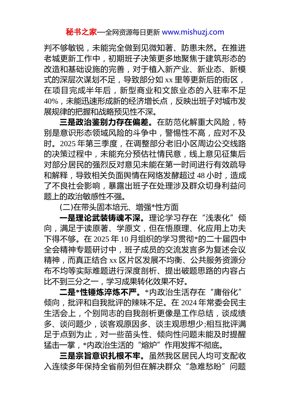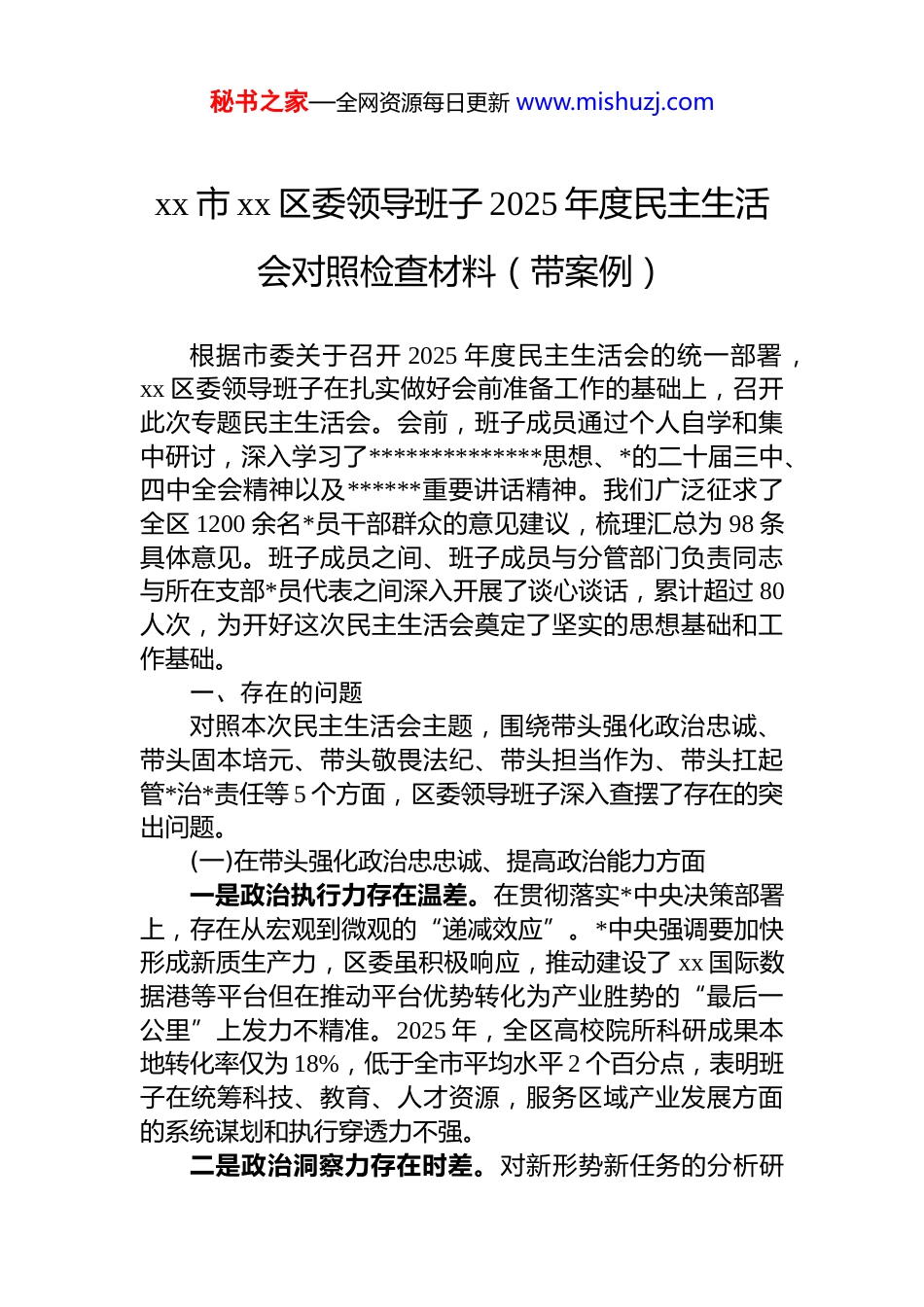 秘书之家—全网资源每日更新 www.mishuzj.comxx 市 xx 区委领导班子 2025 年度民主生活会对照检查材料(带案例)根据市委关于召开 2025 年度民主生活会的统一部署,xx 区委领导班子在扎实做好会前准备工作的基础上,召开此次专题民主生活会。会前,班子成员通过个人自学和集中研讨,深入学习了**************思想、*的二十届三中、四中全会精神以及******重要讲话精神。我们广泛征求了全区 1200 余名*员干部群众的意见建议,梳理汇总为 98 条具体意见。班子成员之间、班子成员与分管部门负责同志与所在支部*员代表之间深入开展了谈心谈话,累计超过 80人次,为开好这次民主生活会奠定了坚实的思想基础和工作基础。一、存在的问题对照本次民主生活会主题,围绕带头强化政治忠诚、带头固本培元、带头敬畏法纪、带头担当作为、带头扛起管*治*责任等 5 个方面,区委领导班子深入查摆了存在的突出问题。(一)在带头强化政治忠忠诚、提高政治能力方面一是政治执行力存在温差。在贯彻落实*中央决策部署上,存在从宏观到微观的“递减效应”。*中央强调要加快形成新质生产力,区委虽积极响应,推动建设了 xx 国际数据港等平台但在推动平台优势转化为产业胜势的“最后一公里”上发力不精准。2025 年,全区高校院所科研成果本地转化率仅为 18%,低于全市平均水平 2 个百分点,表明班子在统筹科技、教育、人才资源,服务区域产业发展方面的系统谋划和执行穿透力不强。二是政治洞察力存在时差。对新形势新任务的分析研秘书之家—全网资源每日更新 www.mishuzj.com判不够敏锐,未能完全做到见微知著、防患未然。在推进老城更新工作中,初期班子决策更多地聚焦于建筑形态的改造和基础设施的完善,对于植入新产业、新业态、新模式的深层次谋划不足,导致部分如 xx 里等更新后的街区,在项目完成半年后,新型商业和文旅业态的入驻率不足40%,未能迅速形成新的经济增长点,反映出班子对城市发展规律的把握和战略预见性不深。三是政治鉴别力存在偏差。在防范化解重大风险,特别是意识形态领域风险的斗争中,警惕性不高,应对不及时。2025 年第三季度,在调整部分老旧小区周边公交线路的决策过程中,未能充分预估社情民意,线上意见征集后对部分居民的强烈反对意见未能在第一时间进行有效疏导和解释,导致相关负面舆情在网络发酵超过 48 小时,造成了不良社会影响,暴露出班子在处理涉及群众切身利益问题上的政治敏感性不强。(二)在带头固本培元、增强*性方面一是理论武装铸魂不深。理论学习存在“浅表化”倾向,满足于读原著、学原文,但在悟原理、化应用上功夫下得不够。在 2025 年 10 月组织的学习贯彻*的二十届四中全会精神专题研讨中,班子成员的交流发言多为复述会议精神,而真正结合 xx 区片区发展不均衡、公共服务资源分布不均等实际难题进行深度剖析、提出破题思路的内容占比不到三分之一,学习成果转化效果不好。二是*性锤炼淬炼不严。*内政治生活存在“庸俗化”倾向,批评和自我批评的辣味不足。在 2024 年常委会民主生活会上,个别同志的自我剖析更像是工作总结,谈成绩多、谈问题少,谈客观原因多、谈主观思想少;相互批评满足于点到为止,对一些苗头性、倾向性问题未能及时提醒猛击一掌,*内政治生活的“熔炉”作用发挥不彻底。三是宗旨意识扎根不牢。虽然我区居民人均可支配收入连续多年保持全省前列但在解决群众“急难愁盼”问题秘书之家—全网资源每日更新 www.mishuzj.com的具体工作中,仍存在“重数据、轻感受”的现象。原计划 2025 年内新建的 5 个社区“银发助餐点”,因选址协调等问题延误至第四季度才全部投用,直接影响了超过 800 名高龄老人的日常就餐便利。这说明班子在践行以人民为中心的发展思想上,还缺乏“时时放心不下”的责任感。(三)在带头敬畏人民、敬畏组织、敬畏法纪方面一是深入基层联系群众不紧密。践行新时代*的群众路线不扎实,落实“四下基层”制度存在“选择性”和“形式化”问题。统计显示,2025 年班子成员人均下基层调研45 天,但其中超过 60%的时间用于参加预先安排的会议、座谈和检查,真正不打招呼、直插...