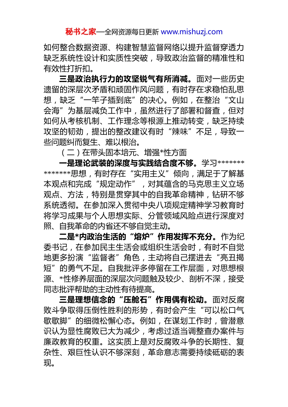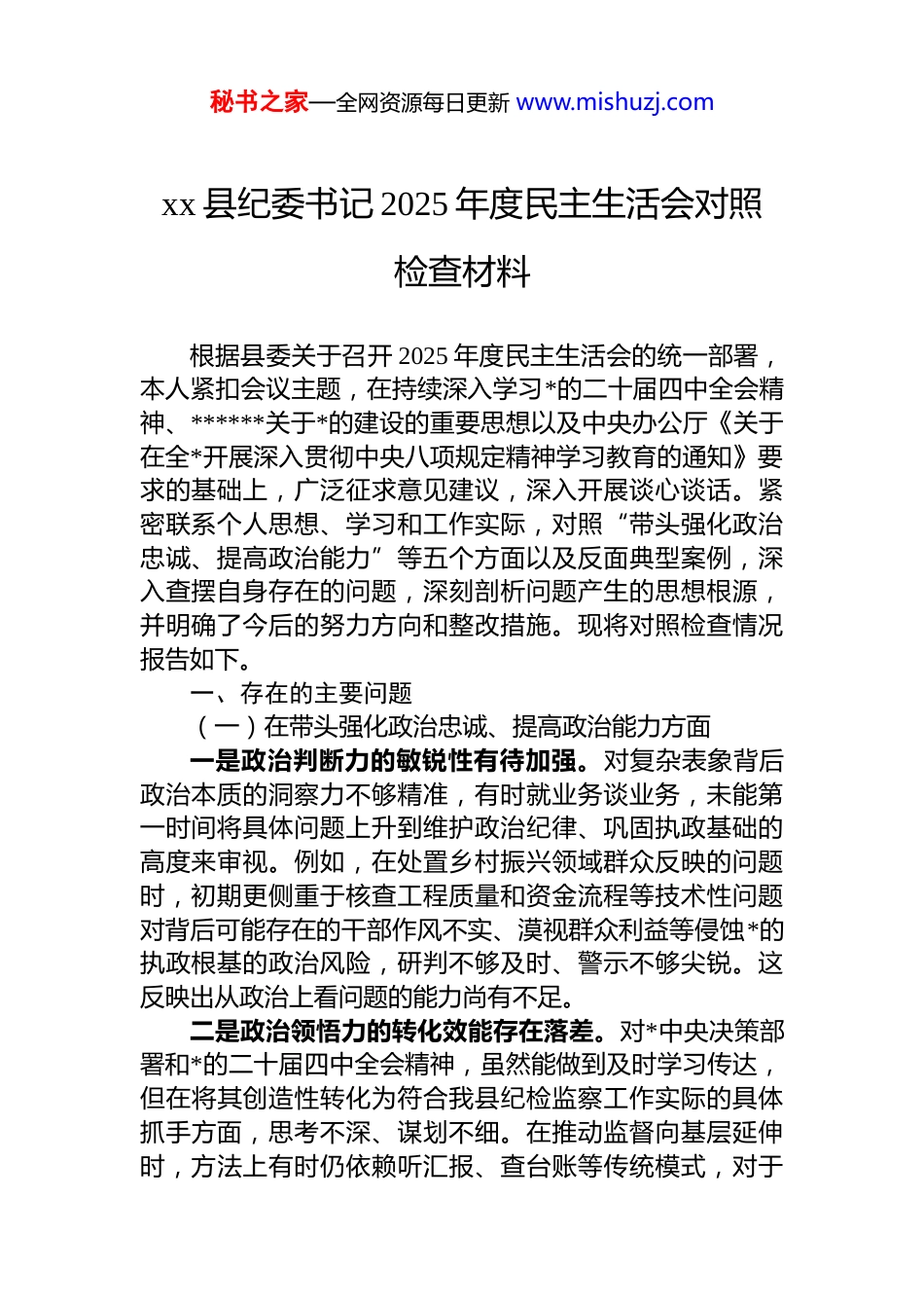 秘书之家—全网资源每日更新 www.mishuzj.comxx 县纪委书记 2025 年度民主生活会对照检查材料根据县委关于召开 2025 年度民主生活会的统一部署,本人紧扣会议主题,在持续深入学习*的二十届四中全会精神、******关于*的建设的重要思想以及中央办公厅《关于在全*开展深入贯彻中央八项规定精神学习教育的通知》要求的基础上,广泛征求意见建议,深入开展谈心谈话。紧密联系个人思想、学习和工作实际,对照“带头强化政治忠诚、提高政治能力”等五个方面以及反面典型案例,深入查摆自身存在的问题,深刻剖析问题产生的思想根源,并明确了今后的努力方向和整改措施。现将对照检查情况报告如下。一、存在的主要问题(一)在带头强化政治忠诚、提高政治能力方面一是政治判断力的敏锐性有待加强。对复杂表象背后政治本质的洞察力不够精准,有时就业务谈业务,未能第一时间将具体问题上升到维护政治纪律、巩固执政基础的高度来审视。例如,在处置乡村振兴领域群众反映的问题时,初期更侧重于核查工程质量和资金流程等技术性问题对背后可能存在的干部作风不实、漠视群众利益等侵蚀*的执政根基的政治风险,研判不够及时、警示不够尖锐。这反映出从政治上看问题的能力尚有不足。二是政治领悟力的转化效能存在落差。对*中央决策部署和*的二十届四中全会精神,虽然能做到及时学习传达,但在将其创造性转化为符合我县纪检监察工作实际的具体抓手方面,思考不深、谋划不细。在推动监督向基层延伸时,方法上有时仍依赖听汇报、查台账等传统模式,对于秘书之家—全网资源每日更新 www.mishuzj.com如何整合数据资源、构建智慧监督网络以提升监督穿透力缺乏系统性设计和实质性突破,导致政治监督的精准性和有效性打折扣。三是政治执行力的攻坚锐气有所消减。面对一些历史遗留的深层次矛盾和顽固作风问题,有时存在求稳怕乱思想,缺乏“一竿子插到底”的决心。例如,在整治“文山会海”为基层减负工作中,虽然进行了部署和督查,但对如何从考核机制、工作理念等根源上推动转变,缺乏持续攻坚的韧劲,提出的整改建议有时“辣味”不足,导致一些问题纠而复生、难以根治。(二)在带头固本培元、增强*性方面一是理论武装的深度与实践结合度不够。学习**************思想,有时存在“实用主义”倾向,满足于了解基本观点和完成“规定动作”,对其蕴含的马克思主义立场观点、方法,特别是贯穿其中的自我革命精神,钻研不够系统透彻。在参加深入贯彻中央八项规定精神学习教育时将学习成果与个人思想实际、分管领域风险点进行深度对照、自我革命的内省还不够自觉主动。二是*内政治生活的“熔炉”作用发挥不充分。作为纪委书记,在参加民主生活会或组织生活会时,有时不自觉地更多扮演“监督者”角色,主动将自己摆进去“亮丑揭短”的勇气不足。自我批评多停留在工作层面,对思想根源、*性修养层面的深层次问题触及较少、剖析不深,接受同志批评帮助的主动性有待提高。三是理想信念的“压舱石”作用偶有松动。面对反腐败斗争取得压倒性胜利的形势,有时会产生“可以松口气歇歇脚”的细微松懈心态。例如,在谋划工作时,曾潜意识认为显性腐败已大为减少,考虑过适当调整查办案件与廉政教育的权重。这实质上是对反腐败斗争的长期性、复杂性、艰巨性认识不够深刻,革命意志需要持续砥砺的表现。秘书之家—全网资源每日更新 www.mishuzj.com(三)在带头敬畏人民、敬畏组织、敬畏法纪方面一是践行群众路线不够扎实深入。“四下基层”制度落实中,有时存在“走形”多于“走心”的问题。下基层调研,与乡镇干部、*员代表座谈多,随机走访普通农户、倾听最原生态民声少,“坐在车里转、隔着玻璃看”的情况依然存在。这使得对群众“急难愁盼”的把握不够精准鲜活,监督工作未能完全植根于最深厚的群众土壤。二是执行组织程序的刚性偶有折扣。总体上能遵守组织原则,但在处理一些自认为非原则性、时效性强的事务时,有时为了“提高效率”而简化程序。例如,对干部进行提醒谈话,曾有过以电话沟通代替规范书面程序的情况这反映出对组织纪律、程序规范的敬畏之心在具体情境下有所弱化。三是运用法治思维履职的能力...
