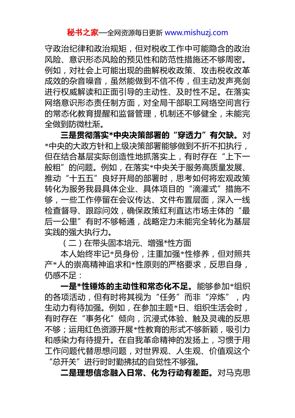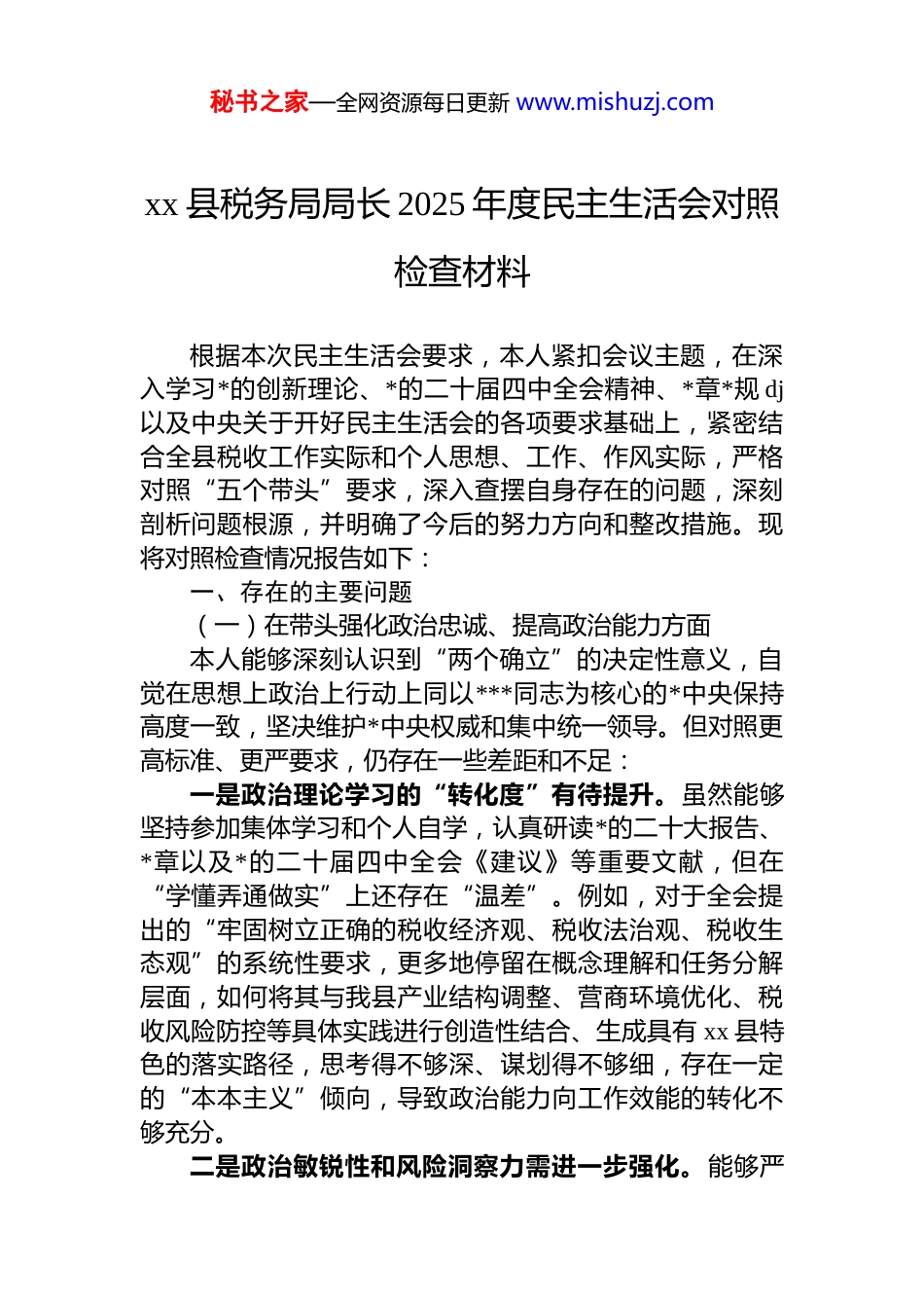 秘书之家—全网资源每日更新 www.mishuzj.comxx 县税务局局长 2025 年度民主生活会对照检查材料根据本次民主生活会要求,本人紧扣会议主题,在深入学习*的创新理论、*的二十届四中全会精神、*章*规 dj以及中央关于开好民主生活会的各项要求基础上,紧密结合全县税收工作实际和个人思想、工作、作风实际,严格对照“五个带头”要求,深入查摆自身存在的问题,深刻剖析问题根源,并明确了今后的努力方向和整改措施。现将对照检查情况报告如下:一、存在的主要问题(一)在带头强化政治忠诚、提高政治能力方面本人能够深刻认识到“两个确立”的决定性意义,自觉在思想上政治上行动上同以***同志为核心的*中央保持高度一致,坚决维护*中央权威和集中统一领导。但对照更高标准、更严要求,仍存在一些差距和不足:一是政治理论学习的“转化度”有待提升。虽然能够坚持参加集体学习和个人自学,认真研读*的二十大报告、*章以及*的二十届四中全会《建议》等重要文献,但在“学懂弄通做实”上还存在“温差”。例如,对于全会提出的“牢固树立正确的税收经济观、税收法治观、税收生态观”的系统性要求,更多地停留在概念理解和任务分解层面,如何将其与我县产业结构调整、营商环境优化、税收风险防控等具体实践进行创造性结合、生成具有 xx 县特色的落实路径,思考得不够深、谋划得不够细,存在一定的“本本主义”倾向,导致政治能力向工作效能的转化不够充分。二是政治敏锐性和风险洞察力需进一步强化。能够严秘书之家—全网资源每日更新 www.mishuzj.com守政治纪律和政治规矩,但对税收工作中可能隐含的政治风险、意识形态风险的预见性和防范性措施还不够周密。例如,对社会上可能出现的曲解税收政策、攻击税收改革成效的杂音噪音,虽然能做到不信不传,但主动发声亮剑进行权威解读和正面引导的主动性、及时性不足。在落实网络意识形态责任制方面,对全局干部职工网络空间言行的常态化教育提醒和监督管理,机制还不够健全,未能完全做到防微杜渐。三是贯彻落实*中央决策部署的“穿透力”有欠缺。对*中央的大政方针和上级决策部署能够做到不折不扣执行,但在结合基层实际创造性地抓落实上,有时存在“上下一般粗”的问题。例如,在落实*中央关于服务高质量发展、推动“十五五”良好开局的部署时,思考如何将宏观政策转化为服务我县具体企业、具体项目的“滴灌式”措施不够,一些工作停留在会议传达、文件布置层面,深入一线检查督导、跟踪问效,确保政策红利直达市场主体的“最后一公里”有时不够畅通,战略定力未能完全转化为基层实践的强大执行力。(二)在带头固本培元、增强*性方面本人始终牢记*员身份,注重加强*性修养,但对照共产*人的崇高精神追求和*性原则的严格要求,反思自身,仍感不足:一是*性锤炼的主动性和常态化不足。能够参加*组织的各项活动,但有时将其视为“任务”而非“淬炼”,内生动力有待加强。例如,在参加主题*日、组织生活会时,有时存在“事务化”倾向,沉浸式体验、触及灵魂的反思不够;运用红色资源开展*性教育的形式不够新颖,吸引力和感染力有待提升。在自我革命精神的发扬上,习惯于用工作问题代替思想问题,对世界观、人生观、价值观这个“总开关”进行时时勤拂拭的自觉性不够强。二是理想信念融入日常、化为行动有差距。对马克思秘书之家—全网资源每日更新 www.mishuzj.com主义基本原理和**************思想的世界观、方法论学习运用不够娴熟。在面对税收改革中的深层次矛盾、复杂征管难题时,有时首先从技术层面、操作层面寻求解决,未能始终自觉地从理想信念中汲取攻坚克难的力量。将坚定理想信念体现到对*忠诚、为纳税人缴费人服务的具体行动中,虽然能尽力而为,但距离“彻底”、“纯粹”的标准还有提升空间,艰苦奋斗、无私奉献的精神在新时代条件下如何更好彰显,思考和实践不足。三是道德品质修养的标杆立得不够高。能够遵守社会公德、职业道德、家庭美德,注重个人品德,但有时对自身要求停留在“不违规”的底线上,向革命先辈、时代楷模看齐,追求“高线”的劲头有所松懈。在涵养为民情怀方面,虽然重视解决纳税人缴费人的“急难愁盼...