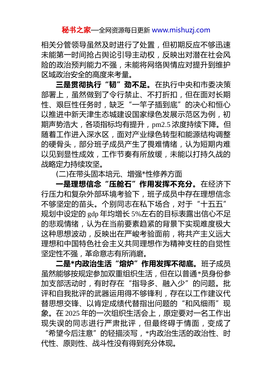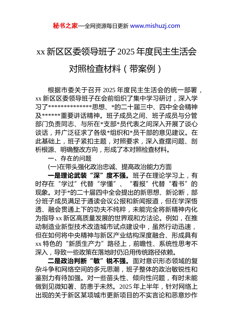 秘书之家—全网资源每日更新 www.mishuzj.comxx 新区区委领导班子 2025 年度民主生活会对照检查材料(带案例)根据市委关于召开 2025 年度民主生活会的统一部署,xx 新区区委领导班子在会前组织了集中学习研讨,深入学习了**************思想、*的二十届三中、四中全会精神及******重要讲话精神。班子成员之间、班子成员与分管部门负责同志、与所在*支部*员代表之间深入开展了谈心谈话,并广泛征求了各级*组织和*员干部的意见建议。在此基础上,班子紧扣主题,对照要求,深入查摆问题、剖析根源、明确整改方向,形成了本对照检查材料。一、存在的问题(一)在带头强化政治忠诚、提高政治能力方面一是理论武装“深”度不强。班子在理论学习上,有时存在“学过”代替“学懂”、“看报”代替“看书”的现象。对于*的二十届四中全会提出的新思想、新论断,部分班子成员满足于通读会议公报和新闻报道,但在学深悟透、融会贯通上下的功夫不纯粹,未能完全将新精神内化为指导 xx 新区高质量发展的世界观和方法论。例如,在推动制造业新型技术改造城市试点建设中,虽然行动迅速,但在如何将中央精神与新区产业结构深度融合、形成具有xx 特色的“新质生产力”路径上,前瞻性、系统性思考不深入,导致一些政策在落地时仍沿用传统路径依赖。二是政治判断“敏”锐不强。面对意识形态领域的复杂斗争和网络空间的多元思潮,班子整体的政治敏锐性和鉴别力有待加强。对一些苗头性、倾向性问题,有时未能做到见微知著、防患于未然。2025 年上半年,针对网络上出现的关于新区某项城市更新项目的不实言论和恶意炒作秘书之家—全网资源每日更新 www.mishuzj.com相关分管领导虽然及时进行了处置,但初期反应不够迅速未能第一时间抢占舆论引导主动权,反映出对潜在社会风险的政治预判能力不强,未能将网络舆情应对提升到维护区域政治安全的高度来考量。三是贯彻执行“韧”劲不足。在执行中央和市委决策部署上,虽然做到了令行禁止、不打折扣,但在面对长期性、艰巨性任务时,缺乏“一竿子插到底”的决心和恒心以推进中新天津生态城建设国家绿色发展示范区为例,初期声势浩大,各项指标均有提升,pm2.5 浓度持续下降。但随着工作进入深水区,面对产业绿色转型和能源结构调整的硬骨头,部分班子成员产生了畏难情绪,认为短期内难以见到显性成效,工作节奏有所放缓,未能以打持久战的战略定力持续攻坚。(二)在带头固本培元、增强*性修养方面一是理想信念“压舱石”作用发挥不充分。在经济下行压力和复杂外部环境考验下,班子成员中存在理想信念不够坚定的苗头。个别同志在私下场合,对于“十五五”规划中设定的 gdp 年均增长 5%左右的目标表露出信心不足的悲观情绪,认为在当前要素趋紧的背景下实现难度极大这种思想波动,反映出在严峻考验面前,将共产主义远大理想和中国特色社会主义共同理想作为精神支柱的自觉性坚定性不强,革命意志有所消磨。二是*内政治生活“熔炉”作用发挥不彻底。班子成员虽然能够按规定参加双重组织生活,但在以普通*员身份参加支部活动时,有时存在“指导多、融入少”的问题。批评和自我批评的武器运用得不够锋利,存在以工作建议代替思想交锋、以肯定成绩代替指出问题的“和风细雨”现象。在 2025 年的一次组织生活会上,原定要对一名工作出现失误的同志进行严肃批评,但最终碍于情面,变成了“希望今后注意”的轻描淡写,*内政治生活的政治性、时代性、原则性、战斗性没有得到充分体现。秘书之家—全网资源每日更新 www.mishuzj.com三是道德品行“正衣镜”作用发挥不经常。班子成员在工作圈、生活圈、社交圈中能够做到严于律己,但对照*章*规 dj 这面镜子,时常检视自身、净化灵魂的自觉性不强。对社会上的一些不良风气和错误思潮,有时未能旗帜鲜明地抵制和斗争。例如,对于一些企业家朋友在交往中表现出的奢靡享乐风气,有的同志虽未参与,但也没有及时提醒和批评,认为是“个人生活方式”,反映出在小事小节上涵养*性、砥砺品格的弦绷得不紧。(三)在带头敬畏人民、敬畏组织、敬畏法纪方面一是践行群众路线“鱼水情”联系不紧密。虽然坚持落实“四下基层”...