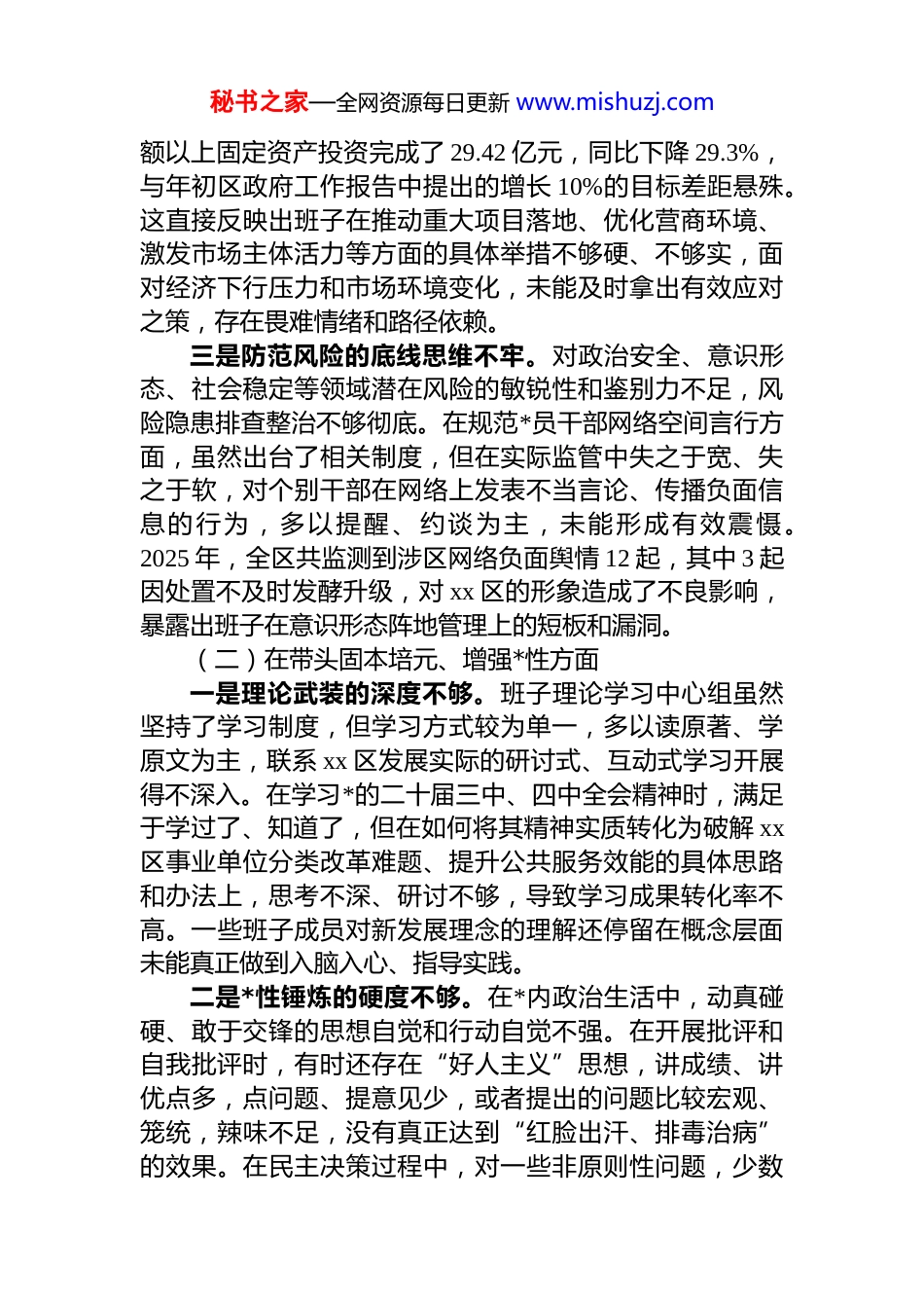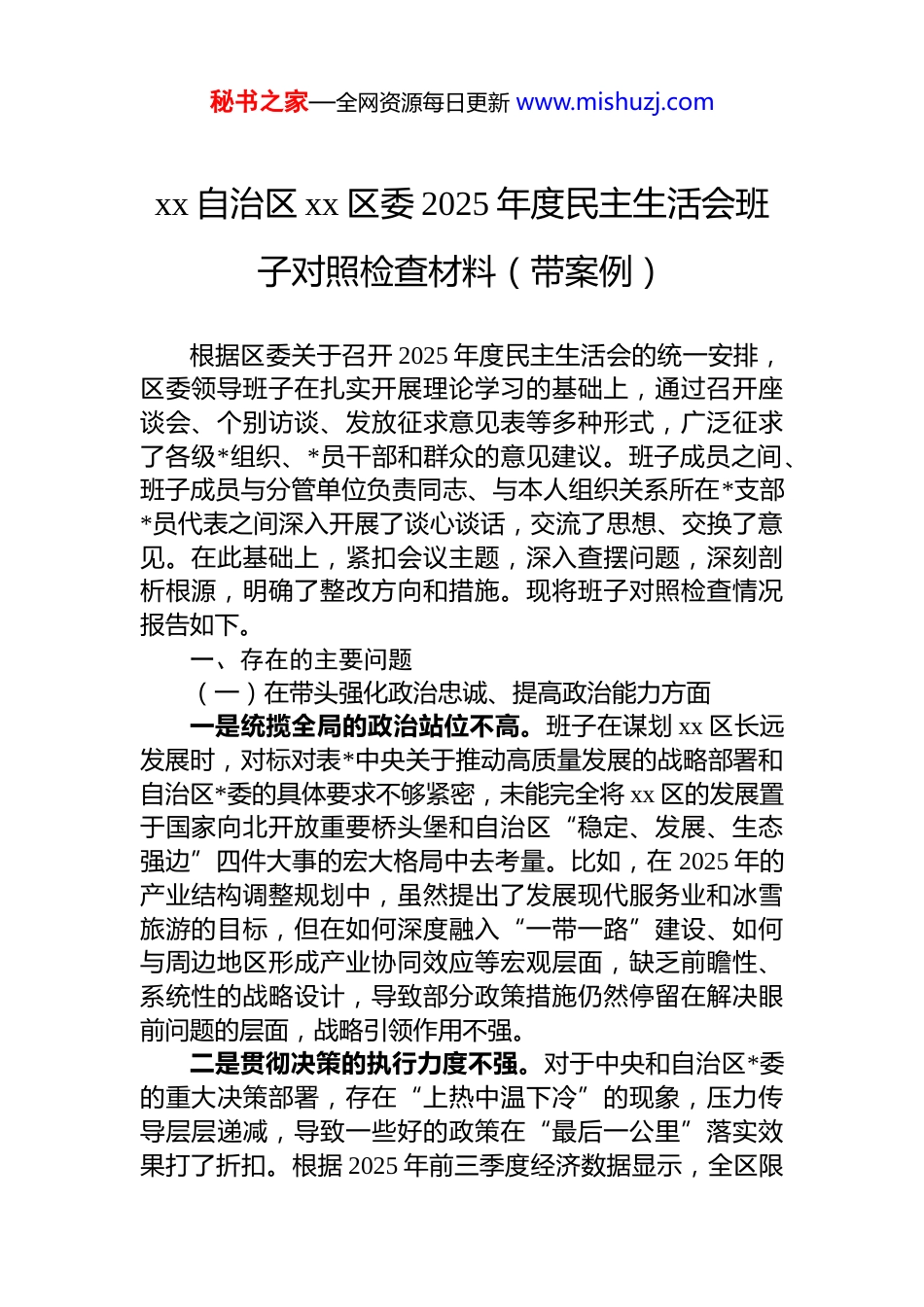 秘书之家—全网资源每日更新 www.mishuzj.comxx 自治区 xx 区委 2025 年度民主生活会班子对照检查材料(带案例)根据区委关于召开 2025 年度民主生活会的统一安排,区委领导班子在扎实开展理论学习的基础上,通过召开座谈会、个别访谈、发放征求意见表等多种形式,广泛征求了各级*组织、*员干部和群众的意见建议。班子成员之间、班子成员与分管单位负责同志、与本人组织关系所在*支部*员代表之间深入开展了谈心谈话,交流了思想、交换了意见。在此基础上,紧扣会议主题,深入查摆问题,深刻剖析根源,明确了整改方向和措施。现将班子对照检查情况报告如下。一、存在的主要问题(一)在带头强化政治忠诚、提高政治能力方面一是统揽全局的政治站位不高。班子在谋划 xx 区长远发展时,对标对表*中央关于推动高质量发展的战略部署和自治区*委的具体要求不够紧密,未能完全将 xx 区的发展置于国家向北开放重要桥头堡和自治区“稳定、发展、生态强边”四件大事的宏大格局中去考量。比如,在 2025 年的产业结构调整规划中,虽然提出了发展现代服务业和冰雪旅游的目标,但在如何深度融入“一带一路”建设、如何与周边地区形成产业协同效应等宏观层面,缺乏前瞻性、系统性的战略设计,导致部分政策措施仍然停留在解决眼前问题的层面,战略引领作用不强。二是贯彻决策的执行力度不强。对于中央和自治区*委的重大决策部署,存在“上热中温下冷”的现象,压力传导层层递减,导致一些好的政策在“最后一公里”落实效果打了折扣。根据 2025 年前三季度经济数据显示,全区限秘书之家—全网资源每日更新 www.mishuzj.com额以上固定资产投资完成了 29.42 亿元,同比下降 29.3%,与年初区政府工作报告中提出的增长 10%的目标差距悬殊。这直接反映出班子在推动重大项目落地、优化营商环境、激发市场主体活力等方面的具体举措不够硬、不够实,面对经济下行压力和市场环境变化,未能及时拿出有效应对之策,存在畏难情绪和路径依赖。三是防范风险的底线思维不牢。对政治安全、意识形态、社会稳定等领域潜在风险的敏锐性和鉴别力不足,风险隐患排查整治不够彻底。在规范*员干部网络空间言行方面,虽然出台了相关制度,但在实际监管中失之于宽、失之于软,对个别干部在网络上发表不当言论、传播负面信息的行为,多以提醒、约谈为主,未能形成有效震慑。2025 年,全区共监测到涉区网络负面舆情 12 起,其中 3 起因处置不及时发酵升级,对 xx 区的形象造成了不良影响,暴露出班子在意识形态阵地管理上的短板和漏洞。(二)在带头固本培元、增强*性方面一是理论武装的深度不够。班子理论学习中心组虽然坚持了学习制度,但学习方式较为单一,多以读原著、学原文为主,联系 xx 区发展实际的研讨式、互动式学习开展得不深入。在学习*的二十届三中、四中全会精神时,满足于学过了、知道了,但在如何将其精神实质转化为破解 xx区事业单位分类改革难题、提升公共服务效能的具体思路和办法上,思考不深、研讨不够,导致学习成果转化率不高。一些班子成员对新发展理念的理解还停留在概念层面未能真正做到入脑入心、指导实践。二是*性锤炼的硬度不够。在*内政治生活中,动真碰硬、敢于交锋的思想自觉和行动自觉不强。在开展批评和自我批评时,有时还存在“好人主义”思想,讲成绩、讲优点多,点问题、提意见少,或者提出的问题比较宏观、笼统,辣味不足,没有真正达到“红脸出汗、排毒治病”的效果。在民主决策过程中,对一些非原则性问题,少数秘书之家—全网资源每日更新 www.mishuzj.com班子成员为了维护班子团结,存在“随大流”心态,未能充分发表个人意见,影响了决策的科学性和民主性。三是理想信念的纯度不够。随着职务的提升和环境的变化,班子中个别同志艰苦奋斗、锐意进取的革命精神有所弱化,滋生了安于现状、求稳怕乱的思想。面对 xx 区经济总量偏小、产业发展存在短板的现实困境,有时会产生“等一等、看一看”的消极心态,缺乏“功成不必在我,功成必定有我”的境界和担当。在工作中,考虑个人得失权衡利弊的情况多了,主动为组织分忧、为群众解难的意识淡了,精神上...