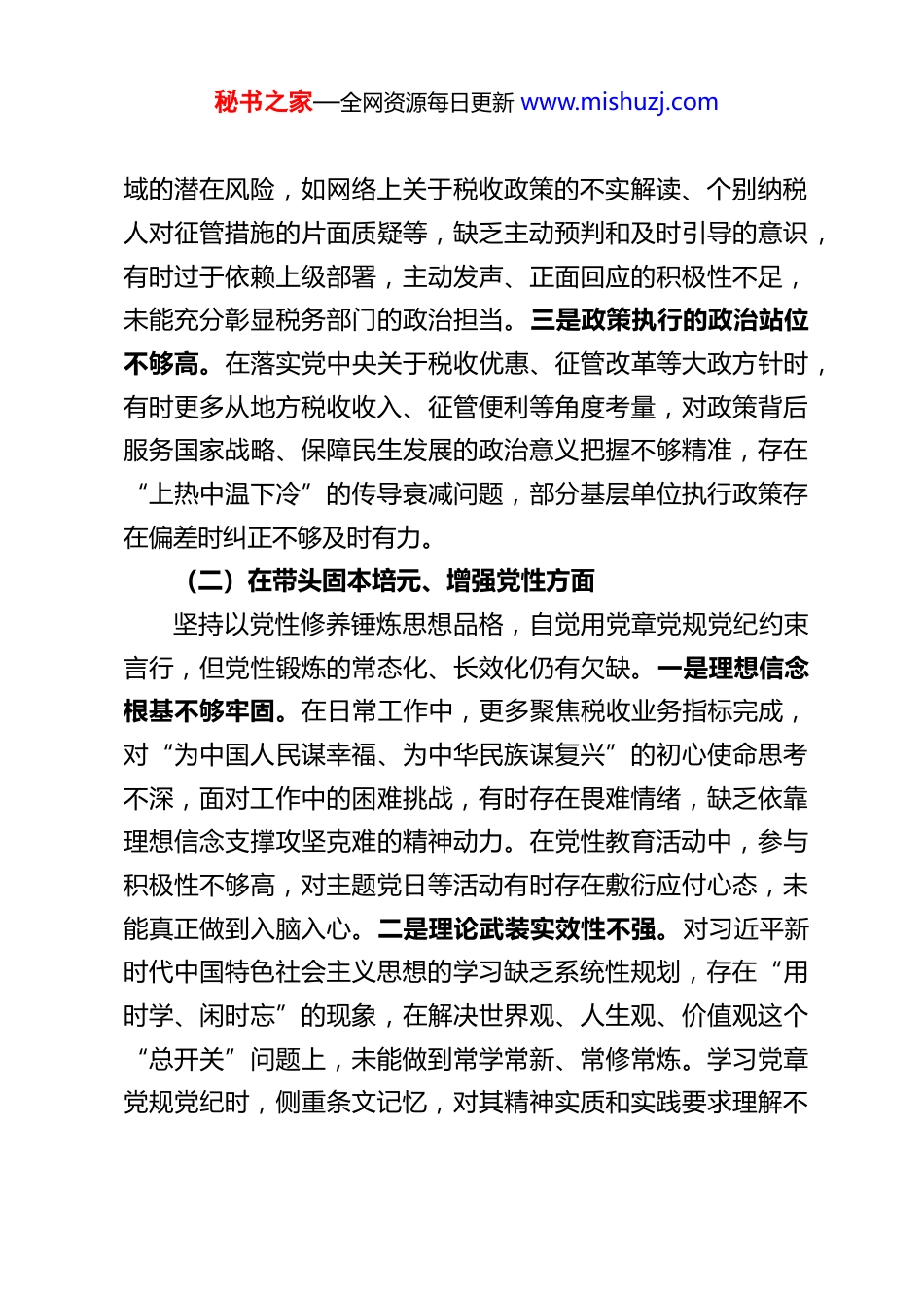 秘书之家—全网资源每日更新 www.mishuzj.comXX 市税务局局长 2025 年度民主生活会对照检查材料根据上级党组织关于召开 2025 年度民主生活会的统一部署和要求,我紧扣会议主题,深入学习贯彻习近平新时代中国特色社会主义思想,认真研读党的二十届四中全会精神及深入贯彻中央八项规定精神学习教育相关要求,对照“五个带头”标准,结合税收工作实际,通过自我查摆、群众提、同事帮等方式,全面梳理存在的问题,深刻剖析根源,明确整改方向。现将对照检查情况报告如下:一、存在的主要问题(一)在带头强化政治忠诚、提高政治能力方面始终把政治建设摆在首位,深刻领悟“两个确立”的决定性意义,自觉增强“四个意识”、坚定“四个自信”、做到“两个维护”,但对照更高标准仍存在短板。一是政治理论学习深度不足。对习近平新时代中国特色社会主义思想和党的二十届四中全会精神的学习,多停留在会议传达、文件通读层面,缺乏系统性钻研,与税收工作的结合点思考不深,未能完全将理论学习成果转化为谋划工作的政治思路和推动发展的具体举措。在深入贯彻中央八项规定精神学习教育中,侧重纪律条款的记忆,对作风建设背后的政治逻辑理解不透,导致学习与实践脱节。二是政治敏锐性有待加强。面对税收领域意识形态领秘书之家—全网资源每日更新 www.mishuzj.com域的潜在风险,如网络上关于税收政策的不实解读、个别纳税人对征管措施的片面质疑等,缺乏主动预判和及时引导的意识,有时过于依赖上级部署,主动发声、正面回应的积极性不足,未能充分彰显税务部门的政治担当。三是政策执行的政治站位不够高。在落实党中央关于税收优惠、征管改革等大政方针时,有时更多从地方税收收入、征管便利等角度考量,对政策背后服务国家战略、保障民生发展的政治意义把握不够精准,存在“上热中温下冷”的传导衰减问题,部分基层单位执行政策存在偏差时纠正不够及时有力。(二)在带头固本培元、增强党性方面坚持以党性修养锤炼思想品格,自觉用党章党规党纪约束言行,但党性锻炼的常态化、长效化仍有欠缺。一是理想信念根基不够牢固。在日常工作中,更多聚焦税收业务指标完成,对“为中国人民谋幸福、为中华民族谋复兴”的初心使命思考不深,面对工作中的困难挑战,有时存在畏难情绪,缺乏依靠理想信念支撑攻坚克难的精神动力。在党性教育活动中,参与积极性不够高,对主题党日等活动有时存在敷衍应付心态,未能真正做到入脑入心。二是理论武装实效性不强。对习近平新时代中国特色社会主义思想的学习缺乏系统性规划,存在“用时学、闲时忘”的现象,在解决世界观、人生观、价值观这个“总开关”问题上,未能做到常学常新、常修常炼。学习党章党规党纪时,侧重条文记忆,对其精神实质和实践要求理解不秘书之家—全网资源每日更新 www.mishuzj.com透彻,用党性原则正心明道、修身律己的自觉性不足。三是为民情怀树得不够牢。虽然强调税收服务民生,但在实际工作中,对纳税人缴费人的急难愁盼问题了解不够深入,有时坐在办公室听汇报多,深入企业、基层一线调研少,对中小企业办税过程中的痛点、难点问题回应不够及时,服务举措的针对性和实效性有待提升。(三)在带头敬畏人民、敬畏组织、敬畏法纪方面始终坚守敬畏之心,严守纪律规矩,但在细节把控和制度执行上仍存在薄弱环节。一是践行群众路线不够扎实。落实“四下基层”制度不够到位,调研存在“走马观花”现象,提前安排路线、预设发言对象的情况偶有发生,未能真正倾听基层税务干部和纳税人的真实声音。对群众反映强烈的办税流程繁琐、政策宣传不到位等问题,整改措施不够具体,推进力度不够大,导致部分问题反复出现。二是民主集中制执行不够严格。在班子议事决策中,有时存在“先表态、定调子”的倾向,对其他班子成员的意见建议听取不够充分,尤其是对专业性较强的问题,缺乏深入研讨。在重大税收事项决策前,征求基层单位和纳税人意见的范围不够广、方式不够灵活,存在决策科学性有待提升的问题。三是纪律敬畏意识存在松懈。虽然能够严守廉洁纪律,但对一些“小节”问题重视不够,如在公务接待中,有时存在超标准安排的苗头;对身边...