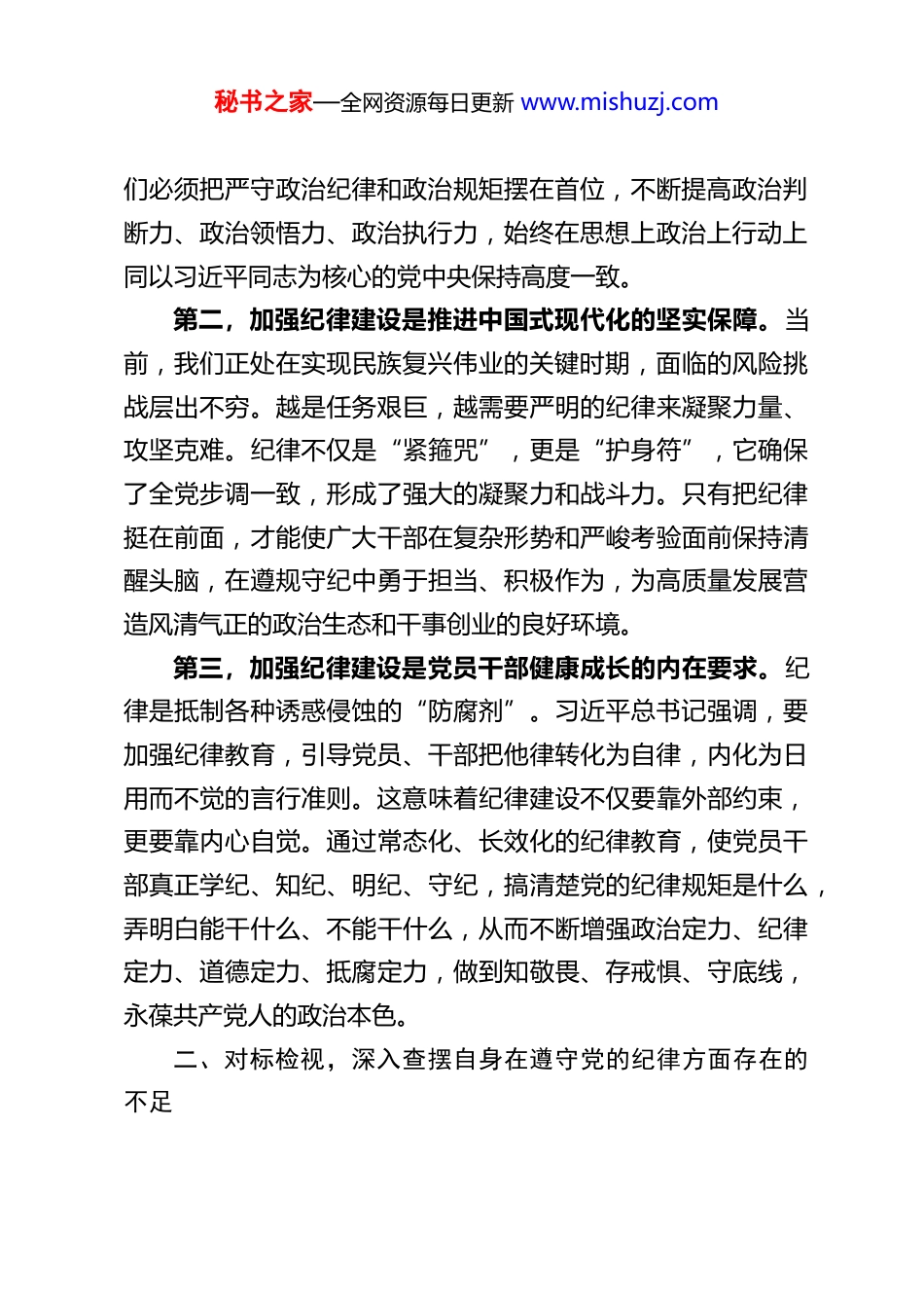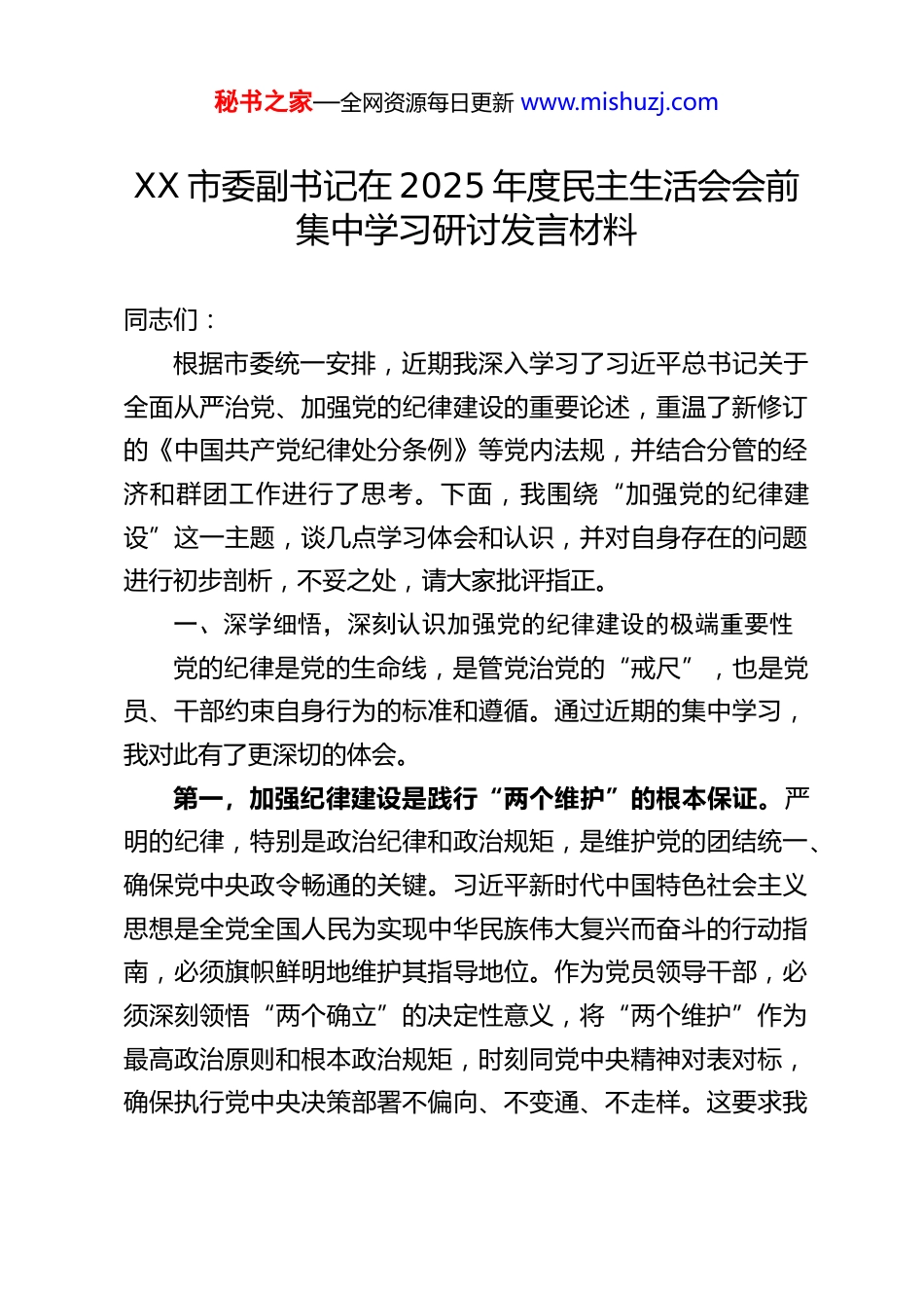 秘书之家—全网资源每日更新 www.mishuzj.comXX 市委副书记在 2025 年度民主生活会会前集中学习研讨发言材料同志们:根据市委统一安排,近期我深入学习了习近平总书记关于全面从严治党、加强党的纪律建设的重要论述,重温了新修订的《中国共产党纪律处分条例》等党内法规,并结合分管的经济和群团工作进行了思考。下面,我围绕“加强党的纪律建设”这一主题,谈几点学习体会和认识,并对自身存在的问题进行初步剖析,不妥之处,请大家批评指正。一、深学细悟,深刻认识加强党的纪律建设的极端重要性党的纪律是党的生命线,是管党治党的“戒尺”,也是党员、干部约束自身行为的标准和遵循。通过近期的集中学习,我对此有了更深切的体会。第一,加强纪律建设是践行“两个维护”的根本保证。严明的纪律,特别是政治纪律和政治规矩,是维护党的团结统一、确保党中央政令畅通的关键。习近平新时代中国特色社会主义思想是全党全国人民为实现中华民族伟大复兴而奋斗的行动指南,必须旗帜鲜明地维护其指导地位。作为党员领导干部,必须深刻领悟“两个确立”的决定性意义,将“两个维护”作为最高政治原则和根本政治规矩,时刻同党中央精神对表对标,确保执行党中央决策部署不偏向、不变通、不走样。这要求我秘书之家—全网资源每日更新 www.mishuzj.com们必须把严守政治纪律和政治规矩摆在首位,不断提高政治判断力、政治领悟力、政治执行力,始终在思想上政治上行动上同以习近平同志为核心的党中央保持高度一致。第二,加强纪律建设是推进中国式现代化的坚实保障。当前,我们正处在实现民族复兴伟业的关键时期,面临的风险挑战层出不穷。越是任务艰巨,越需要严明的纪律来凝聚力量、攻坚克难。纪律不仅是“紧箍咒”,更是“护身符”,它确保了全党步调一致,形成了强大的凝聚力和战斗力。只有把纪律挺在前面,才能使广大干部在复杂形势和严峻考验面前保持清醒头脑,在遵规守纪中勇于担当、积极作为,为高质量发展营造风清气正的政治生态和干事创业的良好环境。第三,加强纪律建设是党员干部健康成长的内在要求。纪律是抵制各种诱惑侵蚀的“防腐剂”。习近平总书记强调,要加强纪律教育,引导党员、干部把他律转化为自律,内化为日用而不觉的言行准则。这意味着纪律建设不仅要靠外部约束,更要靠内心自觉。通过常态化、长效化的纪律教育,使党员干部真正学纪、知纪、明纪、守纪,搞清楚党的纪律规矩是什么,弄明白能干什么、不能干什么,从而不断增强政治定力、纪律定力、道德定力、抵腐定力,做到知敬畏、存戒惧、守底线,永葆共产党人的政治本色。二、对标检视,深入查摆自身在遵守党的纪律方面存在的不足秘书之家—全网资源每日更新 www.mishuzj.com按照这次民主生活会会前学习的要求,我坚持问题导向,对照党的“六项纪律”,认真查找了自身存在的差距和不足,主要有以下几点:一是在理论学习的深度和转化上还有差距。虽然能够坚持参加集体学习,但个人自学的主动性、系统性还不够强,有时满足于“读过了”“学过了”,对习近平新时代中国特色社会主义思想,特别是其中关于经济工作、群团工作、党的自我革命的重要论述,钻研得还不够透彻,未能完全做到融会贯通。比如,在运用党的创新理论指导分管领域破解深层次矛盾和问题上,思路还不够开阔,有时习惯于沿用老办法,将学习成果转化为推动高质量发展的具体思路和务实举措的成效还不够显著,存在“学用脱节”的现象。二是在严守政治纪律和政治规矩的敏锐性上还需提升。能够坚决维护党中央权威,但在面对一些复杂的经济社会现象时,有时未能第一时间从政治高度去审视其潜在风险和影响,政治洞察力和敏锐性有待进一步加强。在贯彻执行中央和省、市委决策部署时,虽然能做到不折不扣,但有时在结合本市实际创造性落实上思考不深,存在一定的“本本主义”倾向,未能完全做到既严守纪律又大胆探索。三是在发挥纪律建设的保障作用上仍有不足。作为分管经济和群团工作的副书记,在推动业务工作时,有时对纪律建设的保障性作用强调得多,但将其贯穿于工作全过程、各环节的秘书之家—全网资源每日更新 www.mishuzj.com力度还不够。例如,...