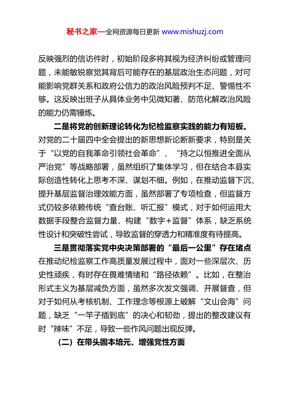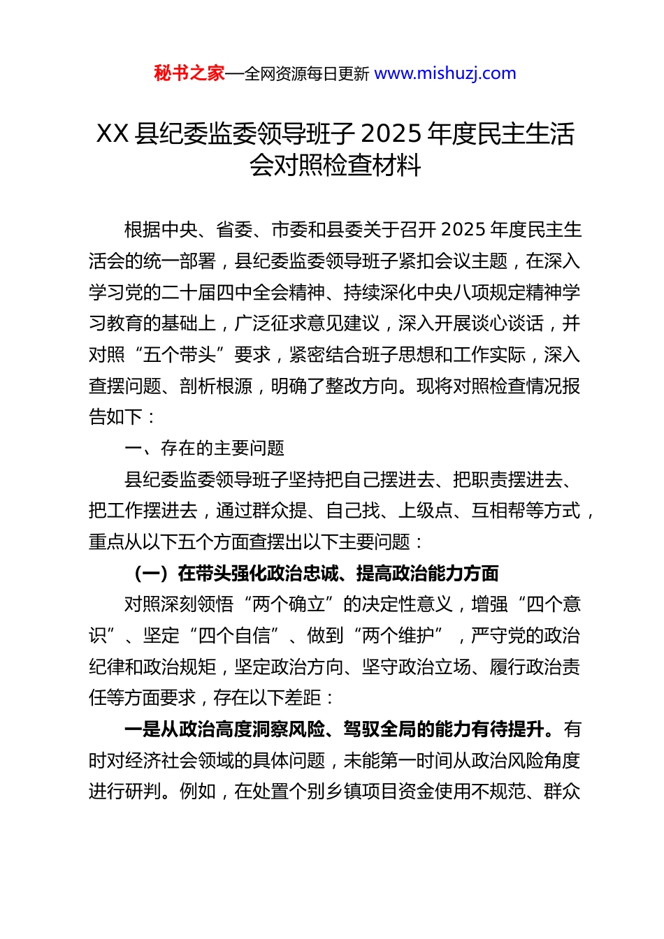 秘书之家—全网资源每日更新 www.mishuzj.comXX 县纪委监委领导班子 2025 年度民主生活会对照检查材料根据中央、省委、市委和县委关于召开 2025 年度民主生活会的统一部署,县纪委监委领导班子紧扣会议主题,在深入学习党的二十届四中全会精神、持续深化中央八项规定精神学习教育的基础上,广泛征求意见建议,深入开展谈心谈话,并对照“五个带头”要求,紧密结合班子思想和工作实际,深入查摆问题、剖析根源,明确了整改方向。现将对照检查情况报告如下:一、存在的主要问题县纪委监委领导班子坚持把自己摆进去、把职责摆进去、把工作摆进去,通过群众提、自己找、上级点、互相帮等方式,重点从以下五个方面查摆出以下主要问题:(一)在带头强化政治忠诚、提高政治能力方面对照深刻领悟“两个确立”的决定性意义,增强“四个意识”、坚定“四个自信”、做到“两个维护”,严守党的政治纪律和政治规矩,坚定政治方向、坚守政治立场、履行政治责任等方面要求,存在以下差距:一是从政治高度洞察风险、驾驭全局的能力有待提升。有时对经济社会领域的具体问题,未能第一时间从政治风险角度进行研判。例如,在处置个别乡镇项目资金使用不规范、群众秘书之家—全网资源每日更新 www.mishuzj.com反映强烈的信访件时,初始阶段多将其视为经济纠纷或管理问题,未能敏锐察觉其背后可能存在的基层政治生态问题,对可能影响党群关系和政府公信力的政治风险预判不足、警惕性不够。这反映出班子从具体业务中见微知著、防范化解政治风险的能力仍需锤炼。二是将党的创新理论转化为纪检监察实践的能力有短板。对党的二十届四中全会提出的新思想新论断新要求,特别是关于“以党的自我革命引领社会革命”、“持之以恒推进全面从严治党”等战略部署,虽然组织了集体学习,但在结合本县实际创造性转化上思考不深、谋划不细。例如,在推动监督下沉、提升基层监督治理效能方面,虽然部署了专项检查,但监督方式仍较多依赖传统“查台账、听汇报”模式,对于如何运用大数据手段整合监督力量、构建“数字+监督”体系,缺乏系统性设计和突破性尝试,导致监督的穿透力和精准度有待提高。三是贯彻落实党中央决策部署的“最后一公里”存在堵点在推动纪检监察工作高质量发展过程中,面对一些深层次、历史性顽疾,有时存在畏难情绪和“路径依赖”。比如,在整治形式主义为基层减负方面,虽然多次发文强调、开展督查,但对于如何从考核机制、工作理念等根源上破解“文山会海”问题,缺乏“一竿子插到底”的决心和韧劲,提出的整改建议有时“辣味”不足,导致一些作风问题出现反弹。(二)在带头固本培元、增强党性方面秘书之家—全网资源每日更新 www.mishuzj.com对照坚持把政治修养摆在首位,自觉以习近平新时代中国特色社会主义思想凝心铸魂,坚守共产党人精神追求,解决好世界观、人生观、价值观总开关问题等要求,存在以下不足:一是理论武装的深度和转化度不够。在学习上存在一定的“实用主义”倾向,对习近平新时代中国特色社会主义思想的学习,有时满足于完成“规定动作”,对其蕴含的马克思主义立场、观点、方法,特别是贯穿其中的自我革命精神,钻研得不够系统透彻。在今年的深入贯彻中央八项规定精神学习教育中,班子虽然带头参加研讨,但将学习成果与自身思想改造、分管领域风险防控紧密结合进行深度反思剖析不够,存在学用脱节现象。二是在严肃党内政治生活中锤炼党性的自觉性有待加强。班子在民主生活会、组织生活会上,有时不自觉地将自身定位为“监督者”,听取意见多,主动“揭短亮丑”、开展自我批评的深度和锐度不足。满足于谈工作层面的问题,对思想深处、党性层面的深层次问题,如理想信念的“压舱石”作用是否时刻牢固、革命意志在长期高压下有无松懈等,挖掘不够、触及不深。三是理想信念的“压舱石”作用有待持续加固。面对反腐败斗争取得压倒性胜利并全面巩固的形势,班子整体上虽然充满信心,但个别成员偶尔也会产生“歇歇脚、松口气”的念头。比如,在谋划年度工作时,曾有过“是否可适当降低案件查办秘书之家—全网资源每日更新 www.mishuzj.com考核权重、多搞些‘软性’廉政...