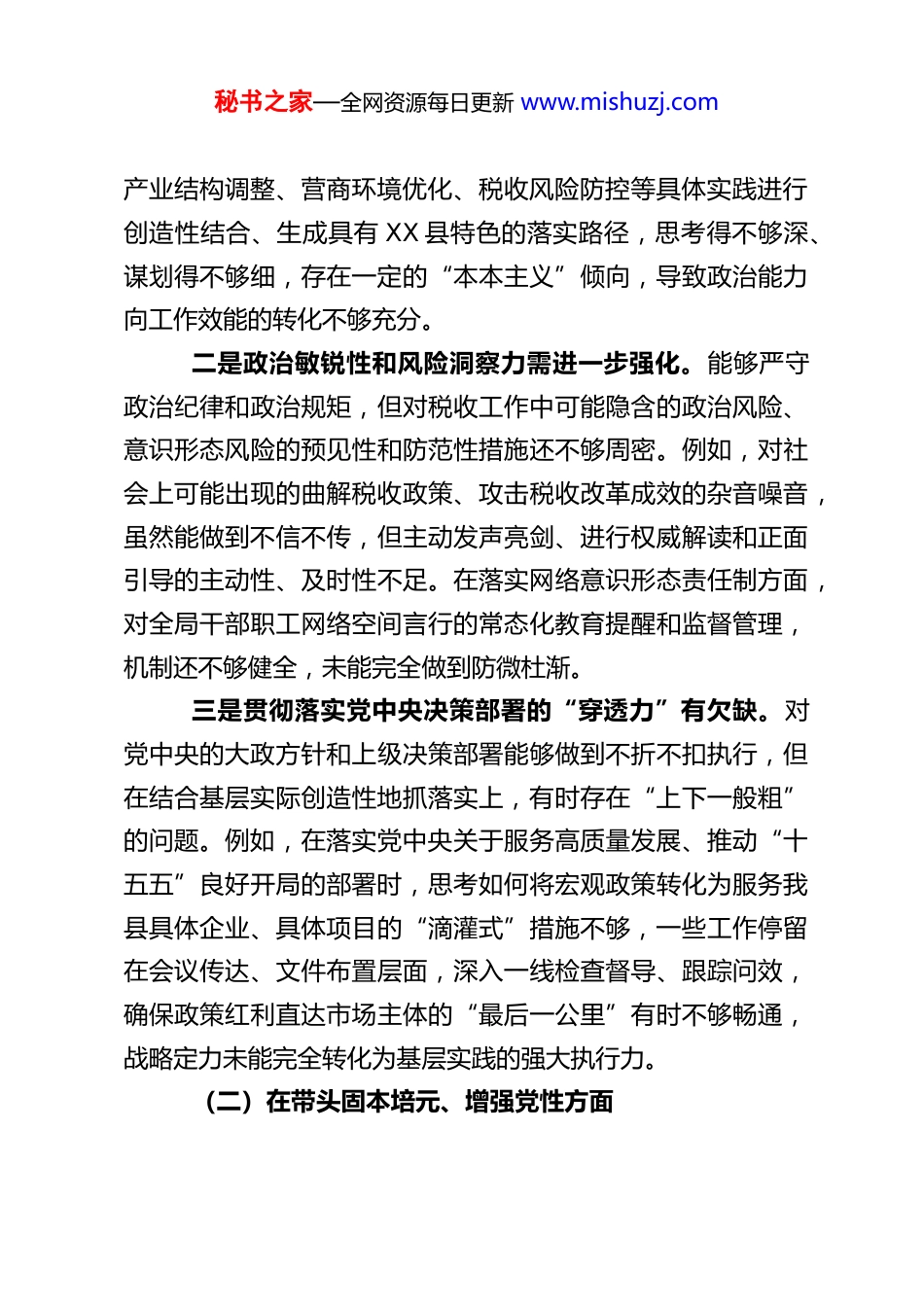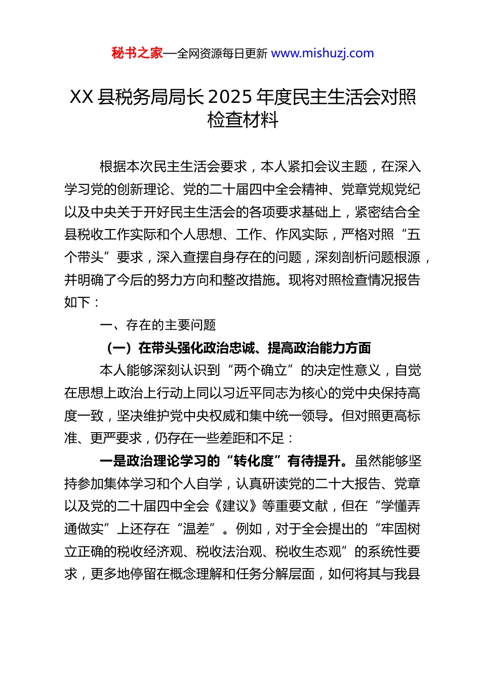 秘书之家—全网资源每日更新 www.mishuzj.comXX 县税务局局长 2025 年度民主生活会对照检查材料根据本次民主生活会要求,本人紧扣会议主题,在深入学习党的创新理论、党的二十届四中全会精神、党章党规党纪以及中央关于开好民主生活会的各项要求基础上,紧密结合全县税收工作实际和个人思想、工作、作风实际,严格对照“五个带头”要求,深入查摆自身存在的问题,深刻剖析问题根源,并明确了今后的努力方向和整改措施。现将对照检查情况报告如下:一、存在的主要问题(一)在带头强化政治忠诚、提高政治能力方面本人能够深刻认识到“两个确立”的决定性意义,自觉在思想上政治上行动上同以习近平同志为核心的党中央保持高度一致,坚决维护党中央权威和集中统一领导。但对照更高标准、更严要求,仍存在一些差距和不足:一是政治理论学习的“转化度”有待提升。虽然能够坚持参加集体学习和个人自学,认真研读党的二十大报告、党章以及党的二十届四中全会《建议》等重要文献,但在“学懂弄通做实”上还存在“温差”。例如,对于全会提出的“牢固树立正确的税收经济观、税收法治观、税收生态观”的系统性要求,更多地停留在概念理解和任务分解层面,如何将其与我县秘书之家—全网资源每日更新 www.mishuzj.com产业结构调整、营商环境优化、税收风险防控等具体实践进行创造性结合、生成具有 XX 县特色的落实路径,思考得不够深、谋划得不够细,存在一定的“本本主义”倾向,导致政治能力向工作效能的转化不够充分。二是政治敏锐性和风险洞察力需进一步强化。能够严守政治纪律和政治规矩,但对税收工作中可能隐含的政治风险、意识形态风险的预见性和防范性措施还不够周密。例如,对社会上可能出现的曲解税收政策、攻击税收改革成效的杂音噪音,虽然能做到不信不传,但主动发声亮剑、进行权威解读和正面引导的主动性、及时性不足。在落实网络意识形态责任制方面,对全局干部职工网络空间言行的常态化教育提醒和监督管理,机制还不够健全,未能完全做到防微杜渐。三是贯彻落实党中央决策部署的“穿透力”有欠缺。对党中央的大政方针和上级决策部署能够做到不折不扣执行,但在结合基层实际创造性地抓落实上,有时存在“上下一般粗”的问题。例如,在落实党中央关于服务高质量发展、推动“十五五”良好开局的部署时,思考如何将宏观政策转化为服务我县具体企业、具体项目的“滴灌式”措施不够,一些工作停留在会议传达、文件布置层面,深入一线检查督导、跟踪问效,确保政策红利直达市场主体的“最后一公里”有时不够畅通,战略定力未能完全转化为基层实践的强大执行力。(二)在带头固本培元、增强党性方面秘书之家—全网资源每日更新 www.mishuzj.com本人始终牢记党员身份,注重加强党性修养,但对照共产党人的崇高精神追求和党性原则的严格要求,反思自身,仍感不足:一是党性锤炼的主动性和常态化不足。能够参加党组织的各项活动,但有时将其视为“任务”而非“淬炼”,内生动力有待加强。例如,在参加主题党日、组织生活会时,有时存在“事务化”倾向,沉浸式体验、触及灵魂的反思不够;运用红色资源开展党性教育的形式不够新颖,吸引力和感染力有待提升。在自我革命精神的发扬上,习惯于用工作问题代替思想问题,对世界观、人生观、价值观这个“总开关”进行时时勤拂拭的自觉性不够强。二是理想信念融入日常、化为行动有差距。对马克思主义基本原理和习近平新时代中国特色社会主义思想的世界观、方法论学习运用不够娴熟。在面对税收改革中的深层次矛盾、复杂征管难题时,有时首先从技术层面、操作层面寻求解决,未能始终自觉地从理想信念中汲取攻坚克难的力量。将坚定理想信念体现到对党忠诚、为纳税人缴费人服务的具体行动中,虽然能尽力而为,但距离“彻底”、“纯粹”的标准还有提升空间,艰苦奋斗、无私奉献的精神在新时代条件下如何更好彰显,思考和实践不足。三是道德品质修养的标杆立得不够高。能够遵守社会公德、职业道德、家庭美德,注重个人品德,但有时对自身要求秘书之家—全网资源每日更新 www.mishuzj.com停留在“不违规”的底线上,向革命先辈、时代楷模看齐,...