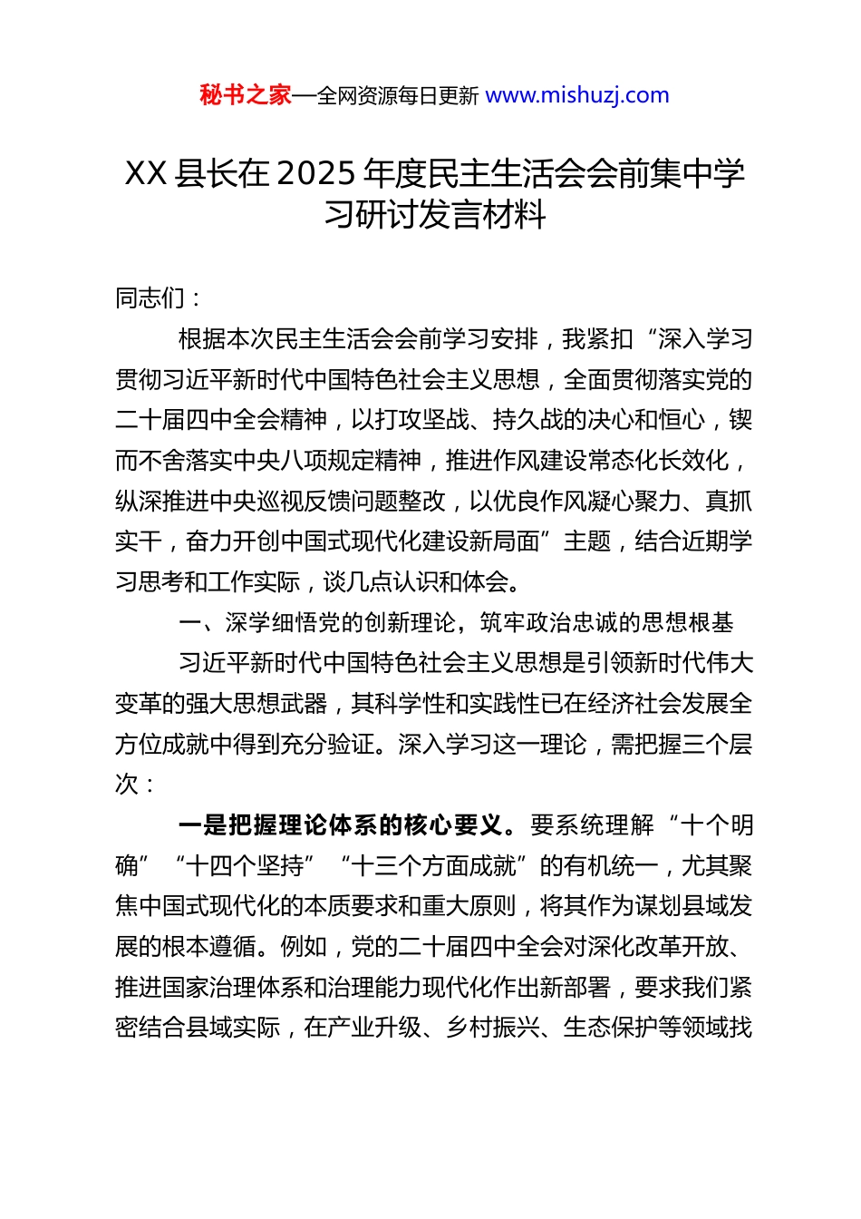 秘书之家—全网资源每日更新 www.mishuzj.comXX 县长在 2025 年度民主生活会会前集中学习研讨发言材料同志们:根据本次民主生活会会前学习安排,我紧扣“深入学习贯彻习近平新时代中国特色社会主义思想,全面贯彻落实党的二十届四中全会精神,以打攻坚战、持久战的决心和恒心,锲而不舍落实中央八项规定精神,推进作风建设常态化长效化,纵深推进中央巡视反馈问题整改,以优良作风凝心聚力、真抓实干,奋力开创中国式现代化建设新局面”主题,结合近期学习思考和工作实际,谈几点认识和体会。一、深学细悟党的创新理论,筑牢政治忠诚的思想根基习近平新时代中国特色社会主义思想是引领新时代伟大变革的强大思想武器,其科学性和实践性已在经济社会发展全方位成就中得到充分验证。深入学习这一理论,需把握三个层次:一是把握理论体系的核心要义。要系统理解“十个明确”“十四个坚持”“十三个方面成就”的有机统一,尤其聚焦中国式现代化的本质要求和重大原则,将其作为谋划县域发展的根本遵循。例如,党的二十届四中全会对深化改革开放、推进国家治理体系和治理能力现代化作出新部署,要求我们紧密结合县域实际,在产业升级、乡村振兴、生态保护等领域找秘书之家—全网资源每日更新 www.mishuzj.com准结合点,避免政策执行中的“温差”“偏差”。二是改进学习方法提升实效性。坚持“干部培训+读书班+现场教学”多元模式,用好“丰阳大讲堂”等平台,通过专家辅导、案例剖析增强理解深度。反对形式主义灌输,注重从党的最新理论成果中汲取破解经济发展难题、防范化解风险的新思路,如通过党建引领优化营商环境,激发市场主体活力。三是强化政治建设的实践导向。始终心怀“国之大者”,自觉同党中央要求对标对表,把坚定拥护“两个确立”、坚决做到“两个维护”融入履职全过程。例如,在推动“一都四区”示范县建设中,需经常检视政策是否贴合中央精神、群众是否真正受益,及时纠正执行中的时差、误差问题。二、以钉钉子精神落实中央八项规定,打好作风建设攻坚战持久战作风建设关系党的生死存亡,需以“永远在路上”的清醒和坚定,持续纠治“四风”顽疾。重点从三方面发力:一是紧盯关键领域深化整治。聚焦违规吃喝、公款消费、基层“微腐败”等问题,以刀刃向内的勇气破除作风积弊。例如,严格落实中央《关于集中整治违规吃喝的通知》要求,对“舌尖上的腐败”开展专项督查,坚决防止隐形变异、反弹回潮。同时,弘扬艰苦奋斗传统,压缩“三公”经费,把资源更多投向民生急需领域。二是健全常态化长效化机制。将作风建设融入日常管理,秘书之家—全网资源每日更新 www.mishuzj.com完善公务接待、公车使用等制度细则,强化审计监督和群众评议。例如,通过明察暗访、畅通举报渠道,形成监督合力;对反复出现的问题,从制度层面查找漏洞,推动“一案一整改”。三是激发干部担当作为内生动力。以落实中央八项规定精神为契机,推动干部深入一线调研,解决群众“急难愁盼”。例如,在项目建设、征地拆迁等重难点工作中,倡导“一线工作法”,杜绝“躺平”心态,把作风转变体现到攻坚克难实效上。三、纵深推进巡视整改,以自我革命勇气净化政治生态中央巡视反馈问题整改是必须完成的政治任务,需坚持标本兼治,做到“当下改”与“长久立”相结合:一是压实整改主体责任。建立“问题清单+任务清单+责任清单”台账,实行销号管理。主要领导需亲自部署、跟踪问效,例如对巡视指出的乡村振兴领域政策落实偏差,要深入剖析根源,明确整改时限和标准,确保真改实改。二是强化整改成果运用。把巡视整改与深化改革结合起来,如针对项目建设滞后问题,既优化审批流程,又完善绩效考核机制,形成“整改—提升—巩固”闭环。同时,公开整改情况,主动接受群众监督,避免“纸面整改”。三是深化全面从严治党。以巡视整改推动管党治党走向严紧硬,严格执行《中国共产党纪律处分条例》,加强对“一把手”和关键岗位干部的监督。通过警示教育、廉政谈话等方秘书之家—全网资源每日更新 www.mishuzj.com式,引导干部知敬畏、存戒惧、守底线。四、聚力中国式现代化县域实践,以实干实绩检验学习成效...