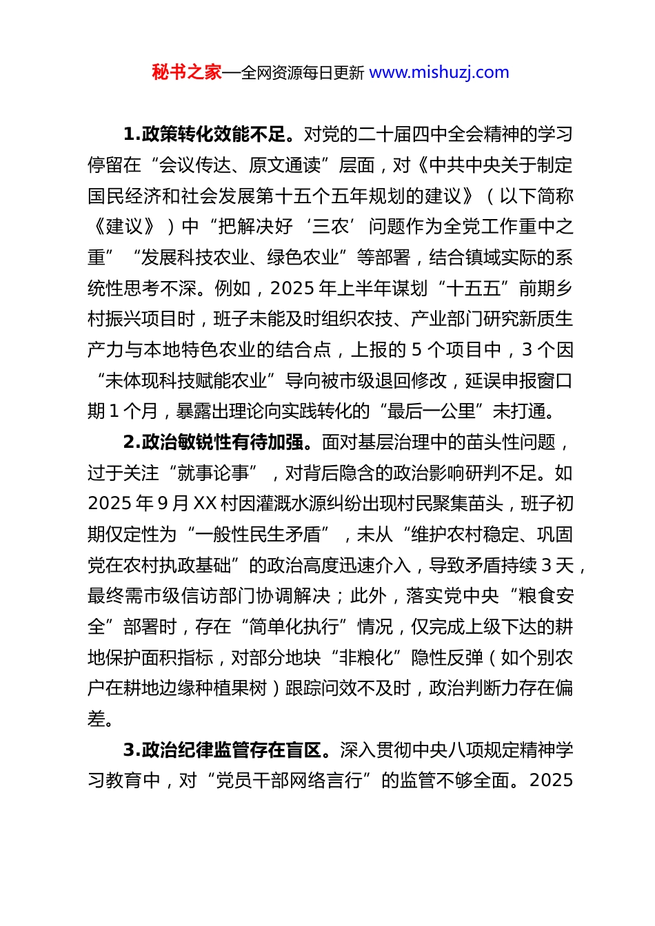 秘书之家—全网资源每日更新 www.mishuzj.comXX 乡镇党委班子 2025 年度民主生活会对照检查材料根据市委、市纪委、市委组织部关于开好 2025 年度民主生活会的统一部署要求,XX 乡镇党委班子紧扣“深入学习贯彻习近平新时代中国特色社会主义思想,全面贯彻落实党的二十届四中全会精神,扎实开展深入贯彻中央八项规定精神学习教育,带头强化政治忠诚、固本培元、敬畏人民、铸牢中华民族共同体意识、干事创业、管党治党”的会议主题,通过集体学习研讨、广泛征求意见(累计征求群众代表、村“两委”干部、企业负责人意见建议 43 条)、深入谈心谈话(班子成员间谈心谈话 28 人次,与基层党员群众谈话 65 人次),严格对照“六个带头”要求,全面查摆问题、深刻剖析根源、明确整改方向。现将对照检查情况报告如下:一、存在的问题党委班子坚持问题导向,对照党章党规党纪、党的二十届四中全会精神及中央八项规定精神学习教育“学查改”标准,深入查摆差距与不足,具体表现如下:(一)在带头强化政治忠诚、提高政治能力方面班子成员均能深刻领悟“两个确立”的决定性意义,增强“四个意识”、坚定“四个自信”、做到“两个维护”,但对照党的二十届四中全会精神,仍存在三方面短板:秘书之家—全网资源每日更新 www.mishuzj.com1.政策转化效能不足。对党的二十届四中全会精神的学习停留在“会议传达、原文通读”层面,对《中共中央关于制定国民经济和社会发展第十五个五年规划的建议》(以下简称《建议》)中“把解决好‘三农’问题作为全党工作重中之重”“发展科技农业、绿色农业”等部署,结合镇域实际的系统性思考不深。例如,2025 年上半年谋划“十五五”前期乡村振兴项目时,班子未能及时组织农技、产业部门研究新质生产力与本地特色农业的结合点,上报的 5 个项目中,3 个因“未体现科技赋能农业”导向被市级退回修改,延误申报窗口期 1 个月,暴露出理论向实践转化的“最后一公里”未打通。2.政治敏锐性有待加强。面对基层治理中的苗头性问题,过于关注“就事论事”,对背后隐含的政治影响研判不足。如2025 年 9 月 XX 村因灌溉水源纠纷出现村民聚集苗头,班子初期仅定性为“一般性民生矛盾”,未从“维护农村稳定、巩固党在农村执政基础”的政治高度迅速介入,导致矛盾持续 3 天,最终需市级信访部门协调解决;此外,落实党中央“粮食安全”部署时,存在“简单化执行”情况,仅完成上级下达的耕地保护面积指标,对部分地块“非粮化”隐性反弹(如个别农户在耕地边缘种植果树)跟踪问效不及时,政治判断力存在偏差。3.政治纪律监管存在盲区。深入贯彻中央八项规定精神学习教育中,对“党员干部网络言行”的监管不够全面。2025秘书之家—全网资源每日更新 www.mishuzj.com年 10 月党员干部网络行为排查中发现,2 名班子成员的亲属在社交媒体发布“乡镇项目推进慢”的负面言论,虽及时纠正,但反映出班子对“八小时之外”政治纪律的延伸监管不足;此外,部分班子成员在村级会议传达上级精神时,存在“照本宣科”现象,未结合村情解读政策背后的政治考量,导致村干部对“政策为何要落实”理解不深,政治执行力打折扣。(二)在带头固本培元、增强党性方面班子始终把政治修养摆在党性修养首位,但对照党的二十届四中全会“用习近平新时代中国特色社会主义思想凝心铸魂”要求及中央八项规定精神“锤炼党性作风”标准,常态化党性锤炼仍有欠缺:1.理论学习系统性不足。虽制定《2025 年党委理论学习中心组学习计划》,全年开展 XX 次专题学习(含 4 次党的二十届四中全会精神专题学习、3 次中央八项规定精神学习),但存在“用时学、闲时放”现象。例如,班子成员在 3-4 月春耕繁忙期,多以“工作简报代替学习笔记”,对《习近平关于加强党的作风建设论述摘编》的学习仅完成“通读”,未结合“如何解决农民春耕贷款难”等实际问题开展研讨;部分班子成员对“新发展理念”的学习停留在概念层面,对镇域“如何平衡生态保护(如禁养区管控)与农户增收”的思考不深,理想信念“总开关”拧得不够紧。2.党章党规党纪学习不扎实。学习以“集体学习为...