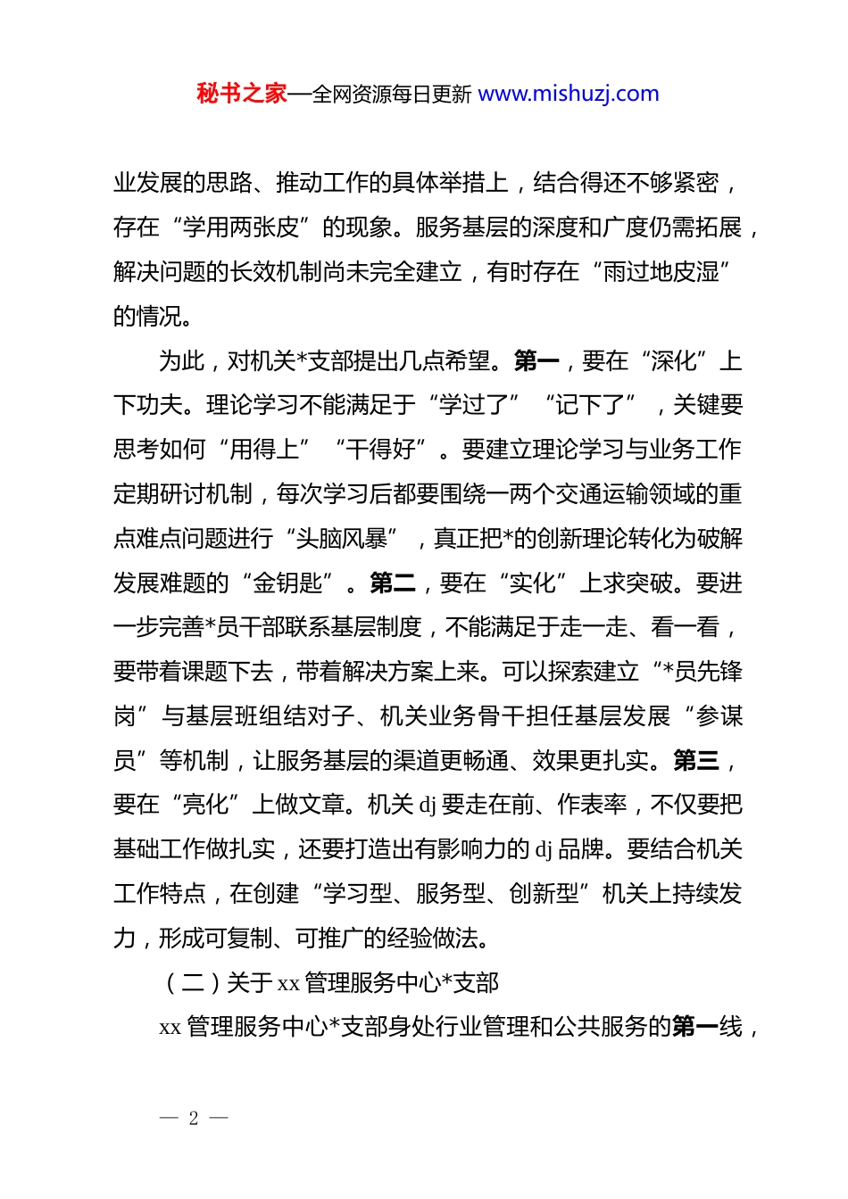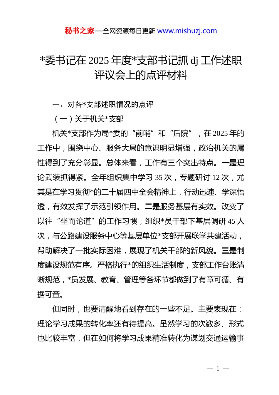 秘书之家—全网资源每日更新 www.mishuzj.com*委书记在 2025 年度*支部书记抓 dj 工作述职评议会上的点评材料一、对各*支部述职情况的点评(一)关于机关*支部机关*支部作为局*委的“前哨”和“后院”,在 2025 年的工作中,围绕中心、服务大局的意识明显增强,政治机关的属性得到了充分彰显。总体来看,工作有三个突出特点。一是理论武装抓得紧。全年组织集中学习 35 次,专题研讨 12 次,尤其是在学习贯彻*的二十届四中全会精神上,行动迅速、学深悟透,有效发挥了示范引领作用。二是服务基层有实效。改变了以往“坐而论道”的工作习惯,组织*员干部下基层调研 45 人次,与公路建设服务中心等基层单位*支部开展联学共建活动,帮助解决了一批实际困难,展现了机关干部的新风貌。三是制度建设规范有序。严格执行*的组织生活制度,支部工作台账清晰规范,*员发展、教育、管理等各环节都做到了有章可循、有据可查。但同时,也要清醒地看到存在的一些不足。主要表现在:理论学习成果的转化率还有待提高。虽然学习的次数多、形式也比较丰富,但在如何将学习成果精准转化为谋划交通运输事— 1 —秘书之家—全网资源每日更新 www.mishuzj.com业发展的思路、推动工作的具体举措上,结合得还不够紧密,存在“学用两张皮”的现象。服务基层的深度和广度仍需拓展,解决问题的长效机制尚未完全建立,有时存在“雨过地皮湿”的情况。为此,对机关*支部提出几点希望。第一,要在“深化”上下功夫。理论学习不能满足于“学过了”“记下了”,关键要思考如何“用得上”“干得好”。要建立理论学习与业务工作定期研讨机制,每次学习后都要围绕一两个交通运输领域的重点难点问题进行“头脑风暴”,真正把*的创新理论转化为破解发展难题的“金钥匙”。第二,要在“实化”上求突破。要进一步完善*员干部联系基层制度,不能满足于走一走、看一看,要带着课题下去,带着解决方案上来。可以探索建立“*员先锋岗”与基层班组结对子、机关业务骨干担任基层发展“参谋员”等机制,让服务基层的渠道更畅通、效果更扎实。第三,要在“亮化”上做文章。机关 dj 要走在前、作表率,不仅要把基础工作做扎实,还要打造出有影响力的 dj 品牌。要结合机关工作特点,在创建“学习型、服务型、创新型”机关上持续发力,形成可复制、可推广的经验做法。(二)关于 xx 管理服务中心*支部xx 管理服务中心*支部身处行业管理和公共服务的第一线,— 2 —秘书之家—全网资源每日更新 www.mishuzj.com直接面对广大企业和人民群众,工作任务繁重、责任重大。2025 年,中心*支部在 dj 引领业务发展方面取得了显著成绩。一是 dj 与业务融合度高。成功打造了“红色方向盘”dj 品牌,通过在客运枢纽、货运园区设立*员服务站,为司乘人员提供政策咨询、困难帮扶等服务,有效提升了行业的凝聚力和向心力。这种做法值得肯定和推广。二是在急难险重任务中作用突出。在应对夏季汛期道路运输保障、节假日高峰客流疏导等工作中,*员突击队始终冲锋在前,展现了强大的组织力和战斗力,确保了全市道路运输市场的平稳有序。三是服务创新有亮点。积极探索“dj+新业态”模式,主动联系网约车平台公司、物流平台企业,通过建立流动*员*小组等方式,将*的工作延伸到行业最活跃的神经末梢,破解了新业态领域 dj 工作难题。当然,工作中也还存在一些需要加强和改进的地方。比如,在提升全行业服务质量和安全管理水平方面,dj 的引领作用发挥还不够充分。对于一些长期存在的管理顽疾,如部分出租车服务不规范、货运市场恶性竞争等问题虽然采取了一些措施,但运用 dj 手段、发动*员力量去破解难题的思路和办法还不多。*员教育管理的方式方法有时还略显单一,对行业内流动*员的吸引力和影响力有待进一步增强。针对这些问题,我提几点要求。第一,要找准 dj 引领业务— 3 —秘书之家—全网资源每日更新 www.mishuzj.com的切入点。要将 dj 工作深度嵌入行业安全生产、服务质量提升、矛盾纠纷化解等关键环节。例如,可以在全行业广泛开展“*员安全承诺”“*员示范车组”等活动,把*员的先锋模范作用体现在保...