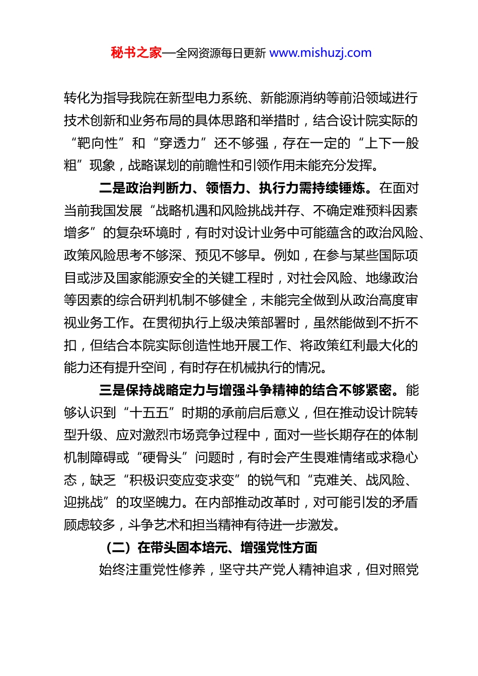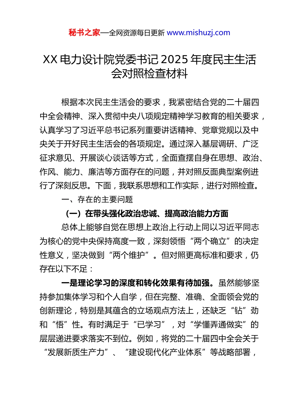 秘书之家—全网资源每日更新 www.mishuzj.comXX 电力设计院党委书记 2025 年度民主生活会对照检查材料根据本次民主生活会的要求,我紧密结合党的二十届四中全会精神、深入贯彻中央八项规定精神学习教育的相关要求,认真学习了习近平总书记系列重要讲话精神、党章党规以及中央关于开好民主生活会的各项规定。通过深入基层调研、广泛征求意见、开展谈心谈话等方式,全面查摆自身在思想、政治、作风、能力、廉洁等方面存在的问题,并对照反面典型案例进行了深刻反思。下面,我联系思想和工作实际,进行对照检查。一、存在的主要问题(一)在带头强化政治忠诚、提高政治能力方面总体上能够自觉在思想上政治上行动上同以习近平同志为核心的党中央保持高度一致,深刻领悟“两个确立”的决定性意义,坚决做到“两个维护”。但对照更高标准和要求,仍存在以下不足:一是理论学习的深度和转化效果有待加强。虽然能够坚持参加集体学习和个人自学,但在完整、准确、全面领会党的创新理论,特别是其蕴含的立场观点方法上,还缺乏“钻”劲和“悟”性。有时满足于“已学习”,对“学懂弄通做实”的层层递进要求落实不到位。例如,将党的二十届四中全会关于“发展新质生产力”、“建设现代化产业体系”等战略部署,秘书之家—全网资源每日更新 www.mishuzj.com转化为指导我院在新型电力系统、新能源消纳等前沿领域进行技术创新和业务布局的具体思路和举措时,结合设计院实际的“靶向性”和“穿透力”还不够强,存在一定的“上下一般粗”现象,战略谋划的前瞻性和引领作用未能充分发挥。二是政治判断力、领悟力、执行力需持续锤炼。在面对当前我国发展“战略机遇和风险挑战并存、不确定难预料因素增多”的复杂环境时,有时对设计业务中可能蕴含的政治风险、政策风险思考不够深、预见不够早。例如,在参与某些国际项目或涉及国家能源安全的关键工程时,对社会风险、地缘政治等因素的综合研判机制不够健全,未能完全做到从政治高度审视业务工作。在贯彻执行上级决策部署时,虽然能做到不折不扣,但结合本院实际创造性地开展工作、将政策红利最大化的能力还有提升空间,有时存在机械执行的情况。三是保持战略定力与增强斗争精神的结合不够紧密。能够认识到“十五五”时期的承前启后意义,但在推动设计院转型升级、应对激烈市场竞争过程中,面对一些长期存在的体制机制障碍或“硬骨头”问题时,有时会产生畏难情绪或求稳心态,缺乏“积极识变应变求变”的锐气和“克难关、战风险、迎挑战”的攻坚魄力。在内部推动改革时,对可能引发的矛盾顾虑较多,斗争艺术和担当精神有待进一步激发。(二)在带头固本培元、增强党性方面始终注重党性修养,坚守共产党人精神追求,但对照党秘书之家—全网资源每日更新 www.mishuzj.com章党规党纪的镜子和先进典型的高标,自我革命的精神还需强化。一是理想信念的“压舱石”作用有待进一步夯实。能够坚定马克思主义信仰和共产主义远大理想,但在应对繁重经营管理任务和现实挑战时,有时不自觉地把业务指标、经济效益摆在过于突出的位置,静下心来从世界观、人生观、价值观层面进行深刻自我反省、拧紧“总开关”的次数和深度不足。对照“不忘初心、牢记使命”的要求,那种为了党和人民事业矢志奋斗的纯粹激情和时时内省的自觉有所弱化,需要持续用习近平新时代中国特色社会主义思想凝心铸魂。二是党性原则修养的日常锤炼不够严格。虽然能够参加组织生活,但以普通党员身份自觉接受组织监督、主动进行党性分析的主动性还有欠缺。在运用批评与自我批评武器时,有时对自身问题“遮遮掩掩”,对同志问题“隔靴搔痒”,“红脸出汗”的效果打折扣。对照党章党规党纪进行自我检视的常态化机制坚持得不够好,在“正心明道、修身律己”上距离“吾日三省吾身”的境界还有差距。三是道德品质和革命精神的传承弘扬有提升空间。在传承党的光荣传统和优良作风方面,对年轻干部的言传身教、革命故事的宣传教育还可以更生动、更深入。面对社会上的一些不良风气和错误思潮,虽然能保持警惕,但主动发声亮剑、坚决抵制斗争的锐气尚显不足。在个人道德修养上,虽然能守住秘书之家—全...