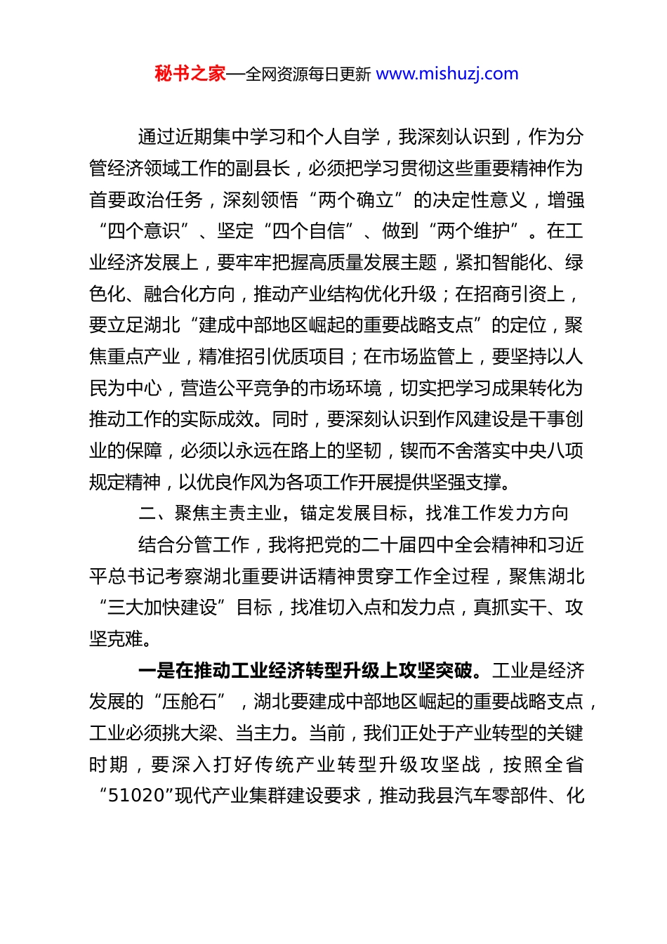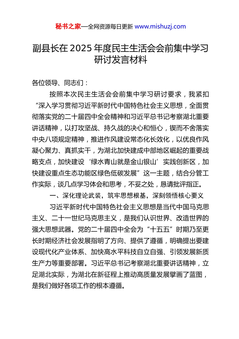 秘书之家—全网资源每日更新 www.mishuzj.com副县长在 2025 年度民主生活会会前集中学习研讨发言材料各位领导、同志们:按照本次民主生活会会前集中学习研讨要求,我紧扣“深入学习贯彻习近平新时代中国特色社会主义思想,全面贯彻落实党的二十届四中全会精神和习近平总书记考察湖北重要讲话精神,以打攻坚战、持久战的决心和恒心,锲而不舍落实中央八项规定精神,推进作风建设常态化长效化,以优良作风凝心聚力、真抓实干,为湖北加快建成中部地区崛起的重要战略支点,加快建设‘绿水青山就是金山银山’实践创新区,加快建设重点生态功能区绿色低碳发展”这一主题,结合分管工作实际,谈几点学习体会和思考,不妥之处,恳请批评指正。一、深化理论武装,筑牢思想根基,深刻领悟核心要义习近平新时代中国特色社会主义思想是当代中国马克思主义、二十一世纪马克思主义,是我们认识世界、改造世界的强大思想武器。党的二十届四中全会为“十五五”时期乃至更长时期经济社会发展指明了方向、提供了遵循,明确提出要建设现代化产业体系、加快高水平科技自立自强、引领发展新质生产力等重要部署。习近平总书记考察湖北重要讲话精神,立足湖北实际,为湖北在新征程上推动高质量发展擘画了蓝图,是我们做好各项工作的根本遵循。秘书之家—全网资源每日更新 www.mishuzj.com通过近期集中学习和个人自学,我深刻认识到,作为分管经济领域工作的副县长,必须把学习贯彻这些重要精神作为首要政治任务,深刻领悟“两个确立”的决定性意义,增强“四个意识”、坚定“四个自信”、做到“两个维护”。在工业经济发展上,要牢牢把握高质量发展主题,紧扣智能化、绿色化、融合化方向,推动产业结构优化升级;在招商引资上,要立足湖北“建成中部地区崛起的重要战略支点”的定位,聚焦重点产业,精准招引优质项目;在市场监管上,要坚持以人民为中心,营造公平竞争的市场环境,切实把学习成果转化为推动工作的实际成效。同时,要深刻认识到作风建设是干事创业的保障,必须以永远在路上的坚韧,锲而不舍落实中央八项规定精神,以优良作风为各项工作开展提供坚强支撑。二、聚焦主责主业,锚定发展目标,找准工作发力方向结合分管工作,我将把党的二十届四中全会精神和习近平总书记考察湖北重要讲话精神贯穿工作全过程,聚焦湖北“三大加快建设”目标,找准切入点和发力点,真抓实干、攻坚克难。一是在推动工业经济转型升级上攻坚突破。工业是经济发展的“压舱石”,湖北要建成中部地区崛起的重要战略支点,工业必须挑大梁、当主力。当前,我们正处于产业转型的关键时 期 , 要 深 入 打 好 传 统 产 业 转 型 升 级 攻 坚 战 , 按 照 全 省“51020”现代产业集群建设要求,推动我县汽车零部件、化秘书之家—全网资源每日更新 www.mishuzj.com工、轻工等传统产业进行技术改造和设备更新,提升产品附加值和市场竞争力。同时,要积极培育新兴产业,聚焦新能源、新材料、数字经济等领域,加大政策扶持力度,鼓励企业开展科技创新和关键核心技术攻关,催生新质生产力。尤其要紧扣绿色低碳发展要求,严格落实重点生态功能区建设相关规定,推动工业企业节能减排,推广清洁生产技术,实现生态保护与工业发展协同推进,让绿色成为工业高质量发展的鲜明底色。二是在提升招商引资实效上精准发力。招商引资是拉动经济增长、优化产业结构的重要抓手。我们要立足我县资源禀赋和产业基础,围绕主导产业和新兴产业,开展产业链招商、精准招商。一方面,要创新招商模式,积极对接长三角、珠三角等发达地区,主动承接产业转移,注重招引亿元以上重大项目和高新技术项目,力争形成“引进一个、带动一批、辐射一片”的集群效应。另一方面,要优化营商环境,落实好减税降费、要素保障等惠企政策,为企业提供“一站式”“保姆式”服务,解决企业落地、建设、生产中的实际困难,让企业留得住、发展好。同时,要坚守生态底线,严格项目准入标准,坚决杜绝高污染、高耗能项目,确保招商引资与“绿水青山就是金山银山”实践创新区建设要求相契合。三是在强化市场监管上守牢底线。市场监管事关民生福祉...