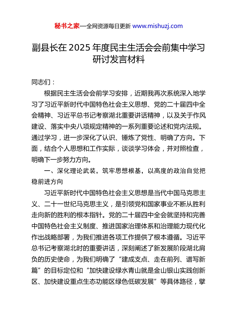 秘书之家—全网资源每日更新 www.mishuzj.com副县长在 2025 年度民主生活会会前集中学习研讨发言材料同志们:根据民主生活会会前学习安排,近期我再次系统深入地学习了习近平新时代中国特色社会主义思想、党的二十届四中全会精神、习近平总书记考察湖北重要讲话精神,以及关于作风建设、落实中央八项规定精神的一系列重要论述和党内法规。通过学习,进一步深化了认识、锤炼了党性、明确了方向。下面,结合个人思想和工作实际,谈谈学习体会,并对照检查,明确下一步努力方向。一、深化理论武装,筑牢思想根基,以高度的政治自觉把稳前进方向习近平新时代中国特色社会主义思想是当代中国马克思主义、二十一世纪马克思主义,是引领党和国家事业不断从胜利走向新的胜利的根本指针。党的二十届四中全会就坚持和完善中国特色社会主义制度、推进国家治理体系和治理能力现代化作出战略部署,为我们推进各项工作提供了根本遵循。习近平总书记考察湖北时的重要讲话,深刻阐述了新发展阶段湖北肩负的历史使命,为我们明确了“建成支点、走在前列、谱写新篇”的目标定位和“加快建设绿水青山就是金山银山实践创新区、加快建设重点生态功能区绿色低碳发展”等具体路径,擘秘书之家—全网资源每日更新 www.mishuzj.com画了湖北高质量发展的宏伟蓝图。通过深入学习,我深刻认识到:第一,必须始终把牢政治方向。深刻领悟“两个确立”的决定性意义,增强“四个意识”、坚定“四个自信”、做到“两个维护”,自觉在思想上政治上行动上同以习近平同志为核心的党中央保持高度一致。确保党中央的各项决策部署,省委、市委的工作要求和县委的工作安排,在我分管的工业经济、招商引资、市场监管等领域不折不扣落地生根。第二,必须始终坚持思想引领。习近平新时代中国特色社会主义思想蕴含的世界观、方法论是指导我们认识世界、改造世界的强大思想武器。必须坚持好、运用好贯穿其中的立场观点方法,特别是关于推动高质量发展、发展新质生产力、统筹发展和安全、促进人与自然和谐共生等重要论述,用以武装头脑、指导实践、推动工作。第三,必须始终心怀“国之大者”。自觉将分管工作置于党和国家事业发展全局、置于湖北“建成中部地区崛起重要战略支点”的大局中来谋划推进。深刻理解“绿水青山就是金山银山”的理念内涵,准确把握重点生态功能区绿色低碳发展的内在要求,处理好工业发展、项目引进与生态环境保护的关系,坚决不走先污染后治理的老路,积极探索生态优先、绿色崛起的新路。第四,必须始终坚持自我革命。作风建设永远在路上。中秘书之家—全网资源每日更新 www.mishuzj.com央八项规定是长期有效的铁规矩、硬杠杠。必须深刻认识作风问题的顽固性、反复性,以打攻坚战、持久战的决心和恒心,持续深化落实中央八项规定精神,驰而不息纠治“四风”,推进作风建设常态化长效化,营造风清气正、干事创业的良好政治生态。二、坚持问题导向,深入查摆剖析,以彻底的自我革命精神检视不足对照习近平新时代中国特色社会主义思想,对照党的二十届四中全会精神和习近平总书记对湖北工作的殷殷嘱托,对照党章党规党纪,对照初心使命和人民群众新期待,结合征求到的意见建议和个人反思,深感自身在思想、政治、作风、能力、廉洁等方面还存在一些差距和不足,主要表现在:(一)理论学习的系统性和转化运用有待加强。虽然能够坚持学习,但在深钻细研、融会贯通上还不够,特别是将党的创新理论中蕴含的立场观点方法,创造性地运用到破解我县工业经济结构不优、产业链韧性不强、科技创新驱动力不足等深层次矛盾上,思路还不够开阔,举措的创新性、针对性有待提升。运用理论指导“绿水青山就是金山银山”实践创新,推动生态工业、绿色招商的具体路径探索还需要深化。(二)贯彻落实的穿透力和精准度有待提升。在推动上级决策部署落实过程中,有时存在“上下一般粗”的现象,结合我县工业基础和资源禀赋进行精细化设计、差异化落实不够。秘书之家—全网资源每日更新 www.mishuzj.com例如,在落实“加快建设重点生态功能区绿色低碳发展”要求方面,虽然强调了环保门槛,但在系统性构建绿色制造体系、推动工...