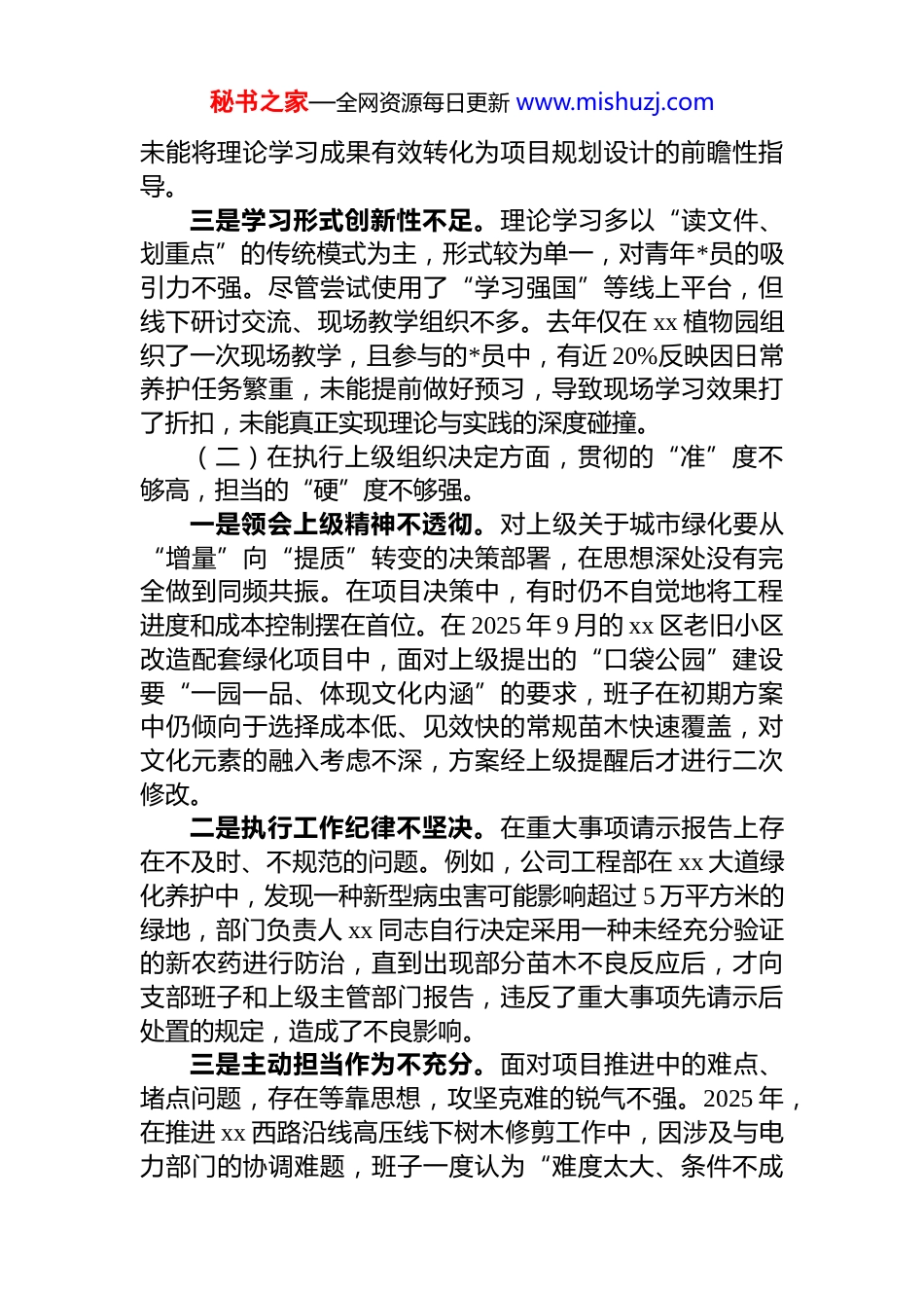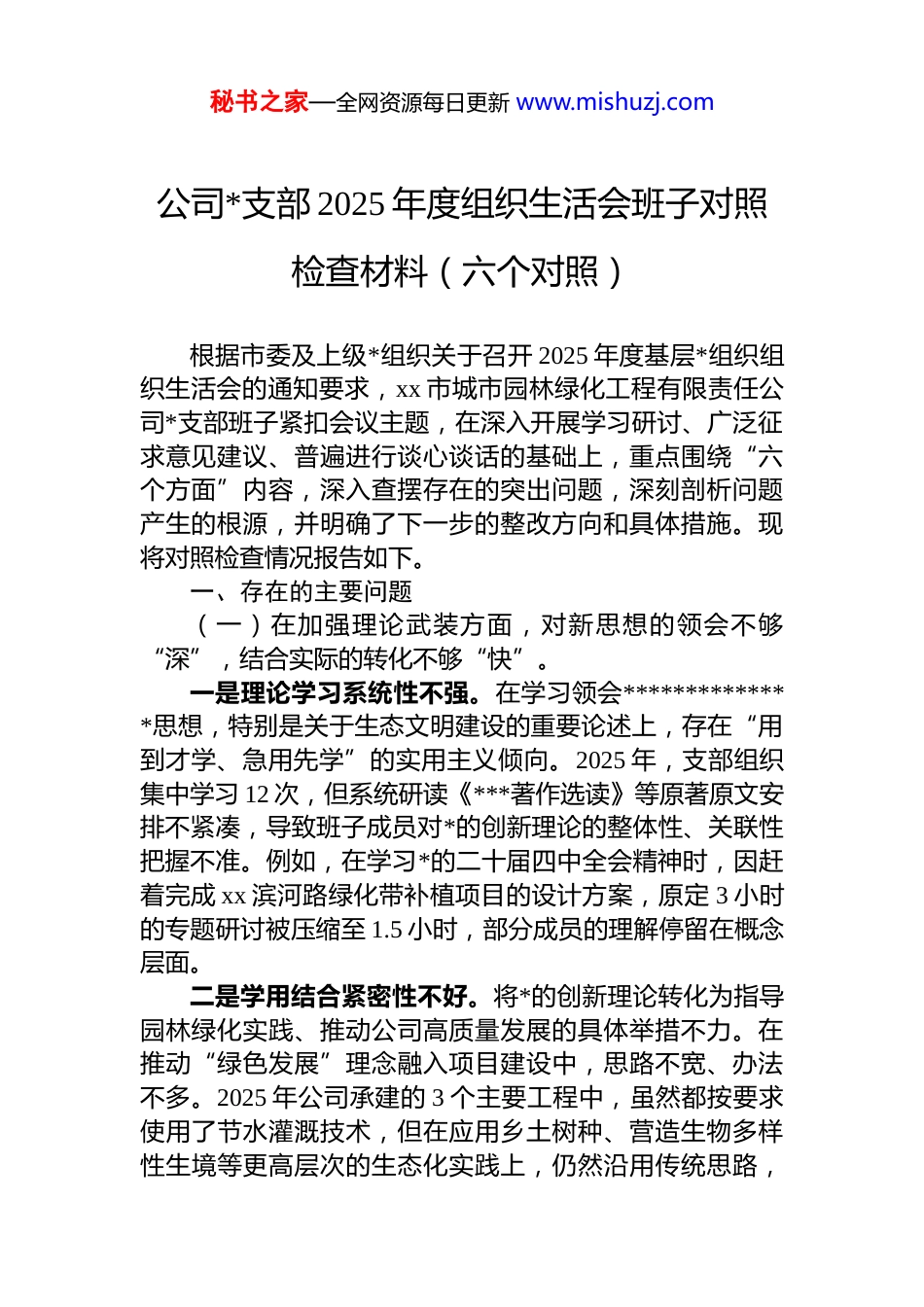 秘书之家—全网资源每日更新 www.mishuzj.com公司*支部 2025 年度组织生活会班子对照检查材料(六个对照)根据市委及上级*组织关于召开 2025 年度基层*组织组织生活会的通知要求,xx 市城市园林绿化工程有限责任公司*支部班子紧扣会议主题,在深入开展学习研讨、广泛征求意见建议、普遍进行谈心谈话的基础上,重点围绕“六个方面”内容,深入查摆存在的突出问题,深刻剖析问题产生的根源,并明确了下一步的整改方向和具体措施。现将对照检查情况报告如下。一、存在的主要问题(一)在加强理论武装方面,对新思想的领会不够“深”,结合实际的转化不够“快”。一是理论学习系统性不强。在学习领会**************思想,特别是关于生态文明建设的重要论述上,存在“用到才学、急用先学”的实用主义倾向。2025 年,支部组织集中学习 12 次,但系统研读《***著作选读》等原著原文安排不紧凑,导致班子成员对*的创新理论的整体性、关联性把握不准。例如,在学习*的二十届四中全会精神时,因赶着完成 xx 滨河路绿化带补植项目的设计方案,原定 3 小时的专题研讨被压缩至 1.5 小时,部分成员的理解停留在概念层面。二是学用结合紧密性不好。将*的创新理论转化为指导园林绿化实践、推动公司高质量发展的具体举措不力。在推动“绿色发展”理念融入项目建设中,思路不宽、办法不多。2025 年公司承建的 3 个主要工程中,虽然都按要求使用了节水灌溉技术,但在应用乡土树种、营造生物多样性生境等更高层次的生态化实践上,仍然沿用传统思路,秘书之家—全网资源每日更新 www.mishuzj.com未能将理论学习成果有效转化为项目规划设计的前瞻性指导。三是学习形式创新性不足。理论学习多以“读文件、划重点”的传统模式为主,形式较为单一,对青年*员的吸引力不强。尽管尝试使用了“学习强国”等线上平台,但线下研讨交流、现场教学组织不多。去年仅在 xx 植物园组织了一次现场教学,且参与的*员中,有近 20%反映因日常养护任务繁重,未能提前做好预习,导致现场学习效果打了折扣,未能真正实现理论与实践的深度碰撞。(二)在执行上级组织决定方面,贯彻的“准”度不够高,担当的“硬”度不够强。一是领会上级精神不透彻。对上级关于城市绿化要从“增量”向“提质”转变的决策部署,在思想深处没有完全做到同频共振。在项目决策中,有时仍不自觉地将工程进度和成本控制摆在首位。在 2025 年 9 月的 xx 区老旧小区改造配套绿化项目中,面对上级提出的“口袋公园”建设要“一园一品、体现文化内涵”的要求,班子在初期方案中仍倾向于选择成本低、见效快的常规苗木快速覆盖,对文化元素的融入考虑不深,方案经上级提醒后才进行二次修改。二是执行工作纪律不坚决。在重大事项请示报告上存在不及时、不规范的问题。例如,公司工程部在 xx 大道绿化养护中,发现一种新型病虫害可能影响超过 5 万平方米的绿地,部门负责人 xx 同志自行决定采用一种未经充分验证的新农药进行防治,直到出现部分苗木不良反应后,才向支部班子和上级主管部门报告,违反了重大事项先请示后处置的规定,造成了不良影响。三是主动担当作为不充分。面对项目推进中的难点、堵点问题,存在等靠思想,攻坚克难的锐气不强。2025 年,在推进 xx 西路沿线高压线下树木修剪工作中,因涉及与电力部门的协调难题,班子一度认为“难度太大、条件不成秘书之家—全网资源每日更新 www.mishuzj.com熟”,工作拖延了近两个月。最终在群众通过 12345 热线多次反映后,才下定决心集中力量予以解决,反映出在服务大局、主动破题方面的积极性创造性发挥不够。(三)在严格组织生活方面,执行制度的“严”度不够,开展批评的“辣”味不足。一是“三会一课”质量不高。存在以业务会议代替*支部会议的现象,*内政治生活的政治性、原则性体现不充分。2025 年第四季度的支部*员大会,原定议程是讨论预备*员转正和民主评议*员,但会议用近一半时间讨论了来年春季的苗木采购计划,导致核心议程时间紧张,*员评议环节未能充分展开,批评与自我批评变成了“希望与建议”,冲淡了组织生活的严肃性。二是谈心谈话覆盖不...