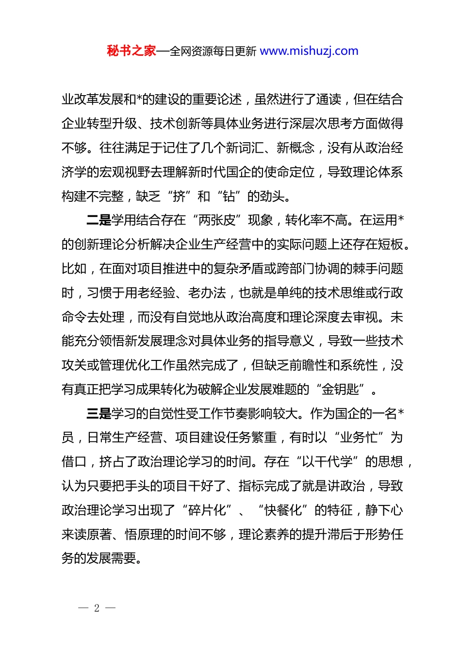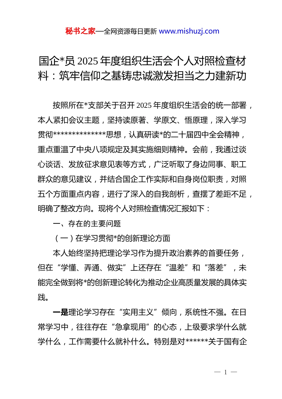 秘书之家—全网资源每日更新 www.mishuzj.com国企*员 2025 年度组织生活会个人对照检查材料:筑牢信仰之基铸忠诚激发担当之力建新功按照所在*支部关于召开 2025 年度组织生活会的统一部署,本人紧扣会议主题,坚持读原著、学原文、悟原理,深入学习贯彻**************思想,认真研读*的二十届四中全会精神,重点重温了中央八项规定及其实施细则精神。会前,我通过谈心谈话、发放征求意见表等方式,广泛听取了身边同事、职工群众的意见建议,并结合国企工作实际和自身岗位职责,对照五个方面重点内容,进行了深入的自我剖析,查摆了差距不足,明确了整改方向。现将个人对照检查情况汇报如下:一、存在的主要问题(一)在学习贯彻*的创新理论方面本人始终坚持把理论学习作为提升政治素养的首要任务,但在“学懂、弄通、做实”上还存在“温差”和“落差”,未能完全做到将*的创新理论转化为推动企业高质量发展的具体实践。一是理论学习存在“实用主义”倾向,系统性不强。在日常学习中,往往存在“急拿现用”的心态,上级要求学什么就学什么,工作需要什么就补什么。特别是对******关于国有企— 1 —秘书之家—全网资源每日更新 www.mishuzj.com业改革发展和*的建设的重要论述,虽然进行了通读,但在结合企业转型升级、技术创新等具体业务进行深层次思考方面做得不够。往往满足于记住了几个新词汇、新概念,没有从政治经济学的宏观视野去理解新时代国企的使命定位,导致理论体系构建不完整,缺乏“挤”和“钻”的劲头。二是学用结合存在“两张皮”现象,转化率不高。在运用*的创新理论分析解决企业生产经营中的实际问题上还存在短板。比如,在面对项目推进中的复杂矛盾或跨部门协调的棘手问题时,习惯于用老经验、老办法,也就是单纯的技术思维或行政命令去处理,而没有自觉地从政治高度和理论深度去审视。未能充分领悟新发展理念对具体业务的指导意义,导致一些技术攻关或管理优化工作虽然完成了,但缺乏前瞻性和系统性,没有真正把学习成果转化为破解企业发展难题的“金钥匙”。三是学习的自觉性受工作节奏影响较大。作为国企的一名*员,日常生产经营、项目建设任务繁重,有时以“业务忙”为借口,挤占了政治理论学习的时间。存在“以干代学”的思想,认为只要把手头的项目干好了、指标完成了就是讲政治,导致政治理论学习出现了“碎片化”、“快餐化”的特征,静下心来读原著、悟原理的时间不够,理论素养的提升滞后于形势任务的发展需要。— 2 —秘书之家—全网资源每日更新 www.mishuzj.com(二)在锤炼*性修养方面能够时刻牢记自己的第一身份是共产*员,但在*性锻炼的熔炉中,有时火候不够,对照*章*规 dj 的高标准严要求,自我革命的精神还不够彻底。一是政治敏锐性在具体业务中体现不够充分。在处理企业经济效益与社会责任的关系时,有时过分强调成本控制和利润指标,对政治账、长远账算得不够细。例如,在与合作方谈判或选择供应商时,更多关注对方的价格和技术参数,对对方的dj 情况、诚信记录等政治考察有时流于形式。在日常工作中,对一些看似不起眼的违规苗头,缺乏“见微知著”的警觉性,认为只要不违反原则底线就行,没有从维护国有资产安全和政治安全的高度去防微杜渐。二是斗争精神在维护原则时偶有“软化”。国企内部人际关系相对紧密,熟人多、老同事多。在*内政治生活中,开展批评与自我批评时,有时顾虑面子和团结,存在“老好人”思想。对于身边同事在工作作风上的一些小毛病,比如迟到早退、工作推诿等,往往睁一只眼闭一只眼,不愿意当面指出,怕伤了和气。在参与项目评审或业务决策时,如果自己的意见与多数人或领导意见不一致,有时为了“随大流”而选择了沉默,缺乏坚持原则、据理力争的勇气。— 3 —秘书之家—全网资源每日更新 www.mishuzj.com三是自我净化的标准有时出现松懈。随着工龄增长,有时会产生“歇一歇”的念头,对世界观、人生观、价值观的改造有所放松。在对照先进典型和优秀*员标准时,有时存在自我宽慰的心理,认为自己在国企一线摸爬滚打多年,没有功劳也有苦劳,对一些细小的生活作风问题不够重视。在慎独慎微方面做得...